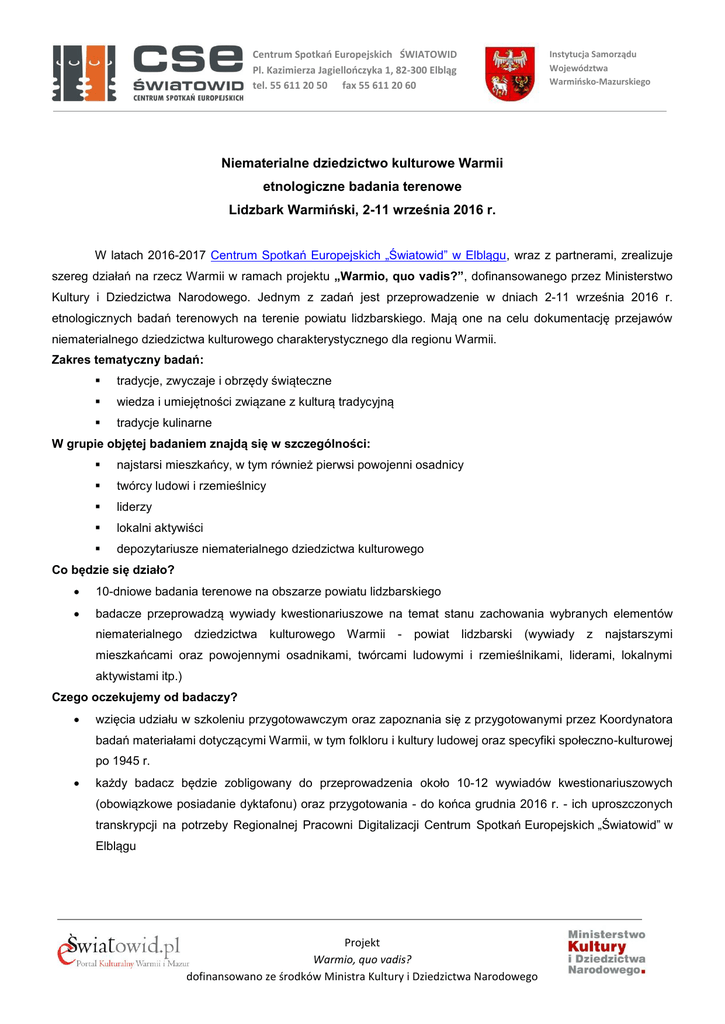 Centrum Spotkań Europejskich ŚWIATOWID Pl. Kazimierza Jagiellończyka 1, 82-300 Elbląg tel. 55 611 20 50 fax 55 611 20 60 Instytucja Samorządu Województwa Warmińsko-Mazurskiego Niematerialne dziedzictwo kulturowe Warmii etnologiczne badania terenowe Lidzbark Warmiński, 2-11 września 2016 r. W latach 2016-2017 Centrum Spotkań Europejskich „Światowid” w Elblągu, wraz z partnerami, zrealizuje szereg działań na rzecz Warmii w ramach projektu „Warmio, quo vadis?”, dofinansowanego przez Ministerstwo Kultury i Dziedzictwa Narodowego. Jednym z zadań jest przeprowadzenie w dniach 2-11 września 2016 r. etnologicznych badań terenowych na terenie powiatu lidzbarskiego. Mają one na celu dokumentację przejawów niematerialnego dziedzictwa kulturowego charakterystycznego dla regionu Warmii. Zakres tematyczny badań: tradycje, zwyczaje i obrzędy świąteczne wiedza i umiejętności związane z kulturą tradycyjną tradycje kulinarne W grupie objętej badaniem znajdą się w szczególności: najstarsi mieszkańcy, w tym również pierwsi powojenni osadnicy twórcy ludowi i rzemieślnicy liderzy lokalni aktywiści depozytariusze niematerialnego dziedzictwa kulturowego Co będzie się działo? 10-dniowe badania terenowe na obszarze powiatu lidzbarskiego badacze przeprowadzą wywiady kwestionariuszowe na temat stanu zachowania wybranych elementów niematerialnego dziedzictwa kulturowego Warmii - powiat lidzbarski (wywiady z najstarszymi mieszkańcami oraz powojennymi osadnikami, twórcami ludowymi i rzemieślnikami, liderami, lokalnymi aktywistami itp.) Czego oczekujemy od badaczy? wzięcia udziału w szkoleniu przygotowawczym oraz zapoznania się z przygotowanymi przez Koordynatora badań materiałami dotyczącymi Warmii, w tym folkloru i kultury ludowej oraz specyfiki społeczno-kulturowej po 1945 r. każdy badacz będzie zobligowany do przeprowadzenia około 10-12 wywiadów kwestionariuszowych (obowiązkowe posiadanie dyktafonu) oraz przygotowania - do końca grudnia 2016 r. - ich uproszczonych transkrypcji na potrzeby Regionalnej Pracowni Digitalizacji Centrum Spotkań Europejskich „Światowid” w Elblągu Projekt Warmio, quo vadis? dofinansowano ze środków Ministra Kultury i Dziedzictwa Narodowego Centrum Spotkań Europejskich ŚWIATOWID Pl. Kazimierza Jagiellończyka 1, 82-300 Elbląg tel. 55 611 20 50 fax 55 611 20 60 Instytucja Samorządu Województwa Warmińsko-Mazurskiego każdy badacz stworzy dokumentację fotograficzną otoczenia społecznego i przejawów kultury niematerialnej każdy badacz będzie miał możliwość przygotowania wyników wywiadów w formie krótkich referatów/ tekstów popularno-naukowych; teksty dotyczące wybranego przez badacza zagadnienia zostaną opublikowane na Portalu Kulturalnym Warmii i Mazur eŚwiatowid.pl oraz w serwisie Cyfrowewm.pl ; dodatkowo będą mogły być one zaprezentowane podczas konferencji podsumowującej projekt, która pod koniec 2017 r. odbędzie się w Elblągu Co oferujemy badaczom? możliwość zaliczenia praktyk studenckich w ramach badań terenowych grupa 10 badaczy ma zapewniony nocleg, wyżywienie, dojazd (i powrót) na miejsce badań z Elbląga oraz zwrot kosztów za przejazdy komunikacją zbiorową podczas prowadzenia badań, np. PKP, PKS zdobycie doświadczenia w prowadzeniu badań terenowych z wykorzystaniem metod etnograficznych pozyskanie wiedzy i kompetencji związanych z rozpoznawaniem tradycyjnej kultury regionu Warmii, zjawisk kulturowych oraz tradycji wynalezionych Zgłoszenie swojego udziału w badaniach jest możliwe za pomocą ankiety pod adresem: https://docs.google.com/forms/d/1WKTbtMYA5qKti5IEHan98sJwQURZiIls0Aj9NxRHZLA/viewform?c=0&w=1&usp =mail_form_link Termin nadsyłania zgłoszeń: 15.06. 2016 r. Koordynator badań terenowych: Aleksandra Paprot - kontakt: [email protected] Etnolog i kulturoznawca, doktorantka w Instytucie Etnologii i Antropologii Kulturowej Uniwersytetu im. Adama Mickiewicza w Poznaniu. Członkini Polskiego Towarzystwa Ludoznawczego oraz sekretarz działającej przy nim Sekcji Stroju Ludowego. Zajmuje się problematyką kreowania współczesnych tożsamości regionalnych oraz lokalnych, a także polityką regionalną, kulturalną i dziedzictwem kulturowym na Ziemiach Zachodnich i Północnych. Prowadziła badania etnograficzne na Żuławach, Powiślu, Warmii, Mazurach, Podlasiu i w Wielkopolsce. Zajmuje się w mechanizmami tworzenia nowych tradycji przez lokalne społeczności, instytucje kultury i stowarzyszenia. Szczególną uwagę skupia na niematerialnym dziedzictwie kulturowym. Autorka książki Atlas niematerialnego dziedzictwa kulturowego wsi wielkopolskiej. Powiat gnieźnieński, t. 3. Uczestniczyła w konferencjach i warsztatach dotyczących wdrażania konwencji UNESCO z 2003 r. dot. niematerialnego dziedzictwa kulturowego. Informacji o projekcie „Warmio, quo vadis?” udziela koordynatorka Agnieszka Jarzębska - kontakt: tel. 55 611 20 84, [email protected] Projekt Warmio, quo vadis? dofinansowano ze środków Ministra Kultury i Dziedzictwa Narodowego