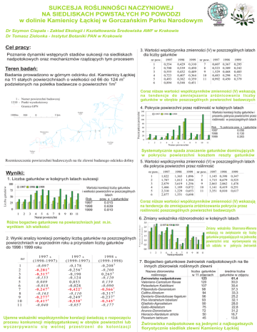 SUKCESJA ROŒLINNOŒCI NACZYNIOWEJ NA SIEDLISKACH POWSTA£YCH PO POWODZI w dolinie Kamienicy £¹ckiej w Gorczañskim Parku Narodowym Dr Szymon Ciapa³a - Zak³ad Ekologii i Kszta³towania Œrodowiska AWF w Krakowie Dr Tomasz Zielonka - Instytut Botaniki PAN w Krakowie ..... Cel pracy: 3. Wartoœci wspó³czynnika zmiennoœci (V) w poszczególnych latach dla liczby gatunków Poznanie dynamiki wstêpnych stadiów sukcesji na siedliskach nadpotokowych oraz mechanizmów rz¹dz¹cych tym procesem nr pow. 1 2 3 4 5 6 Teren badañ: Badania prowadzono w górnym odcinku dol. Kamienicy £¹ckiej 2 na 11 sta³ych powierzchniach o wielkoœci od 66 do 124 m 2 podzielonych na poletka badawcze o powierzchni 1m Kud³oñ 1273 1 km 0 11 Mostownica 1251 1 9 4 5 6 3 7 8 10 Wartoœci korelacji liczby gatunków i wielkoœci powierzchni w poszczególnych latach Rok pow. x l.gatunków 1997 0.015 1998 0.639 1999 0.810 50 25 0 4 5 6 7 8 Numer powierzchni 9 1999 Rok % pokrycia pow. x l.gatunków 1997 0.056 1998 0.130 1999 0.263 40 20 0 1 2 3 4 5 6 7 8 9 10 11 Numer powierzchni 5. Wartoœci wspó³czynnika zmiennoœci (V) w poszczególnych latach dla pokrycia powierzchni przez roœlinnoœæ nr pow. 1 2 3 4 5 6 2. Wyniki analizy korelacji pomiêdzy liczb¹ gatunków na poszczególnych powierzchniach w poprzednim roku a przyrostem liczby gatunków do 1998 i 1999 roku 1998 1,365 1,812 3,619 1,189 1,229 1,551 1999 1,096 1,504 1,256 0,872 0,653 0,698 nr pow. 7 8 9 10 11 1997 1,145 1,715 2,863 1,141 3,351 1998 0,398 0,679 2,062 0,419 0,810 1999 0,347 0,525 1,478 0,251 0,617 Coraz ni¿sze wartoœci wspó³czynników zmiennoœci (V) wskazuj¹ na tendencje do zmniejszania zró¿nicowania pokrycia przez roœlinnoœæ poszczególnych powierzchni badawczych 6. Zmiany wskaŸnika ró¿norodnoœci w kolejnych latach 3.0 1997 1998 1999 2.5 1997 x (1 9 9 9 -1 9 9 7 ) -0 ,1 7 8 3 -0 ,2 5 6 -0 ,1 9 0 -0 ,1 2 4 0 ,0 5 3 -0 ,0 2 8 1 -0 ,4 2 2 -0 ,1 1 0 3 -0 ,2 4 9 1 -0 ,5 3 8 -0 ,0 5 7 1998 x (1 9 9 9 -1 9 9 8 ) 3 -0 ,2 0 8 -0 ,2 0 0 3 0 ,2 6 5 -0 ,1 2 0 0 ,1 5 9 -0 ,0 9 0 1 -0 ,5 6 6 2 -0 ,3 1 7 3 -0 ,2 3 7 1 -0 ,3 4 5 -0 ,1 7 7 Ujemne wskaŸniki wspó³czynników korelacji œwiadcz¹ o rozpoczêciu procesu konkurencji miêdzygatunkowej w obrêbie powierzchni lub wyczerpywaniu siê wolnej przestrzeni do kolonizacji Zmiany wskaŸnika Shannona-Wienera wskazuj¹ na zwiêkszanie siê liczby gatunków przypadaj¹cych na jednostkê powierzchni oraz wyrównywanie siê ich udzia³u w pokryciu ¿wirowisk 2.0 1.5 1.0 0.5 0.0 1 1997 x (1 9 9 8 -1 9 9 7 ) -0 ,0 9 7 3 -0 ,2 8 1 2 -0 ,3 1 7 -0 ,1 5 5 0 ,0 8 9 -0 ,0 1 8 3 -0 ,2 4 7 -0 ,1 6 3 2 -0 ,2 7 7 1 -0 ,4 1 7 -0 ,0 4 0 1997 1,822 1,787 2,879 1,466 2,310 2,877 10 11 Ró¿ne bogactwo gatunkowe na powierzchniach jest m.in. wynikiem ich wielkoœci 1 2 3 4 5 6 7 8 9 10 11 1998 60 W s k a Ÿ n ik r ó ¿ n o r o d n o œ c i Sh a n n o n a - W ie n e r a Lic zb a gatunkó w 1999 75 nr 1999 0,295 0,242 0,403 0,271 0,379 80 100 3 1998 0,367 0,309 0,468 0,298 0,450 Wartoœci korelacji liczby gatunków i procentu pokrycia powierzchni przez roœlinnoœæ w poszczególnych latach 100 1. Liczba gatunków w kolejnych latach sukcesji 2 1997 120 Wyniki: 1 1997 0,607 0,523 1,529 0,483 0,992 Systematycznie spada znaczenie gatunków dominuj¹cych w pokryciu powierzchni kosztem reszty gatunków Rozmieszczenie powierzchni badawczych na tle zlewni badanego odcinka doliny 1998 nr pow. 7 8 9 10 11 140 Przys³op 1187 2 Turbacz 1310 1997 1999 0,310 0,450 0,449 0,364 0,359 0,451 4. Pokrycie powierzchni przez roœlinnoœæ w kolejnych latach Procent pokrycia powierzchni 500 1998 0,429 0,539 0,432 0,407 0,382 0,548 Coraz ni¿sze wartoœci wspó³czynników zmiennoœci (V) wskazuj¹ na tendencje do zmniejszania zró¿nicowania liczby gatunków w obrêbie poszczególnych powierzchni badawczych 1 - Numer powierzchni badawczej 1310 - Punkt wysokoœciowy Granica GPN 1000m 1997 0,554 0,700 0,555 0,723 0,493 0,894 2 3 4 5 6 7 Numerpowierzchni 8 9 10 11 7. Bogactwo gatunkowe ¿wirowisk nadpotokowych na tle innych zbiorowisk roœlinnych zlewni Nazwa zbiorowiska roœlinnego ¯wirowiska nadpotokowe Valeriano-Caricetum flavae Petasitetum Kablikiani Filipendulo-Geranietum Caltho-Alnetum Dentario-Glandulosae fagetum Poo-Veratretum lobeliani Gladiolo-Agrostietum Galio-Abietetum Arunco-Doronicetum Hieracio-Nardetum stricte Piceetum tatricum liczba gatunków w 11 zdjêciach 123 120 107 98 94 96 93 90 75 72 50 45 œrednia liczba gatunków w zdjêciu 61,4 30,0 30,4 37,3 33,3 25,2 32,1 28,0 22,8 31,2 16,7 . 13,6 ¯wirowiska nadpotokowe s¹ jednymi z najbogatszych florystycznie siedlisk zlewni Kamienicy £¹ckiej
