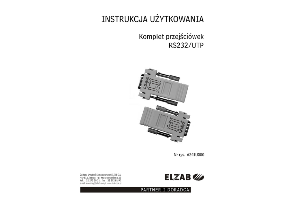 Komplet przej ciówek RS232/UTP kod: A24 red.2.2 Komplet przej ciówek RS232/UTP s u y do po czenia za pomoc standardowego kabla UTP 5E obustronnie zako czonego wtykami RJ45 (stosowanego w komputerowych sieciach LAN), nast puj cych urz dze : komputera PC z kasami typu ELZAB* komputera PC z drukark ELZAB Omega komputera PC z drukark ELZAB Mera komputera PC z drukark ELZAB Eta komputera PC z prze cznikiem multiplekserów 2MX komputera PC z rozdzielaczem drukarek ELZAB Omega multipleksera 4xRS232 z kasami typu ELZAB* multipleksera 4xRS232 z komputerem PC multipleksera 4xRS232 z modemem kasowym kasy typu ELZAB* z drukark ELZAB Kuchta kasy typu ELZAB* z WINCOM-em kasy typu ELZAB* z modemem kasowym drukarka ELZAB Omega z rozdzielaczem drukarek ELZAB Omega Przej ciówka RS232/UTP D-sub9 gniazdo * Jako kasy typu ELZAB rozumie si kasy ELZAB Alfa, ELZAB Delta oraz ELZAB Jota z Interfejsem komputerowym A1100000. Uwaga: Komplet przej ciówek RS232/UTP nie nadaje si do po czenia komputera PC z WINCOM-em i komputera PC z drukark ELZAB Kuchta. Dopuszczalne d ugo ci kabli zapewniaj ce poprawn prac : dla pr dko ci transmisji 9600 - 300m dla pr dko ci transmisji 19200 - 200m. Wtyki RJ45 powinny by zaci ni te na kablu UTP zgodnie z opisem przedstawionym w tabeli, (jak w kablu stosowanym w sieciach komputerowych LAN). Numeracja styków w RJ45 - jak na rysunku Kabel UTP zako czony wtykami RJ45 nr styku kolor y y w kablu nr styku 8 br zowy 8 7 br zowo-bia y 7 6 zielony 6 5 niebiesko-bia y 5 4 niebieski 4 3 zielono-bia y 3 2 pomara czowy 2 1 pomara czowo-bia y 1 Przej ciówka UTP/RS232 D-sub9 wtyk Schemat po cze wewn trznych przej ciówek oraz opis po cze kabla cz cego (UTP)