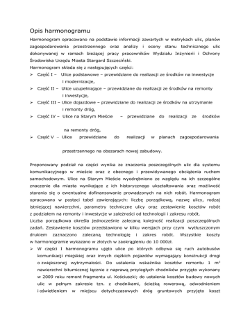 Opis harmonogramu Harmonogram opracowano na podstawie informacji zawartych w metrykach ulic, planów zagospodarowania przestrzennego oraz analizy i oceny stanu technicznego ulic dokonywanej w ramach bieżącej pracy pracowników Wydziału Inżynierii i Ochrony Środowiska Urzędu Miasta Stargard Szczeciński. Harmonogram składa się z następujących części: Część I – Ulice podstawowe – przewidziane do realizacji ze środków na inwestycje i modernizacje, Część II – Ulice uzupełniające – przewidziane do realizacji ze środków na remonty i inwestycje, Część III – Ulice dojazdowe – przewidziane do realizacji ze środków na utrzymanie i remonty dróg, Część IV – Ulice na Starym Mieście – przewidziane do realizacji realizacji planach ze środków na remonty dróg, Część V Ulice przewidziane do w zagospodarowania przestrzennego na obszarach nowej zabudowy. Proponowany podział na części wynika ze znaczenia poszczególnych ulic dla systemu komunikacyjnego w mieście oraz z obecnego i przewidywanego obciążenia ruchem samochodowym. Ulice na Starym Mieście wyodrębniono ze względu na ich szczególne znaczenie dla miasta wynikające z ich historycznego ukształtowania oraz możliwość starania się o ewentualne dofinansowanie prowadzonych na nich robót. Harmonogram opracowano w postaci tabel zawierających: liczbę porządkową, nazwę ulicy, rodzaj istniejącej nawierzchni, parametry techniczne ulicy oraz zestawienie kosztów robót z podziałem na remonty i inwestycje w zależności od technologii i zakresu robót. Liczba porządkowa określa jednocześnie zalecaną kolejność realizacji poszczególnych zadań. Zestawienie kosztów przedstawiono w kilku wersjach przy czym wytłuszczonym drukiem zaznaczono zalecaną technologię i zakres robót. Wszystkie koszty w harmonogramie wykazano w złotych w zaokrągleniu do 10 000zł. W części I harmonogramu ujęto ulice po których odbywa się ruch autobusów komunikacji miejskiej oraz innych ciężkich pojazdów wymagający konstrukcji drogi o zwiększonej wytrzymałości. Do ustalenia wskaźnika kosztów remontu 1 m 2 nawierzchni bitumicznej łącznie z naprawą przyległych chodników przyjęto wykonany w 2009 roku remont fragmentu ul. Kościuszki; do ustalenia kosztów budowy nowych ulic w pełnym zakresie tzn. z chodnikami, ścieżką rowerową, odwodnieniem i oświetleniem w miejscu dotychczasowych dróg gruntowych przyjęto koszt zrealizowanej w 2009 roku budowy nowej drogi do terenów przemysłowych na byłym lotnisku; do ustalenia kosztów budowy chodników wzdłuż ulic podstawowych przewidzianych do realizacji jako odrębne zadanie przyjęto koszt przeprowadzonych w 2009 roku remontów chodników w ulicy Czarnieckiego. W części II harmonogramu ujęto ulice osiedlowe po których poruszają się głownie samochody osobowe z niewielkim udziałem samochodów ciężarowych. Ponieważ ulice osiedlowe znajdują się lub też mogą znajdować się w strefach zamieszkania, nie przewiduje się na większości z nich wydzielania ścieżek rowerowych. W celu uzyskania pełniejszej informacji o niezbędnych wydatkach ujęto 3 warianty kosztów przebudowy lub remontów tych ulic: tzw. powierzchniowe utrwalenie jezdni czyli remont polegający na usunięciu dotychczasowej nawierzchni, wykonaniu nowej podbudowy oraz nowej nawierzchni ze specjalnie dobranych kruszyw mieszanych z odpowiednimi emulsjami bitumicznymi; Koszty, obejmujące wyłącznie remont jezdni bez chodników, ścieżek rowerowych i oświetlenia oraz odwodnienia ustalono na podstawie ofert wykonawców złożonych w 2009 roku, nawierzchnię z płyt betonowych zaleca się wykonać jedynie jako kontynuacja remontów ulic wykonanych w tej technologii latach poprzednich (ulice Kruczkowskiego, Gombrowicza i Staffa); Koszt remontów w tej technologii przyjęto na podstawie kosztów drogi wybudowanej w 2008 roku w Parku Przemysłowym (przedłużenie ul. Stralsundzkiej), budowę nowych ulic w miejscu dotychczasowych dróg gruntowych lub stabilizowanych bitumicznych zaleca się dla ulic, które ze względu na swoje położenie mogą, po ich przebudowie przejść do grupy „podstawowych”; Dotyczy to ulic: Grudziądzkiej, Spółdzielczej, Giżynek i wewnętrznej na Osiedlu Zachód; do ustalenia kosztów budowy nowych ulic w pełnym zakresie tzn. z chodnikami, ścieżką rowerową, odwodnieniem i oświetleniem w miejscu dotychczasowych dróg gruntowych przyjęto koszt zrealizowanej w 2009 roku budowy nowej drogi do terenów przemysłowych na byłym lotnisku; W części III harmonogramu ujęto ulice dojazdowe do niewielkich grup budynków. Ulice te są użytkowane podobnie jak ulice ujęte w części II. Podobnie również kształtują się koszty jednostkowe ich remontu lub budowy. Umieszczono je w osobnej części ze względu na łączny koszt ich remontu nie przekraczający 100 tys. zł. W części IV harmonogramu dotyczącej ulic na Starówce przyjęto konieczność odtworzenia nawierzchni jezdni i chodników z materiałów kamiennych. Do ustalenia wskaźników kosztów remontu 1 m2 chodników i jezdni na podstawie wykonanych już remontów części ul. Warownej i ul. Mieszka I. Koszty remontów nie obejmują wymiany oświetlenia ulicznego. W części V harmonogramu ujęto ulice, których budowa wskazana jest w planach zagospodarowania przestrzennego na terenach zabudowy mieszkaniowej i na których rozpoczęto wznoszenie pierwszych budynków oraz drogi, które mają usprawnić ruch samochodowy w mieście. Część V obejmuje następujące drogi i tereny: drogi zbiorcze usprawniające ruch w mieście, tereny w rejonie Stargardzkiego Parku Przemysłowego – dawne ZNTK, tereny w rejonie ulic Broniewskiego, Armii Krajowej, 5 Marca i obejścia południowego miasta, tereny w rejonie ulic Spółdzielczej, Niepodległości, Broniewskiego, tereny w rejonie ulic Matejki, Kossaka, Podmiejskiej, Podleśnej, tereny w rejonie ulicy Grudziądzkiej, tereny w rejoni