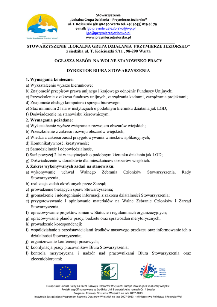 Stowarzyszenie „Lokalna Grupa Działania – Przymierze Jeziorsko” ul. T. Kościuszki 9/11 98-290 Warta tel. +48 (043) 829 48 79 e-mail: [email protected] [email protected] www.przymierzejeziorsko.pl _________________________________________________________________________ STOWARZYSZENIE „LOKALNA GRUPA DZIAŁANIA PRZYMIERZE JEZIORSKO” z siedzibą ul. T. Kościuszki 9/11 , 98-290 Warta OGŁASZA NABÓR NA WOLNE STANOWISKO PRACY DYREKTOR BIURA STOWARZYSZENIA 1. Wymagania konieczne: a) Wykształcenie wyższe kierunkowe; b) Znajomość przepisów prawa unijnego i krajowego odnośnie Funduszy Unijnych; c) Przeszkolenie z zakresu funduszy unijnych, zarządzania kadrami, zarządzania projektami; d) Znajomość obsługi komputera i sprzętu biurowego; e) Staż minimum 2 lata w instytucjach o podobnym kierunku działania jak LGD; f) Doświadczenie na stanowisku kierowniczym. 2. Wymagania pożądane: a) Wykształcenie wyższe związane z rozwojem obszarów wiejskich; b) Przeszkolenie z zakresu rozwoju obszarów wiejskich; c) Wiedza z zakresu zasad przygotowywania wniosków aplikacyjnych; d) Komunikatywność, kreatywność; e) Samodzielność i odpowiedzialność, f) Staż powyżej 2 lat w instytucjach o podobnym kierunku działania jak LGD; g) Doświadczenie w doradztwie dla mieszkańców obszarów wiejskich. 3. Zakres wykonywanych zadań na stanowisku: a) wykonywanie uchwał Walnego Zebrania Członków Stowarzyszenia, Rady Stowarzyszenia; b) realizacja zadań określonych przez Zarząd; c) prowadzenie bieżących spraw Stowarzyszenia; d) gromadzenie i udostępnianie informacji z zakresu działalności Stowarzyszenia; e) przygotowywanie i opiniowanie materiałów na Walne Zebranie Członków i Zarząd Stowarzyszenia; f) opracowywanie projektów zmian w Statucie i regulaminach organizacyjnych; g) opracowywanie planów pracy, budżetu oraz sprawozdań merytorycznych; h) prowadzenie korespondencji; i) współdziałanie z przedstawicielami środków masowego przekazu oraz informowanie ich o działalności Stowarzyszenia; j) organizowanie konferencji prasowych; k) koordynacja pracy pracowników Biura Stowarzyszenia; l) kontrola merytoryczna i nadzór nad pracownikami Biura Stowarzyszenia oraz zleceniobiorcami; Europejski Fundusz Rolny na Rzecz Rozwoju Obszarów Wiejskich: Europa inwestująca w obszary wiejskie. Projekt współfinansowany ze środków Unii Europejskiej w ramach Osi 4 Leader Programu Rozwoju Obszarów Wiejskich na lata 2007-2013. Instytucja Zarządzająca Programem Rozwoju Obszarów Wiejskich na lata 2007-2013 - Ministerstwo Rolnictwa i Rozwoju Wsi. Stowarzyszenie „Lokalna Grupa Działania – Przymierze Jeziorsko” ul. T. Kościuszki 9/11 98-290 Warta tel. +48 (043) 829 48 79 e-mail: [email protected] [email protected] www.przymierzejeziorsko.pl _________________________________________________________________________ m) nadzór nad prawidłowością wdrażania procedur organizacyjnych; n) dokonywanie samodzielnych zakupów bieżących jednorazowo do wysokości 6000 Euro, po akceptacji Zarządu. 4. Wymagane dokumenty: a) życiorys (CV) b) list motywacyjny c) dokument poświadczający wykształcenie ( dyplom lub zaświadczenie o stanie odbytych studiów) d) kwestionariusz osobowy e) inne dodatkowe dokumenty o posiadanych kwalifikacjach i umiejętnościach. Wymagane dokumenty należy składać osobiście w siedzibie Biura LGD lub pocztą na adres: Stowarzyszenie „LGD - Przymierze Jeziorsko” ul. T. Kościuszki 9/11, 98-290 Warta z dopiskiem: Dotyczy naboru na wolne stanowisko: Dyrektor Biura Stowarzyszenia. Termin składania dokumentów od 08.09.2011r. do 22.09.2011r. Dokumenty, które wpłyną po wyżej określonym terminie nie będą rozpatrywane. Informacja o wyniku naboru będzie umieszczana na tablicy ogłoszeń w siedzibie Biura LGD oraz na stronie internetowej LGD . Wymagane dokumenty: list motywacyjny, szczegółowe CV ( z uwzględnieniem dokładnego przebiegu kariery zawodowej), powinny być opatrzone klauzulą: „Wyrażam zgodę na przetwarzanie moich danych osobowych zawartych w ofercie pracy dla potrzeb niezbędnych do realizacji procesu rekrutacji zgodnie z ustawa z dnia 29 sierpnia 1997r. o ochronie danych osobowych (DzU. z 2002r. Nr 101, poz. 926 z pózn. zm.)”. Europejski Fundusz Rolny na Rzecz Rozwoju Obszarów Wiejskich: Europa inwestująca w obszary wiejskie. Projekt współfinansowany ze środków Unii Europejskiej w ramach Osi 4 Leader Programu Rozwoju Obszarów Wiejskich na lata 2007-2013. Instytucja Zarządzająca Programem Rozwoju Obszarów Wiejskich na lata 2007-2013 - Ministerstwo Rolnictwa i Rozwoju Wsi.