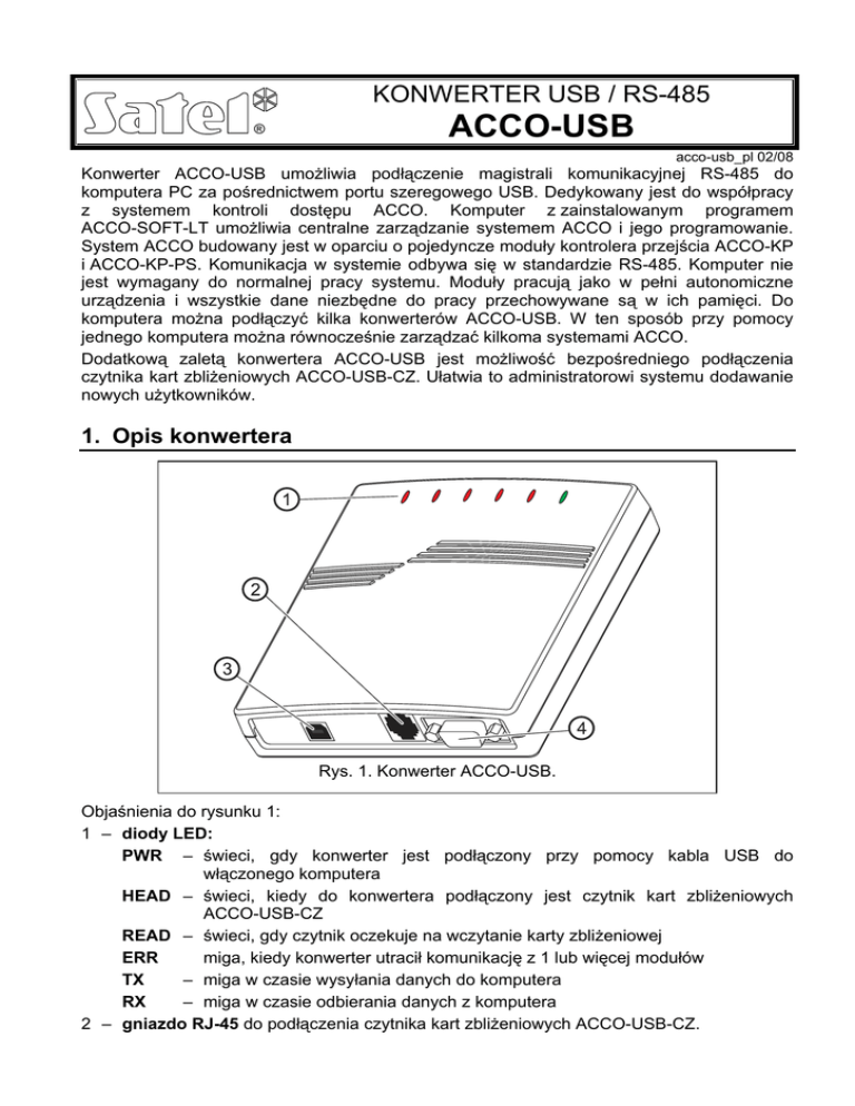 KONWERTER USB / RS-485 ® ACCO-USB acco-usb_pl 02/08 Konwerter ACCO-USB umożliwia podłączenie magistrali komunikacyjnej RS-485 do komputera PC za pośrednictwem portu szeregowego USB. Dedykowany jest do współpracy z systemem kontroli dostępu ACCO. Komputer z zainstalowanym programem ACCO-SOFT-LT umożliwia centralne zarządzanie systemem ACCO i jego programowanie. System ACCO budowany jest w oparciu o pojedyncze moduły kontrolera przejścia ACCO-KP i ACCO-KP-PS. Komunikacja w systemie odbywa się w standardzie RS-485. Komputer nie jest wymagany do normalnej pracy systemu. Moduły pracują jako w pełni autonomiczne urządzenia i wszystkie dane niezbędne do pracy przechowywane są w ich pamięci. Do komputera można podłączyć kilka konwerterów ACCO-USB. W ten sposób przy pomocy jednego komputera można równocześnie zarządzać kilkoma systemami ACCO. Dodatkową zaletą konwertera ACCO-USB jest możliwość bezpośredniego podłączenia czytnika kart zbliżeniowych ACCO-USB-CZ. Ułatwia to administratorowi systemu dodawanie nowych użytkowników. 1. Opis konwertera Rys. 1. Konwerter ACCO-USB. Objaśnienia do rysunku 1: 1 – diody LED: PWR – świeci, gdy konwerter jest podłączony przy pomocy kabla USB do włączonego komputera HEAD – świeci, kiedy do konwertera podłączony jest czytnik kart zbliżeniowych ACCO-USB-CZ READ – świeci, gdy czytnik oczekuje na wczytanie karty zbliżeniowej ERR miga, kiedy konwerter utracił komunikację z 1 lub więcej modułów TX – miga w czasie wysyłania danych do komputera RX – miga w czasie odbierania danych z komputera 2 – gniazdo RJ-45 do podłączenia czytnika kart zbliżeniowych ACCO-USB-CZ. 2 ACCO-USB SATEL 3 – gniazdo USB do połączenia konwertera z komputerem. 4 – gniazdo DB-9 do podłączenia magistrali komunikacyjnej RS-485. 2. Podłączenie konwertera do komputera Konwerter ACCO-USB może zostać podłączony do komputera PC z zainstalowanym systemem Windows 98/ME/2000/XP/VISTA. Połączenie należy wykonać przy pomocy kabla USB dołączonego do konwertera. Po podłączeniu, w konwerterze zapali się zielona dioda LED oznaczona PWR. System Windows automatycznie wykryje podłączenie nowego urządzenia i wyświetli okno kreatora, który poprowadzi użytkownika przez procedurę instalacji sterowników dla nowego sprzętu. Sterowniki konwertera ACCO-USB znajdują się na dołączonej do urządzenia płycie CD. Niektóre wersje systemu operacyjnego Windows mogą ostrzegać, że oprogramowanie to nie przeszło testów zgodności. Instalację sterowników należy kontynuować pomimo tych ostrzeżeń. Po zainstalowaniu sterowników, w komputerze dostępny będzie dodatkowy port COM. Za pośrednictwem tego portu i konwertera ACCO-USB, program ACCO-SOFT-LT będzie komunikował się z modułami podłączonymi do magistrali RS-485. W oknie menadżera urządzeń pojawią się dwa nowe urządzenia (USB <--> RS 485 Serial Converter oraz Acco-USB Serial Port). Po podłączeniu do komputera i zainstalowaniu sterowników, konwerter pracuje bezobsługowo. 3. Magistrala komunikacyjna RS-485 Połączenie modułów kontrolera przejścia ACCO-KP i ACCO-KP-PS oraz konwertera ACCO-USB należy wykonać w topologii magistrali (nie zaleca się stosowania topologii typu „gwiazda”). Sposób budowy magistrali RS-485 przedstawia rysunek 2. A A RT RT B B 1 3 A RS485 B A RS485 B A RS485 B 1 2 255 Rys. 2. Schemat przedstawiający magistralę komunikacyjną RS-485 i sposób podłączenia do niej modułów. Wtyk męski DB-9, służący do podłączenia magistrali RS-485 do konwertera (dołączony do urządzenia), został pokazany od strony punktów lutowniczych. Konwerter ACCO-USB może zostać podłączony do magistrali w dowolnym miejscu. Na początku i końcu magistrali należy umieścić rezystory o wartości 680 Ω. Do budowy magistrali komunikacyjnej RS-485 należy zastosować kabel typu UTP (skrętka nieekranowana). Wykorzystywana jest tylko jedna para przewodów. Długość magistrali może wynosić maksymalnie 1200 metrów. Do magistrali można podłączyć do 255 modułów. Podłączając moduły do magistrali należy pamiętać, że muszą one mieć ustawiony indywidualny adres. Adres ten nie może się powtarzać! W żadnym module nie wolno ustawić adresu 0. Magistrala RS-485 powinna być obciążona na początku i końcu rezystorami SATEL ACCO-USB 3 o wartości 680 Ω. Jest to szczególnie ważne w przypadku długiej magistrali i dużych prędkości transmisji. Uwaga: W przypadku wystąpienia problemów z komunikacją po magistrali RS-485, pomocne może okazać się połączenie dodatkowym przewodem masy wszystkich modułów i konwertera (pin 5). 4. Czytnik kart zbliżeniowych ACCO-USB-CZ Czytnik kart zbliżeniowych ACCO-USB-CZ to zaadaptowany do współpracy z konwerterem ACCO-USB czytnik CZ-EMM. Wyprowadzony z czytnika kabel jest zakończony wtykiem RJ-45, służącym do podłączenia do gniazda konwertera. Podłączenie czytnika sygnalizuje dioda LED konwertera oznaczona HEAD. Podłączony do konwertera czytnik ułatwia pracę administratorowi systemu, pozwalając dodawać użytkownikom karty (wszędzie, gdzie w instrukcji użyte jest słowo „karta”, chodzi o transponder pasywny, który może mieć formę karty, breloka itd) bez odchodzenia od komputera . Ponadto czytnik może być wykorzystywany do wyszukiwania użytkowników nieopisanych kart. Dwukolorowa dioda LED w czytniku sygnalizuje: dioda świeci na czerwono – czytnik pracuje poprawnie. dioda miga na zielono – oczekiwanie na zbliżenie karty. Brzęczyk w czytniku sygnalizuje: 1 krótki dźwięk – odczytanie kodu nowej karty (dodawanie karty) albo odczytanie kodu znanej karty (szukanie użytkownika na podstawie karty). 2 długie dźwięki – karta nieznana (szukanie użytkownika na podstawie karty). Rys. 3. Kolejność przewodów czytnika we wtyku RJ-45 (widok od strony styków). Objaśnienia do rysunku 3: 1 – przewód czerwony – zasilanie głowicy 2 