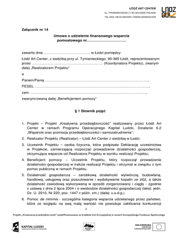 Załącznik nr 14 Umowa o udzielenie finansowego wsparcia pomostowego nr………………………….. zawarta dnia ……………………………….. w Łodzi pomiędzy: Łódź Art Center, z siedzibą przy ul. Tymienieckiego, 90-365 Łódź, reprezentowanym przez …………………………………………………. (Koordynatora Projektu), zwanym dalej „Realizatorem Projektu” a Panem/Panią …………………………………………………………………………, PESEL …………………………………………………………………………………, zam. …………………………………………………………………………………., zwanym/zwaną dalej „Beneficjentem pomocy” § 1 Słownik pojęć 1. Projekt – Projekt „Kreatywna przedsiębiorczość” realizowany przez Łódź Art Center w ramach Programu Operacyjnego Kapitał Ludzki, Działanie 6.2 „Wsparcie oraz promocja przedsiębiorczości i samozatrudnienia”; 2. Realizator Projektu (Realizator) – Łódź Art Center z siedzibą w Łodzi; 3. Uczestnik Projektu – osoba fizyczna, która podpisała Deklarację uczestnictwa w Projekcie, zamierzającą rozpocząć prowadzenie działalności gospodarczej, otrzymująca wsparcie od Realizatora Projektu w wyniku realizacji Projektu; 4. Beneficjent pomocy – Uczestnik Projektu, który rozpoczął prowadzenie działalności gospodarczej w trakcie realizacji Projektu i otrzymał w związku z tym pomoc publiczną w ramach Projektu. 5. Działalność gospodarcza – zarobkową działalność wytwórczą, budowlaną, handlową, usługową oraz poszukiwanie i wydobywanie kopalin ze złóż, a także działalność zawodową wykonywaną w sposób zorganizowany i ciągły - zgodnie z ustawą z dnia 2 lipca 2004 r o swobodzie działalności gospodarczej (tekst. jedn. Dz. U. 2010, Nr 220, poz. 1447 z późn. zm.) (dalej: u.s.d.g.). 6. Pomoc de minimis - szczególna kategoria wsparcia udzielanego przez państwo, które ze względu na swą małą wartość nie powoduje zakłócenia konkurencji 1 w wymiarze unijnym. Pomoc ta nie podlega obowiązkowi notyfikacji Komisji Europejskiej. Zasady udzielania pomocy de minimis określa Rozporządzenie Komisji (WE) Nr 1998/2006 z dnia 15 grudnia 2006 r. w sprawie stosowania art. 87 i 88 Traktatu do pomocy de minimis. Maksymalny, dopuszczalny pułap pomocy de minimis wynosi 200 tys. euro. Podmiot prowadzący działalność gospodarczą może uzyskać podwyższą pomoc, jeżeli wartość tej pomocy łącznie z wartością innej pomocy de minimis otrzymanej w okresie bieżącego roku kalendarzowego i dwóch poprzednich lat kalendarzowych nie przekracza kwoty stanowiącej równowartość w złotych wspomnianych 200 tys. euro, a w przypadku podmiotu prowadzącego działalność w sektorze transportu drogowego – równowartość w złotych kwoty 100 000 euro, obliczonych według średniego kursu NBP obowiązującego w dniu udzielenia pomocy. 7. (Finansowe) wsparcie pomostowe – wsparcie finansowe udzielane przez Realizatora Projektu Beneficjentowi pomocy po rozpoczęciu działalności gospodarczej w wysokości do 1600 zł miesięcznie na bieżące wydatki związane z prowadzoną działalnością przez okres do 6 (wsparcie podstawowe) lub 12 miesięcy (wsparcie podstawowe oraz przedłużone) prowadzenia działalności gospodarczej w ramach Projektu „Kreatywna przedsiębiorczość” 8. Wniosek – należy przez to rozumieć Wniosek o udzielenie finansowego wsparcia pomostowego złożony przez Uczestnika Projektu do Realizatora wraz z załącznikami, w szacunkowym zestawieniem wydatków, na które będzie przeznaczone finansowe wsparcie pomostowe. § 2 Przedmiot umowy 1. Przedmiotem niniejszej umowy jest udzielenie przez Realizatora Projektu wsparcia pomostowego Beneficjentowi pomocy, który prowadzi działalność gospodarczą. Celem wsparcia jest wspomożenie Beneficjenta pomocy w pierwszych miesiącach prowadzenia działalności gospodarczej. 2. Wsparcie pomostowe jest udzielane w oparciu o zapisy niniejszej umowy, ustawę o postępowaniu w sprawach dotyczących pomocy publicznej z dnia 30 kwietnia 2004 r. (t. j. Dz. U. z 2007 r., Nr 59, poz. 404 z poźn. zm.), rozporządzenie Ministra Rozwoju Regionalnego z dnia 15 grudnia 2010 r. w sprawie udzielania pomocy publicznej w ramach Programu Operacyjnego Kapitał Ludzki (Dz.U. z 2010 r., Nr 239, poz. 1598 z poźn. zm.) oraz umowę nr UDA-POKL.06.02.0010-158/13-00 o dofinansowanie Projektu „Kreatywna przedsiębiorczość” zawartą między WUP w Łodzi a Łódź Art Center. 3. Wsparcie jest pomocą de minimis udzielaną zgodnie z przepisami rozporządzenia Komisji (WE) nr 1998/2006 z dnia 15 grudnia 2006 r. w sprawie stosowania art. 87 i 88 Traktatu do pomocy de minimis (Dz. Urz. UE L 379 z dnia 28.12.2006, str. 5). 2 § 3 Wsparcie pomostowe 1. Wsparcie pomostowe ma postać dotacji wypłacanej z góry, w miesięcznych transzach, przez cały okres obejmowania wsparciem. 2. Wsparcie jest wypłacane w wysokości …. zł miesięcznie. 3. Podstawowe finansowe wsparcie pomostowe wypłacane jest przez okres do 6 miesięcy od dnia zawarcia umowy o udzielenie wsparcia pomostowego. W uzasadnionych przypadkach Realizator może wyrazić zgodę na pokrycie wydatków ponoszonych w okresie od dnia wpisu działalności gospodarczej do Centralnej Ewidencji i Informacji o Działalności Gospodarczej do dnia zawarcia umowy o udzielenie wsparcia pomostowego. 4. Całkowita wartość wsparcia pomostowego wynosi: ......... zł. 5. Wsparcie zostanie wypłacone w złotych polskich na rachunek bankowy Beneficjenta pomocy o numerze .. .... .... .... .... .... ...., prowadzony, w banku ............... . 6. Odsetki naliczone na rachunku bankowym Beneficjenta pomocy, o którym mowa w ust. 5 nie podlegają rozliczeniu. 7. Wsparcie pomostowe może być przeznaczone na pokrycie niezbędnych, bieżących opłat, ponoszonych w początkowym okresie prowadzenia działalności gosp