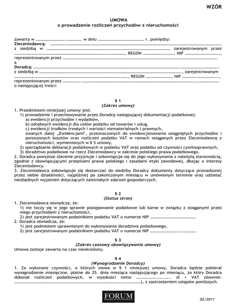 WZÓR UMOWA o prowadzenie rozliczeń przychodów z nieruchomości zawarta w ………………………..…………. w dniu ……………………….…………… r. pomiędzy: Zleceniodawcą: ……………………………………………………………………………………………………………………………….…………… z siedzibą w ……………………………………………………………………………………………………, zarejestrowanym przez …………………………………………………………………………….……………, REGON ……………….………, NIP ………………………….., reprezentowanym przez ………………………………………………………………………………………………………………………………. a Doradcą: ………………………………………………………………………………………………………………………..…………………………….. z siedzibą w ……………………………………………………………………………………………………………………., zarejestrowanym ……………………………………………………………………………………………., REGON ……………………, NIP ………….……………….., reprezentowanym przez ……………..……………………………………………………………………………………………….………………. o następującej treści: §1 (Zakres umowy) 1. Przedmiotem niniejszej umowy jest: 1) prowadzenie i przechowywanie przez Doradcę następującej dokumentacji podatkowej: a) ewidencji przychodów i wydatków, b) odrębnych ewidencji dla celów podatku od towarów i usług, c) ewidencji środków trwałych i wartości niematerialnych i prawnych, zwanych dalej „Ewidencjami", przeznaczonych do ewidencjonowania osiągniętych przychodów i ponoszonych kosztów oraz rozliczeń podatku VAT w ramach osiąganych przez Zleceniodawcę z nieruchomości, wymienionych w § 5 umowy, 2) sporządzanie deklaracji podatkowych w podatku VAT oraz podatku od czynności cywilnoprawnych, 3) doradztwo podatkowe na rzecz Zleceniodawcy w zakresie polskiego prawa podatkowego. 2. Doradca powyŜsze zlecenie przyjmuje i zobowiązuje się do jego wykonywania z naleŜytą starannością, zgodnie z obowiązującymi przepisami prawa polskiego i zasadami etyki zawodowej, dbając o interesy Zleceniodawcy. 3. Zleceniodawca zobowiązuje się dostarczać do siedziby Doradcy dokumenty dotyczące prowadzonej przez siebie działalności, najpóźniej po zakończonym miesiącu w umówionym terminie oraz udzielać niezbędnych wyjaśnień dotyczących zaistniałych zdarzeń gospodarczych. §2 (Status stron) 1. Zleceniodawca oświadcza, Ŝe: 1) nie toczy się w jego sprawie postępowanie podatkowe lub karne w związku z osiąganymi przez niego przychodami z nieruchomości, 2) jest zarejestrowanym podatnikiem podatku VAT o numerze NIP ……………………………………. 2. Doradca oświadcza, Ŝe: 1) jest podmiotem uprawnionym do wykonywania doradztwa podatkowego, 2) jest zarejestrowanym podatnikiem podatku VAT o numerze NIP ………………………..…………. §3 (Zakres czasowy obowiązywania umowy) Umowa zostaje zawarta na czas nieokreślony. §4 (Wynagrodzenie Doradcy) 1. Za wykonane czynności, o których mowa w § 1 niniejszej umowy, Doradca będzie pobierał wynagrodzenie miesięczne, płatne do 25. dnia miesiąca następującego po miesiącu, za który Doradca dokonał rozliczeń podatkowych, w wysokości netto ………………..…..….. zł + VAT (słownie: …………………………………………………………………………………………….…………), z zastrzeŜeniem ustępów poniŜszych. 02/2011 WZÓR 2. Doradca zobowiązuje się do wystawiania faktury VAT zgodnie z obowiązującymi przepisami. 3. Zleceniodawca upowaŜnia do wystawiania faktur VAT bez jego podpisu. 4. Wynagrodzenie płatne będzie w formie gotówkowej w siedzibie Doradcy lub na rachunek Doradcy w banku ……………………………………………………………………………………………………………….. 5. W przypadku dostarczenia dokumentów po ……….. dniu miesiąca Doradca nie ponosi odpowiedzialności za terminowe sporządzenie i złoŜenie deklaracji. 6. Renegocjacja umowy w zakresie wynagrodzenia nastąpić moŜe w przypadkach i na zasadach określonych w OWU. §5 (Ogólne warunki, postanowienia dodatkowe) 1. W zakresie nieuregulowanym niniejszą umową stosuje się ogólne warunki umowy (OWU) z dnia …………………………….r., stanowiące załącznik do umowy. 2. Zleceniodawca oświadcza, Ŝe otrzymał egzemplarz OWU z dnia ……………………………., akceptuje zawarte w nich postanowienia i wyraŜa wolę, by stanowiły one integralną część niniejszej umowy. 3. Przez podpisanie niniejszej umowy Strony rozwiązują ewentualne wcześniejsze umowy w zakresie usług świadczonych przez Doradcę, opisanych w niniejszej umowie. 4. Umowa dotyczy dokonania rozliczeń dochodów i kosztów, które Zleceniodawca(y) uzyskuje(ą) z tytułu własności (współwłasności) następujących nieruchomości: - …………………………………………………………………………………………………………………………..…………………………………………. 5. Zleceniodawca udziela Doradcy pełnomocnictwa do reprezentowania go w zakresie niezbędnym do prawidłowego wykonania niniejszej umowy. Dokument pełnomocnictwa stanowi załącznik Nr 1 do umowy. 6. Uzgodniono ponadto następujące postanowienia: ................................................................................................................................. ...........................................................................