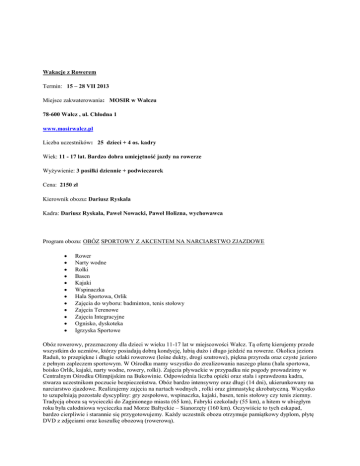 Wakacje z Rowerem Termin: 15 – 28 VII 2013 Miejsce zakwaterowania: MOSIR w Wałczu 78-600 Wałcz , ul. Chłodna 1 www.mosirwalcz.pl Liczba uczestników: 25 dzieci + 4 os. kadry Wiek: 11 - 17 lat. Bardzo dobra umiejętność jazdy na rowerze Wyżywienie: 3 posiłki dziennie + podwieczorek Cena: 2150 zł Kierownik obozu: Dariusz Ryskala Kadra: Dariusz Ryskala, Paweł Nowacki, Paweł Holizna, wychowawca Program obozu: OBÓZ SPORTOWY Z AKCENTEM NA NARCIARSTWO ZJAZDOWE Rower Narty wodne Rolki Basen Kajaki Wspinaczka Hala Sportowa, Orlik Zajęcia do wyboru: badminton, tenis stołowy Zajęcia Terenowe Zajęcia Integracyjne Ognisko, dyskoteka Igrzyska Sportowe Obóz rowerowy, przeznaczony dla dzieci w wieku 11-17 lat w miejscowości Wałcz. Tą ofertę kierujemy przede wszystkim do uczniów, którzy posiadają dobrą kondycję, lubią dużo i długo jeździć na rowerze. Okolica jeziora Raduń, to przepiękne i długie szlaki rowerowe (leśne dukty, drogi szutrowe), piękna przyroda oraz czyste jezioro z pełnym zapleczem sportowym. W Ośrodku mamy wszystko do zrealizowania naszego planu (hala sportowa, boisko Orlik, kajaki, narty wodne, rowery, rolki). Zajęcia pływackie w przypadku nie pogody prowadzimy w Centralnym Ośrodku Olimpijskim na Bukowinie. Odpowiednia liczba opieki oraz stała i sprawdzona kadra, stwarza uczestnikom poczucie bezpieczeństwa. Obóz bardzo intensywny oraz długi (14 dni), ukierunkowany na narciarstwo zjazdowe. Realizujemy zajęcia na nartach wodnych , rolki oraz gimnastykę akrobatyczną. Wszystko to uzupełniają pozostałe dyscypliny: gry zespołowe, wspinaczka, kajaki, basen, tenis stołowy czy tenis ziemny. Tradycją obozu są wycieczki do Zaginionego miasta (65 km), Fabryki czekolady (55 km), a hitem w ubiegłym roku była całodniowa wycieczka nad Morze Bałtyckie – Sianorzęty (160 km). Oczywiście to tych eskapad, bardzo cierpliwie i starannie się przygotowujemy. Każdy uczestnik obozu otrzymuje pamiątkowy dyplom, płytę DVD z zdjęciami oraz koszulkę obozową (rowerową). ZAPISY TYLKO Z WPŁATĄ I raty przyjmuje p. Jagoda Wilkosz codziennie w godz. 7.45 - 8.30 przy ul. Krowoderskiej 8 (III piętro, pokój nr 20) lub codziennie w godz. 8.00 – 15.00 ul. Stardomska 10 (III piętro, sekretariat Pani Halina Czaja) I rata - 500 zł płatne przy zapisach II rata - 1650 zł płatne do 7 czerwca 2013 Uwaga: 1. Dodatkowych informacji o obozie udziela kierownik obozu: Dariusz Ryskala mobil: 601-082-768, e-mail: [email protected] 2. Rodzice uczestników obozu są zobowiązani do wypełnienia karty kwalifikacyjnej i oddania jej najpóźniej do 8 czerwca 2013r. Karty zbiera p. E. Tracz (portiernia II p). 3. W połowie czerwca, na stronie klubowej ukaże się komunikat dotyczący miejsca zbiórki i ekwipunku.