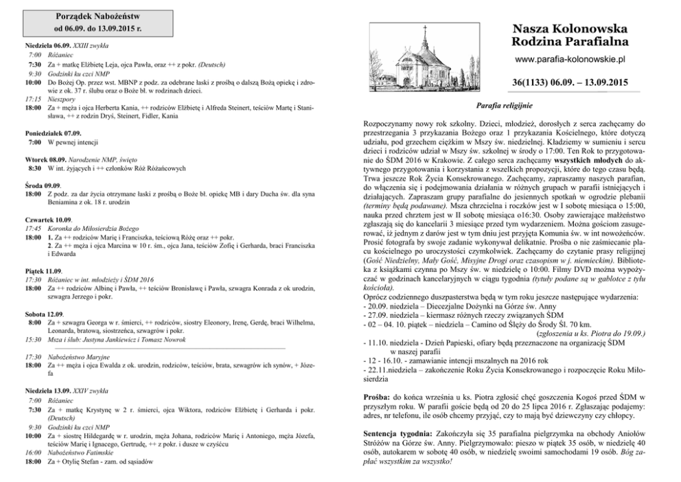 Porządek Nabożeństw od 06.09. do 13.09.2015 r. Niedziela 06.09. XXIII zwykła 7:00 Różaniec 7:30 Za + matkę Elżbietę Leja, ojca Pawła, oraz ++ z pokr. (Deutsch) 9:30 Godzinki ku czci NMP 10:00 Do Bożej Op. przez wst. MBNP z podz. za odebrane łaski z prośbą o dalszą Bożą opiekę i zdrowie z ok. 37 r. ślubu oraz o Boże bł. w rodzinach dzieci. 17:15 Nieszpory 18:00 Za + męża i ojca Herberta Kania, ++ rodziców Elżbietę i Alfreda Steinert, teściów Martę i Stanisława, ++ z rodzin Dryś, Steinert, Fidler, Kania Poniedziałek 07.09. 7:00 W pewnej intencji Wtorek 08.09. Narodzenie NMP, święto 8:30 W int. żyjących i ++ członków Róż Różańcowych Środa 09.09. 18:00 Z podz. za dar życia otrzymane łaski z prośbą o Boże bł. opiekę MB i dary Ducha św. dla syna Beniamina z ok. 18 r. urodzin Czwartek 10.09. 17:45 Koronka do Miłosierdzia Bożego 18:00 1. Za ++ rodziców Marię i Franciszka, teściową Różę oraz ++ pokr. 2. Za ++ męża i ojca Marcina w 10 r. śm., ojca Jana, teściów Zofię i Gerharda, braci Franciszka i Edwarda Piątek 11.09. 17:30 Różaniec w int. młodzieży i ŚDM 2016 18:00 Za ++ rodziców Albinę i Pawła, ++ teściów Bronisławę i Pawła, szwagra Konrada z ok urodzin, szwagra Jerzego i pokr. Sobota 12.09. 8:00 Za + szwagra Georga w r. śmierci, ++ rodziców, siostry Eleonory, Irenę, Gerdę, braci Wilhelma, Leonarda, bratową, siostrzeńca, szwagrów i pokr. 15:30 Msza i ślub: Justyna Jankiewicz i Tomasz Nowrok ————————–—–——–————————————–——–—————— 17:30 Nabożeństwo Maryjne 18:00 Za ++ męża i ojca Ewalda z ok. urodzin, rodziców, teściów, brata, szwagrów ich synów, + Józefa Niedziela 13.09. XXIV zwykła 7:00 Różaniec 7:30 Za + matkę Krystynę w 2 r. śmierci, ojca Wiktora, rodziców Elżbietę i Gerharda i pokr. (Deutsch) 9:30 Godzinki ku czci NMP 10:00 Za + siostrę Hildegardę w r. urodzin, męża Johana, rodziców Marię i Antoniego, męża Józefa, teściów Marię i Ignacego, Gertrudę, ++ z pokr. i dusze w czyśćcu 16:00 Nabożeństwo Fatimskie 18:00 Za + Otylię Stefan - zam. od sąsiadów Nasza Kolonowska Rodzina Parafialna www.parafia-kolonowskie.pl 36(1133) 06.09. – 13.09.2015 Parafia religijnie Rozpoczynamy nowy rok szkolny. Dzieci, młodzież, dorosłych z serca zachęcamy do przestrzegania 3 przykazania Bożego oraz 1 przykazania Kościelnego, które dotyczą udziału, pod grzechem ciężkim w Mszy św. niedzielnej. Kładziemy w sumieniu i sercu dzieci i rodziców udział w Mszy św. szkolnej w środy o 17:00. Ten Rok to przygotowanie do ŚDM 2016 w Krakowie. Z całego serca zachęcamy wszystkich młodych do aktywnego przygotowania i korzystania z wszelkich propozycji, które do tego czasu będą. Trwa jeszcze Rok Życia Konsekrowanego. Zachęcamy, zapraszamy naszych parafian, do włączenia się i podejmowania działania w różnych grupach w parafii istniejących i działających. Zapraszam grupy parafialne do jesiennych spotkań w ogrodzie plebanii (terminy będą podawane). Msza chrzcielna i roczków jest w I sobotę miesiąca o 15:00, nauka przed chrztem jest w II sobotę miesiąca o16:30. Osoby zawierające małżeństwo zgłaszają się do kancelarii 3 miesiące przed tym wydarzeniem. Można gościom zasugerować, iż jednym z darów jest w tym dniu jest przyjęta Komunia św. w int nowożeńców. Prosić fotografa by swoje zadanie wykonywał delikatnie. Prośba o nie zaśmiecanie placu kościelnego po uroczystości czymkolwiek. Zachęcamy do czytanie prasy religijnej (Gość Niedzielny, Mały Gość, Misyjne Drogi oraz czasopism w j. niemieckim). Biblioteka z książkami czynna po Mszy św. w niedzielę o 10:00. Filmy DVD można wypożyczać w godzinach kancelaryjnych w ciągu tygodnia (tytuły podane są w gablotce z tyłu kościoła). Oprócz codziennego duszpasterstwa będą w tym roku jeszcze następujące wydarzenia: - 20.09. niedziela – Diecezjalne Dożynki na Górze św. Anny - 27.09. niedziela – kiermasz różnych rzeczy związanych ŚDM - 02 – 04. 10. piątek – niedziela – Camino od Ślęży do Środy Śl. 70 km. (zgłoszenia u ks. Piotra do 19.09.) - 11.10. niedziela - Dzień Papieski, ofiary będą przeznaczone na organizację ŚDM w naszej parafii - 12 - 16.10. - zamawianie intencji mszalnych na 2016 rok - 22.11.niedziela – zakończenie Roku Życia Konsekrowanego i rozpoczęcie Roku Miłosierdzia Prośba: do końca września u ks. Piotra zgłosić chęć goszczenia Kogoś przed ŚDM w przyszłym roku. W parafii goście będą od 20 do 25 lipca 2016 r. Zgłaszając podajemy: adres, nr telefonu, ile osób chcemy przyjąć, czy to mają być dziewczyny czy chłopcy. Sentencja tygodnia: Zakończyła się 35 parafialna pielgrzymka na obchody Aniołów Stróżów na Górze św. Anny. Pielgrzymowało: pieszo w piątek 35 osób, w niedzielę 40 osób, autokarem w sobotę 40 osób, w niedzielę swoimi samochodami 19 osób. Bóg zapłać wszystkim za wszystko! 36/2015 Parafia gospodarczo: Zakończyły się prace przy naszej świątyni. Pierwszy etap było to ocieplenie stropu, drugi etap to malowanie wnętrza naszego kościoła. Prace malarskie trwały ponad 2 miesiące. Czy długo? Można sobie przedstawić malowany pokój w mieszkaniu, ile to trwa.? Dodatkowo było wiele dodatkowych Mszy św. (pogrzeby, śluby, jubileusze) i prace trzeba było przerywać Prace przedłużyły się również z powodu malowania ławek, podestów i drzwi. W pierwotnym planie nie było to uwzględnione. Z tego powodu prace przedłużyły się w czasie, ale też koszty tych prac wzrosły. Pomalowane zostało właściwie wszystko. Wzór ścian pozostał w zasadzie bez zmian, wybrano nieraz inną tonację kolorów. Dodatkowo wykonano inne prace i zakupiono nowe rzeczy: lampka wieczna, kinkiety, baldachim, stacje drogi krzyżowej, 10 ławek na plac kościelny i cmentarz, stolik, szycie i pranie poduszek na ławki. Dodatkowo zamontow