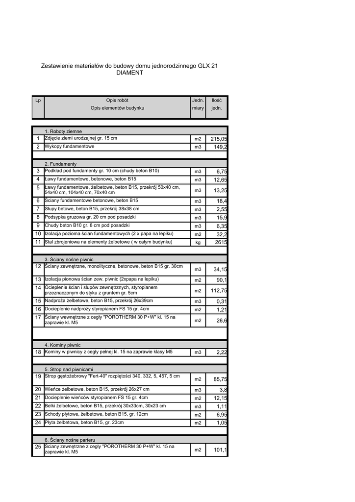 Zestawienie materiałów do budowy domu jednorodzinnego GLX 21