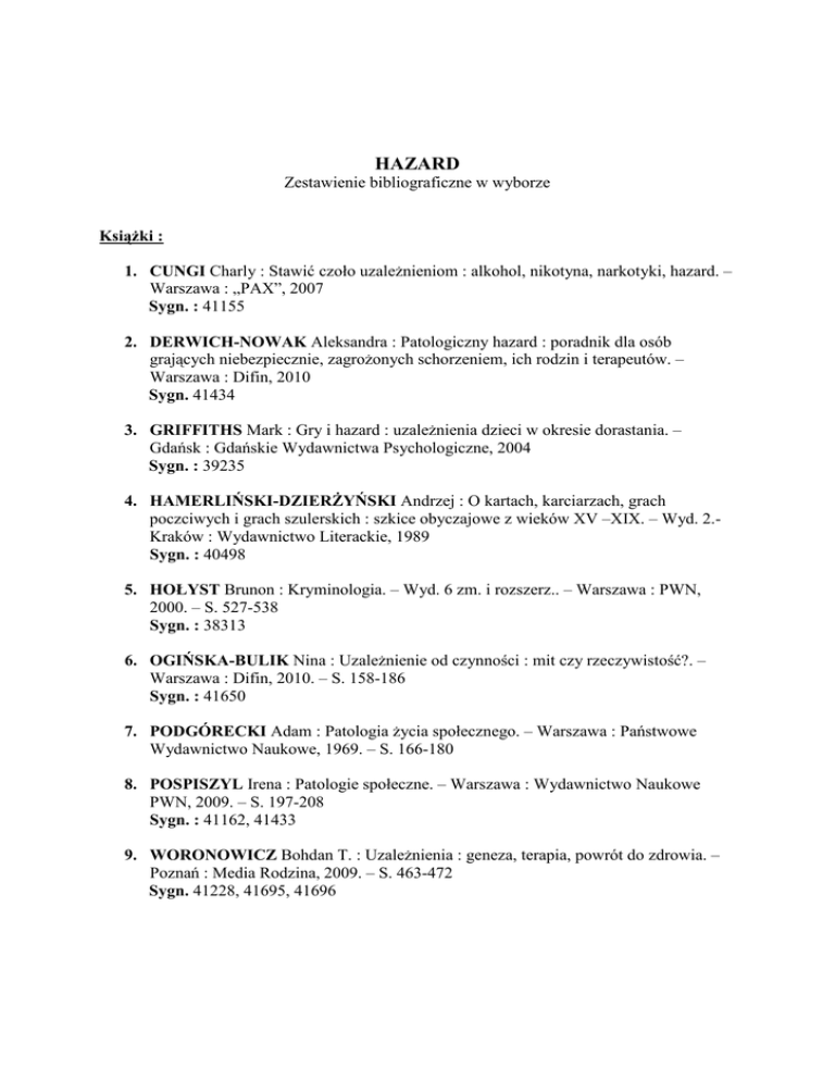 HAZARD Zestawienie bibliograficzne w wyborze Książki : 1. CUNGI Charly : Stawić czoło uzależnieniom : alkohol, nikotyna, narkotyki, hazard. – Warszawa : „PAX”, 2007 Sygn. : 41155 2. DERWICH-NOWAK Aleksandra : Patologiczny hazard : poradnik dla osób grających niebezpiecznie, zagrożonych schorzeniem, ich rodzin i terapeutów. – Warszawa : Difin, 2010 Sygn. 41434 3. GRIFFITHS Mark : Gry i hazard : uzależnienia dzieci w okresie dorastania. – Gdańsk : Gdańskie Wydawnictwa Psychologiczne, 2004 Sygn. : 39235 4. HAMERLIŃSKI-DZIERŻYŃSKI Andrzej : O kartach, karciarzach, grach poczciwych i grach szulerskich : szkice obyczajowe z wieków XV –XIX. – Wyd. 2.Kraków : Wydawnictwo Literackie, 1989 Sygn. : 40498 5. HOŁYST Brunon : Kryminologia. – Wyd. 6 zm. i rozszerz.. – Warszawa : PWN, 2000. – S. 527-538 Sygn. : 38313 6. OGIŃSKA-BULIK Nina : Uzależnienie od czynności : mit czy rzeczywistość?. – Warszawa : Difin, 2010. – S. 158-186 Sygn. : 41650 7. PODGÓRECKI Adam : Patologia życia społecznego. – Warszawa : Państwowe Wydawnictwo Naukowe, 1969. – S. 166-180 8. POSPISZYL Irena : Patologie społeczne. – Warszawa : Wydawnictwo Naukowe PWN, 2009. – S. 197-208 Sygn. : 41162, 41433 9. WORONOWICZ Bohdan T. : Uzależnienia : geneza, terapia, powrót do zdrowia. – Poznań : Media Rodzina, 2009. – S. 463-472 Sygn. 41228, 41695, 41696 Artykuły z czasopism : 1. HOFFMAN Beata : Nałogowy hazard jako przykład uzależnienia o charakterze niesubstancjonalnym. – Nowa Szkoła. – 2010, nr 2, s. 34-41 2. NAŁOGOWI hazardziści : Świat Problemów. – 2002, nr 7/8, s. 38-39 3. SIECZKOWSKA Małgorzata : Hazardzista – jaki to pacjent?. – Świat Problemów. – 2002, nr 7/8, s. 40-42 4. TUCHOLSKA Stanisława : Aktywność hazardowa dorastającej młodzieży. – Problemy Opiekuńczo-Wychowawcze. – 2008, nr 5, s. 14-20 5. ZAWORSKA-NIKONIUK Dorota : Uzależnienie niechemiczne jako nowe zagrożenie w rozwoju człowieka. – Wychowanie Na Co Dzień. – 2005, nr 10-11, s. 15-20 Oprac. na podstawie zbiorów BPT