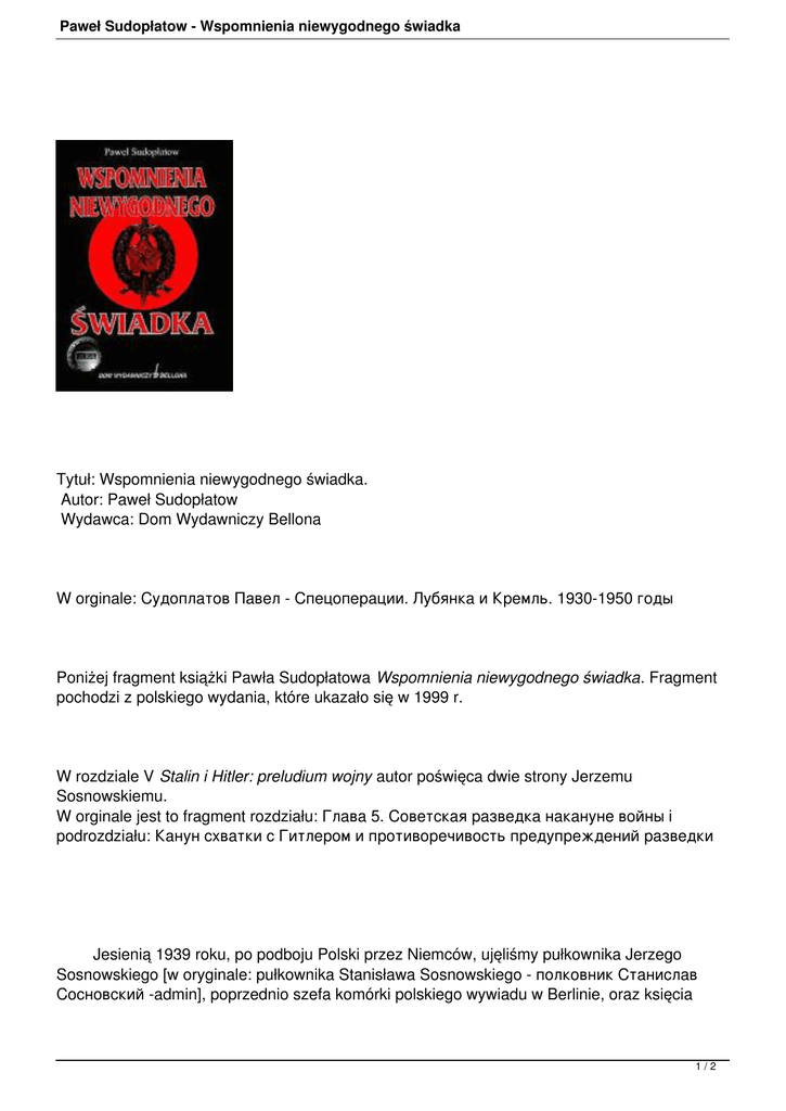 Paweł Sudopłatow - Wspomnienia niewygodnego świadka Tytuł: Wspomnienia niewygodnego świadka. Autor: Paweł Sudopłatow Wydawca: Dom Wydawniczy Bellona W orginale: Судоплатов Павел - Спецоперации. Лубянка и Кремль. 1930-1950 годы Poniżej fragment książki Pawła Sudopłatowa Wspomnienia niewygodnego świadka. Fragment pochodzi z polskiego wydania, które ukazało się w 1999 r. W rozdziale V Stalin i Hitler: preludium wojny autor poświęca dwie strony Jerzemu Sosnowskiemu. W orginale jest to fragment rozdziału: Глава 5. Советская разведка накануне войны i podrozdziału: Канун схватки с Гитлером и противоречивость предупреждений разведки Jesienią 1939 roku, po podboju Polski przez Niemców, ujęliśmy pułkownika Jerzego Sosnowskiego [w oryginale: pułkownika Stanisława Sosnowskiego - полковник Станислав Сосновский -admin], poprzednio szefa komórki polskiego wywiadu w Berlinie, oraz księcia 1/2 Paweł Sudopłatow - Wspomnienia niewygodnego świadka Janusza Radziwiłła , zamożnego i politycznie ustosunkowanego polskiego arystokratę. Obu przewieźliśmy na Łubiankę z poleceniem intensywnej pracy nad nimi, aby zwerbować jednego i drugiego do współpracy. Chcąc uchronić Zubowa, zaproponowałem Berii, żeby umieścił go w tej samej celi z pułkownikiem Sosnowskim. Zubow mówił płynnie po francusku, niemiecku i gruzińsku. Beria zgodził się i Zubow został zwolniony z więzienia Lefortowo, gdzie był niemiłosiernie bity na rozkaz swego byłego doinowego gościa Kobułowa. Torturował Zubowa sławetny B. W. Rodos, który zmiażdżył mu kolana młotem. Zubow został inwalidą, ale nie przyznał się. Siergienko, szef Oddziału Śledczego, nawet wówczas sprzeciwił się przeniesieniu Zubowa z Lefortowa, gdy wyjaśniłem mu, że chodzi 0 operacyjne wykorzystanie oficera na rozkaz Berii. Siergienko odmówił i powiedział: „Osobiście zamelduję o tym Berii. Ten łajdak Zubow odmówił przyznania się, chociaż uczestniczył w najcięższej zbrodni, nie wypełniając bezpośredniego polecenia kierownictwa kraju”. Powiedziałem Berii, że Siergienko odmówił wykonania rozkazów. Beria w mojej obecności zaczął telefonicznie besztać Siergienkę. Stwierdził, że skróci go o głowę, jeśli w ciągu piętnastu minut rozkaz wydany w jego imieniu nie zostanie wykonany. Siergienko próbował usprawiedliwić swoje "działania, ale Beria przerwał mu bez słuchania odpowiedzi. W ogóle Beria zachowywał się wyjątkowo obcesowo wobec podwładnych wysokiej rangi. Gdy rozmawiał z nie znanymi mu urzędnikami, zawsze był uprzejmy i grzeczny. Po prostu w systemie radzieckim takie były zasady. Grubiaństwo okazywano tylko wobec personelu najwyższego rangą. Przed prostymi ludźmi członkowie Politbiura zachowywali się jak porządni towarzysze. Zubow zwerbował Sosnowskiego przekonując go, że ani w polskim, ani w niemieckim wywiadzie nie ma dla niego przyszłości i powinien współpracować z wywiadem rosyjskim. W latach trzydziestych Sosnowski jako polski rezydent w Berlinie z sukcesami kierował siatką agentów. Był polskim arystokratą. Do niego należały stadniny koni w Berlinie, a swoich agentów, przeważnie atrakcyjne kobiety, lokował w siedzibach partii nazistowskiej i sekretariacie ministra spraw zagranicznych. Do 1935 roku Gestapo wyłapało większość jego agentów i aresztowało Sosnowskiego pod zarzutem szpiegostwa. Przesłuchującym go na Łubiance powiedział, że w jego obecności agenci zostali ścięci w więzieniu Plötzensee. On zaś został wymieniony za przywódcę niemieckiej mniejszości w Polsce, oskarżonego o szpiegostwo. Za sprzeniewierzenie funduszy państwowych sąd wojskowy w Warszawie skazał Sosnowskiego w 1937 roku na karę więzienia we wschodniej Polsce. Gdy w 1939 roku nasze wojska zajęły to więzienie, Armia Czerwona przekazała go NKWD. Od Sosnowskiego dowiedzieliśmy się, że dwóch jego agentów wciąż działa. On też pierwszy podsunął nam myśl, że książę Radziwiłł mógł pośredniczyć między polskim kierownictwem i Hermannem Göringiem, zastępcą Hitlera. Sosnowski zaczął z nami współpracować, kiedy przedstawiliśmy mu dowody, że wszystko o nim wiemy. Ale on też dużo wiedział i nie mogliśmy wypuścić go spod kontroli. Dwa z jego źródeł informacji w Niemczech były dla nas użyteczne w 1940 roku i pierwszych dwóch latach Wielkiej Wojny Ojczyźnianej. Zubow docenił potencjalną wartość wywiadowczą Sosnowskiego i pomógł go zwerbować, toteż zaproponowałem wykorzystanie go jako współwięźnia dla księcia Radziwiłła. Beria zgodził się i Zubow siedział przez miesiąc z Radziwiłłem. 2/2