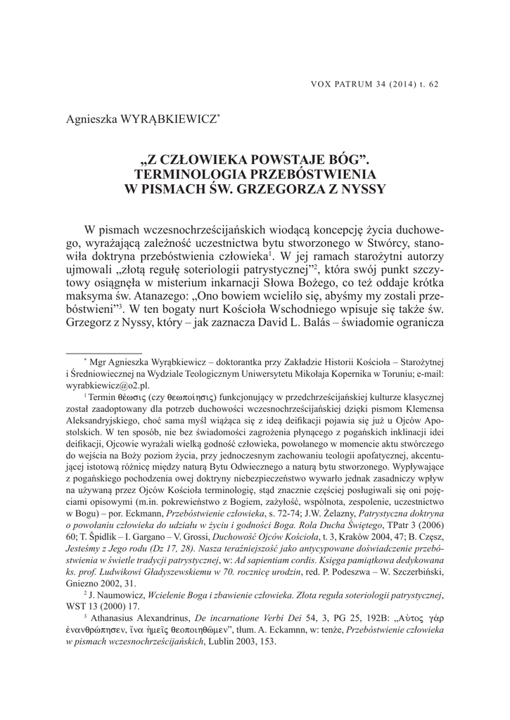 V O X PAT R U M 3 4 ( 2 0 1 4 ) t . 6 2 Agnieszka WYRĄBKIEWICZ* „Z CZŁOWIEKA POWSTAJE BÓG”. TERMINOLOGIA PRZEBÓSTWIENIA W PISMACH ŚW. GRZEGORZA Z NYSSY W pismach wczesnochrześcijańskich wiodącą koncepcję życia duchowego, wyrażającą zależność uczestnictwa bytu stworzonego w Stwórcy, stanowiła doktryna przebóstwienia człowieka1. W jej ramach starożytni autorzy ujmowali „złotą regułę soteriologii patrystycznej”2, która swój punkt szczytowy osiągnęła w misterium inkarnacji Słowa Bożego, co też oddaje krótka maksyma św. Atanazego: „Ono bowiem wcieliło się, abyśmy my zostali przebóstwieni”3. W ten bogaty nurt Kościoła Wschodniego wpisuje się także św. Grzegorz z Nyssy, który – jak zaznacza David L. Balás – świadomie ogranicza Mgr Agnieszka Wyrąbkiewicz – doktorantka przy Zakładzie Historii Kościoła – Starożytnej i Średniowiecznej na Wydziale Teologicznym Uniwersytetu Mikołaja Kopernika w Toruniu; e-mail: [email protected]. 1 Termin qšwsij (czy qewpo…hsij) funkcjonujący w przedchrześcijańskiej kulturze klasycznej został zaadoptowany dla potrzeb duchowości wczesnochrześcijańskiej dzięki pismom Klemensa Aleksandryjskiego, choć sama myśl wiążąca się z ideą deifikacji pojawia się już u Ojców Apostolskich. W ten sposób, nie bez świadomości zagrożenia płynącego z pogańskich inklinacji idei deifikacji, Ojcowie wyrażali wielką godność człowieka, powołanego w momencie aktu stwórczego do wejścia na Boży poziom życia, przy jednoczesnym zachowaniu teologii apofatycznej, akcentującej istotową różnicę między naturą Bytu Odwiecznego a naturą bytu stworzonego. Wypływające z pogańskiego pochodzenia owej doktryny niebezpieczeństwo wywarło jednak zasadniczy wpływ na używaną przez Ojców Kościoła terminologię, stąd znacznie częściej posługiwali się oni pojęciami opisowymi (m.in. pokrewieństwo z Bogiem, zażyłość, wspólnota, zespolenie, uczestnictwo w Bogu) – por. Eckmann, Przebóstwienie człowieka, s. 72-74; J.W. Żelazny, Patrystyczna doktryna o powołaniu człowieka do udziału w życiu i godności Boga. Rola Ducha Świętego, TPatr 3 (2006) 60; T. Špidlik – I. Gargano – V. Grossi, Duchowość Ojców Kościoła, t. 3, Kraków 2004, 47; B. Częsz, Jesteśmy z Jego rodu (Dz 17, 28). Nasza teraźniejszość jako antycypowane doświadczenie przebóstwienia w świetle tradycji patrystycznej, w: Ad sapientiam cordis. Księga pamiątkowa dedykowana ks. prof. Ludwikowi Gładyszewskiemu w 70. rocznicę urodzin, red. P. Podeszwa – W. Szczerbiński, Gniezno 2002, 31. 2 J. Naumowicz, Wcielenie Boga i zbawienie człowieka. Złota reguła soteriologii patrystycznej, WST 13 (2000) 17. 3 Athanasius Alexandrinus, De incarnatione Verbi Dei 54, 3, PG 25, 192B: „AÙtoj g£r ™nanqrèphsen, †na ¹me‹j qeopoihqîmen”, tłum. A. Eckamnn, w: tenże, Przebóstwienie człowieka w pismach wczesnochrześcijańskich, Lublin 2003, 153. * 564 AGNIESZKA WYRĄBKIEWICZ się do wyraźnej nauki4, co wiąże się ze stosunkowo rzadko używaną przez niego terminologią przebóstwienia. Mimo to, wśród grona badaczy duchowej spuścizny Nysseńczyka, kilku5 nie wahało się określić go głównie jako propagatora doktryny deifikacji. Zasadnym więc jawi się pytanie o językowe narzędzia służące do wyrażenia schematu przebóstwienia, stąd niniejszy artykuł stawia sobie za cel scharakteryzowanie podstawowej siatki terminologicznej procesu qšwsij6 stosowanej przez św. Grzegorza z Nyssy, Kapadockiego filozofa i mistyka7. I. CZASOWNIKOWE WYRAŻENIA DEIFIKACJI VS. TEOLOGIA APOFATYCZNA Szczególnie ważne miejsce w pismach Grzegorza dotyczących deifikacji zajmują wyrażenia czasownikowe: qeopoišw, qeÒw oraz sunapoqeÒw, ponieważ Nysseńczyk, zachowując ortodoksyjną apofatyczną teologię Wschodu, nigdy nie używa terminu „przebóstwienie” (qšwsij czy qewpo…hsij) w sposób dosłowny, rzeczownikowy8. Wśród trzech wyżej wymienionych czasowników, tworzących trzon siatki pojęciowej przebóstwienia u Kapadocczyka, jeden odnosi się wyłącznie do aspektu chrystologicznego deifikacji 4 Por. D.L. Balás, Deification, w: The Brill Dictionary of Gregory of Nyssa, ed. L.F. Mateo-Seco – G. Maspero, VigCh Supplements 99, Leiden 2010, 210-213. 5 M.in. D.L. Balás, Μετουσία θεοῦ. Man’s Participation in God’s Perfections According to Saint Gregory of Nyssa, Studia Anselmiana 55, Rome 1966; tenże, Christian Transformation of Greek Philosophy Illustrated by Gregory of Nyssa’s Use of the Notion of Participatuion, „Proceedings of the American Catholic Philosophical Association” 40 (1966) 152-157; B.E. Daley, „Heavenly Man” and „Eternal Christ”: Apollinarius and Gregory of Nyssa on the Personal Identity of the Savior, JECS 10 (2002) 469-488. Por. N. Russell, The doctrine of deification in the Greek patristic tradition, Oxford 2006, 226. 6 Na temat aspektu trynitarnego, chrystocentrycznego i antropologicznego, epektazy lub zarysowania idei deifikacji na tle apofatycznego nauczania Nysseńczyka zob. Daniélou, Platonisme et théologie mistique; Balás, Deification, s. 210-213; J. Rother, Gottverähnlichung als ein Weg zur Gotteinigung beim hl. Gregor von Nyssa, w: Gregory of Nyssa, Homilies on the Beatitudes, ed. H.R. Drobner – A. Viciano, VigCh Supplements 52, Leiden 2000, 507-568; H. Merki, ҅Ομοιωσις Θεῳ: von der platonischen Angleichung an Gott zur Gottähnlichkeit bei Gregor von Nyssa, Freiburg in der Schweiz 1952; W. Szczerba, A Bóg będzie wszystkim we wszystkim… Apokatastaza Grzegorza z Nyssy: tło, źródła, kształt koncepcji, Kraków 2008; tenże, Problem przebóstwienia na tle apofatycznej teologii Grzegorza z Nyssy, „Filozofia religii” 5 (2009) 283-299; M. Przyszychowska, Nauka o łasce w dziełach świętego Grzegorza z Nyssy, Kraków 2010. Również E. Kotkowska (Pomyśleć świat jako całość) rozważa problem przeb