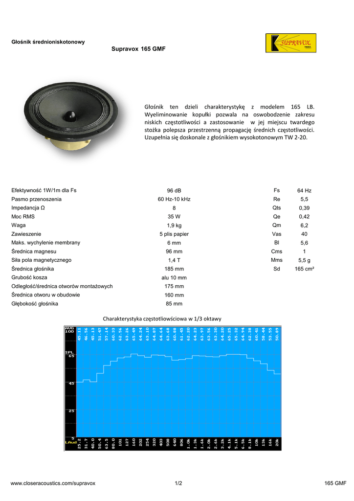 Głośnik średnioniskotonowy Supravox 165 GMF Głośnik ten dzieli charakterystykę z modelem 165 LB. Wyeliminowanie kopułki pozwala na oswobodzenie zakresu niskich częstotliwości a zastosowanie w jej miejscu twardego stożka polepsza przestrzenną propagację średnich częstotliwości. Uzupełnia się doskonale z głośnikiem wysokotonowym TW 2-20. Efektywność 1W/1m dla Fs Pasmo przenoszenia Impedancja Ω 96 dB Fs 64 Hz 60 Hz-10 kHz Re 5,5 8 Qts 0,39 Moc RMS 35 W Qe 0,42 Waga 1,9 kg Qm 6,2 Zawieszenie 5 plis papier Vas 40 Maks. wychylenie membrany 6 mm Bl 5,6 Średnica magnesu 96 mm Cms 1 1,4 T Mms 5,5 g 185 mm Sd 165 cm² Siła pola magnetycznego Średnica głośnika Grubość kosza alu 10 mm Odległość/średnica otworów montażowych 175 mm Średnica otworu w obudowie 160 mm Głębokość głośnika 85 mm Charakterystyka częstotliowściowa w 1/3 oktawy Charakterystyka w paśmie od 200 Hz do 20 kHz 30° od osi www.closeracoustics.com/supravox 1/2 165 GMF Charakterystyka w paśmie od 200 Hz do 20 kHz w osi Charakterystyka w paśmie od 200 Hz do 20 kHz 30° od osi Charakterystyka w paśmie od 200 Hz do 20 kHz 60° od osi Odtwarzanie impulsu Wykres wodospadowy Impedancja www.closeracoustics.com/supravox 2/2 165 GMF