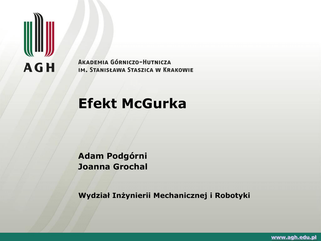 Efekt McGurka Adam Podgórni Joanna Grochal Wydział Inżynierii Mechanicznej i Robotyki www.agh.edu.pl Trochę o sposobie rozumienia mowy przez mózg człowieka: • W tym procesie biorą udział dwa zmysły: wzrok i słuch • Zmysł słuchu pozwala analizować to, co jest wypowiadane, wzrok – w jaki sposób (mimika, wyraz twarzy, przede wszystkim ruch warg) • Z dwóch informacji nasz mózg tworzy „właściwą” mowę www.agh.edu.pl Co się stanie, jeśli oszukamy mózg i podamy mu sprzeczne informacje? Co się stanie, jeśli oszukamy mózg i podamy mu sprzeczne informacje? • Mózg będzie próbował połączyć dwa rozbieżne bodźce w jeden, tworząc w ten sposób iluzję słuchową – efekt McGurka Efekt McGurka – „słyszenie oczami” www.agh.edu.pl Jak został odkryty efekt McGurka? • Odkrycie jest wynikiem przypadku – Harry McGurk wraz ze swoim asystentem MacDonaldem poprosili technika, aby podłożył pod wideo inne fonemy niż te, które były oryginalnie nagrane na ścieżce. Po odtworzeniu zmodyfikowanego nagrania oboje usłyszeli trzeci, zupełnie inny fonem. • Efekt został po raz pierwszy opisany w pracy McGurka i MacDonalda „Hearing Lips and Seeing Voices” w 1976 r. Przykład efektu McGurka https://www.youtube.com/watch?v=_UzWeZZ9XeQ Przykład efektu McGurka http://youtu.be/FefFfvriAwQ?t=2m31s Kto jest odporniejszy na działanie efektu McGurka? • • • • Dyslektycy Chorzy na Alzheimera Schizofrenicy Dzieci z zaburzeniami ze spektrum autyzmu • Osoby z zaburzeniami afatycznymi • Osoby często oglądające filmy z dubbingiem Garść ciekawostek • Działania efektu McGurka nie mogą uniknąć nawet osoby badające efekt ten od lat • Intensywność działania efektu zależy od języka: mocniej w j. angielskim, niemieckim, holenderskim, hiszpańskim; słabiej w japońskim, chińskim • Znajomość twarzy mówcy zmniejsza podatność słuchacza na efekt McGurka Garść ciekawostek • Efekt McGurka nie wystąpi, jeśli słuchacz nie skupia się na twarzy mówcy • Działanie efektu McGurka można zaobserwować już u 4-miesięcznych dzieci Dziękujemy za uwagę! Źródła: • http://gadzetomania.pl/10557,efektmcgurka-przekonaj-sie-jak-oczy-oszukujatwoje-uszy • http://en.wikipedia.org/wiki/McGurk_effect