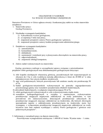 OGŁOSZENIE O NABORZE NA WOLNE STANOWISKO URZĘDNICZE Starostwo Powiatowe w Górze ogłasza otwarty i konkurencyjny nabór na wolne stanowisko urzędnicze. 1. Stanowisko pracy: Geolog Powiatowy. 2. Niezbędne wymagania kandydatów: 1) wykształcenie wyższe geologiczne, 2) co najmniej 5 letni staż pracy, 3) znajomość przepisów ustawy Prawo geologiczne i górnicze, 4) znajomość przepisów ustawy kodeks postępowania administracyjnego. 3. Dodatkowe wymagania kandydatów: 1) samodzielność, 2) komunikatywność, 3) dokładność, 4) sumienność i rzetelność przy wykonywaniu obowiązków na stanowisku pracy, 5) odpowiedzialność, 6) znajomość obsługi komputera. 4. Zakres zadań wykonywanych na stanowisku: Geolog powiatowy realizuje w szczególności sprawy związane z zatwierdzaniem projektów robót geologicznych oraz dokumentacjami geologicznymi dotyczące: 1) złóż kopalin nieobjętych własnością górniczą, poszukiwanych lub rozpoznawanych na obszarze do 2 ha w celu wydobycia metodą odkrywkową w ilości do 20 000 m3 w roku kalendarzowym i bez użycia środków strzałowych, 2) ujęć wód podziemnych, których przewidywane lub ustalone zasoby nie przekraczają 50 m3/h, 3) badań geologiczno-inżynierskich wykonywanych na potrzeby zagospodarowania przestrzennego gminy oraz warunków posadawiania obiektów budowlanych, 4) odwodnień budowlanych o wydajności nieprzekraczającej 50 m3/h, 5) robót geologicznych wykonywanych w celu wykorzystywania ciepła ziemi, 6) warunków hydrogeologicznych w związku z zamierzonym wykonywaniem przedsięwzięć mogących negatywnie oddziaływać na wody podziemne, w tym powodować ich zanieczyszczenie, dotyczących przedsięwzięć zaliczonych do przedsięwzięć mogących znacząco oddziaływać na środowisko, dla których obowiązek sporządzenia raportu o oddziaływaniu przedsięwzięcia na środowisko może być wymagany, z wyłączeniem przedsięwzięć mogących negatywnie oddziaływać na wody lecznicze oraz inne zadania wynikające z ustawy Prawo geologiczne i górnicze oraz pokrewnych przepisów”. 5. Informacja o warunkach pracy na danym stanowisku: Przewidywane wynagrodzenie miesięczne: 1.600.00 zł. brutto. Wymiar etatu – ½ etatu. 1 6. W miesiącu poprzedzającym datę upublicznienia ogłoszenia wskaźnik zatrudnienia osób niepełnosprawnych w Starostwie Powiatowym w rozumieniu przepisów o rehabilitacji zawodowej i społecznej oraz zatrudnianiu osób niepełnosprawnych wynosi co najmniej 6%. 7. Wymagane dokumenty 1) list motywacyjny, 2) CV z informacjami o wykształceniu i opisem dotychczasowego przebiegu pracy zawodowej, 3) kserokopie świadectw pracy, 4) kserokopie dokumentów potwierdzających wykształcenie, 5) kserokopie zaświadczeń o ukończonych kursach, szkoleniach, 6) oryginał kwestionariusza osobowego osoby ubiegającej się o zatrudnienie, 7) własnoręcznie podpisane oświadczenie kandydata, że posiada pełną zdolność do czynności prawnych oraz korzysta z pełni praw publicznych, 8) własnoręcznie podpisane oświadczenie kandydata, że nie był skazany prawomocnym wyrokiem sądu za umyślne przestępstwo ścigane z oskarżenia publicznego lub umyślne przestępstwo skarbowe, wyłoniony w wyniku naboru kandydat zobowiązany będzie przed nawiązaniem stosunku pracy do przedłożenia zaświadczenia z Krajowego Rejestru Skazanych, 9) własnoręcznie podpisane oświadczenie kandydata, że jego stan zdrowia umożliwia mu zatrudnienie na stanowisku Geologa Powiatowego, 10) oświadczenia potwierdzające zgodność z oryginałem wszystkich przedłożonych kserokopii dokumentów 8. Miejsce i termin złożenia dokumentów Wymagane dokumenty aplikacyjne należy składać w zaklejonej kopercie w siedzibie Starostwa Powiatowego w Górze na adres Starostwo Powiatowe w Górze, ul Mickiewicza 1, 56 – 200 Góra. Dokumenty mogą być złożone pocztą elektroniczną na adres: [email protected] w przypadku posiadanych uprawnień do podpisu elektronicznego. Dokumenty muszą być złożone z dopiskiem na kopercie: „Dotyczy naboru na stanowisko Geologa Powiatowego”. Wymagane dokumenty aplikacyjne należy składać w terminie do dnia 03.08.2012 r. Aplikacje, które wpłyną do Starostwa po wyżej określonym terminie nie będą rozpatrywane, decyduje data faktycznego wpływu do urzędu. Informacja o wyniku naboru będzie umieszczona na stronie internetowej BIP oraz na tablicy informacyjnej Starostwa Powiatowego. Wymagane dokumenty aplikacyjne (list motywacyjny, CV) powinny być opatrzone klauzulą: - Wyrażam zgodę na przetwarzanie moich danych osobowych zawartych w ofercie pracy dla potrzeb niezbędnych do realizacji procesu rekrutacji zgodnie z ustawą z dnia 29.08.1997 o ochronie danych osobowych (Dz.U. z 2002r. Nr 101, poz. 926 z późn. zm.) oraz ustawą z dnia 21 listopada 2008 r. o pracownikach samorządowych (Dz.U Nr 223, poz. 1458 ze zm.) 2