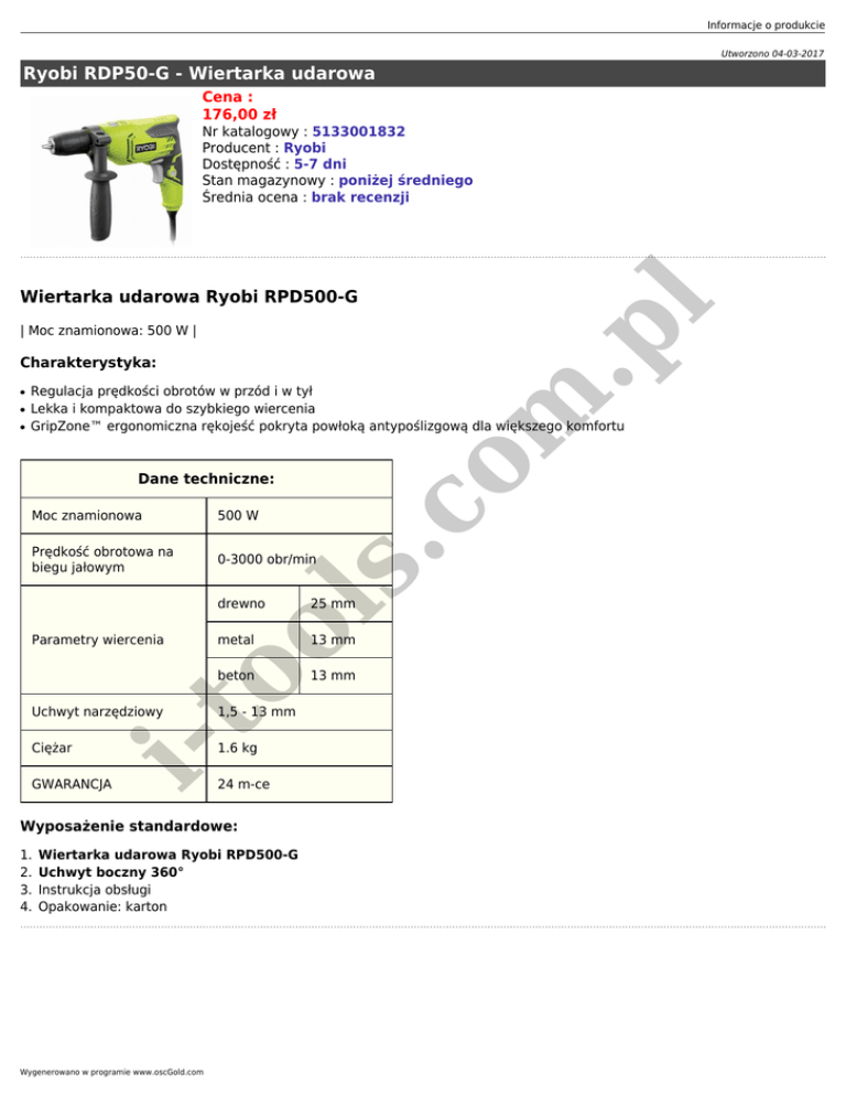 Informacje o produkcie Utworzono 04-03-2017 Ryobi RDP50-G - Wiertarka udarowa Cena : 176,00 zł Wiertarka udarowa Ryobi RPD500-G | Moc znamionowa: 500 W | Charakterystyka: ● ● Regulacja prędkości obrotów w przód i w tył Lekka i kompaktowa do szybkiego wiercenia GripZone™ ergonomiczna rękojeść pokryta powłoką antypoślizgową dla większego komfortu co ● m .p l Nr katalogowy : 5133001832 Producent : Ryobi Dostępność : 5-7 dni Stan magazynowy : poniżej średniego Średnia ocena : brak recenzji Dane techniczne: 500 W Prędkość obrotowa na biegu jałowym 0-3000 obr/min Parametry wiercenia metal 13 mm beton 13 mm 1,5 - 13 mm Ciężar 1.6 kg i- Uchwyt narzędziowy GWARANCJA 24 m-ce Wyposażenie standardowe: 1. 2. 3. 4. 25 mm to ol drewno s. Moc znamionowa Wiertarka udarowa Ryobi RPD500-G Uchwyt boczny 360° Instrukcja obsługi Opakowanie: karton Wygenerowano w programie www.oscGold.com