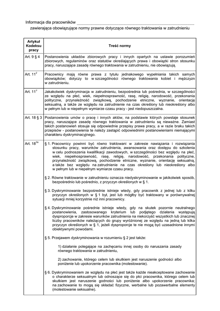 Informacja dla pracowników ........................................................................................................ zawierająca obowiązujące normy prawne dotyczące równego traktowania w zatrudnieniu Artykuł Kodeksu pracy Art. 9 § 4 Treść normy Postanowienia układów zbiorowych pracy i innych opartych na ustawie porozumień zbiorowych, regulaminów oraz statutów określających prawa i obowiązki stron stosunku pracy, naruszające zasadę równego traktowania w zatrudnieniu, nie obowiązują. 2 Pracownicy mają równe prawa z tytułu jednakowego wypełniania takich samych obowiązków; dotyczy to w szczególności równego traktowania kobiet i mężczyzn w zatrudnieniu. 3 Jakakolwiek dyskryminacja w zatrudnieniu, bezpośrednia lub pośrednia, w szczególności ze względu na płeć, wiek, niepełnosprawność, rasę, religię, narodowość, przekonania polityczne, przynależność związkową, pochodzenie etniczne, wyznanie, orientację seksualną, a także ze względu na zatrudnienie na czas określony lub nieokreślony albo w pełnym lub w niepełnym wymiarze czasu pracy - jest niedopuszczalna. Art. 11 Art. 11 Art. 18 § 3 Postanowienia umów o pracę i innych aktów, na podstawie których powstaje stosunek pracy, naruszające zasadę równego traktowania w zatrudnieniu są nieważne. Zamiast takich postanowień stosuje się odpowiednie przepisy prawa pracy, a w razie braku takich przepisów - postanowienia te należy zastąpić odpowiednimi postanowieniami niemającymi charakteru dyskryminacyjnego. 3a Art. 18 § 1. Pracownicy powinni być równo traktowani w zakresie nawiązania i rozwiązania stosunku pracy, warunków zatrudnienia, awansowania oraz dostępu do szkolenia w celu podnoszenia kwalifikacji zawodowych, w szczególności bez względu na płeć, wiek, niepełnosprawność, rasę, religię, narodowość, przekonania polityczne, przynależność związkową, pochodzenie etniczne, wyznanie, orientację seksualną, a także bez względu na zatrudnienie na czas określony lub nieokreślony albo w pełnym lub w niepełnym wymiarze czasu pracy. § 2. Równe traktowanie w zatrudnieniu oznacza niedyskryminowanie w jakikolwiek sposób, bezpośrednio lub pośrednio, z przyczyn określonych w § 1. § 3. Dyskryminowanie bezpośrednie istnieje wtedy, gdy pracownik z jednej lub z kilku przyczyn określonych w § 1 był, jest lub mógłby być traktowany w porównywalnej sytuacji mniej korzystnie niż inni pracownicy. § 4. Dyskryminowanie pośrednie istnieje wtedy, gdy na skutek pozornie neutralnego postanowienia, zastosowanego kryterium lub podjętego działania występują dysproporcje w zakresie warunków zatrudnienia na niekorzyść wszystkich lub znacznej liczby pracowników należących do grupy wyróżnionej ze względu na jedną lub kilka przyczyn określonych w § 1, jeżeli dysproporcje te nie mogą być uzasadnione innymi obiektywnymi powodami. § 5. Przejawem dyskryminowania w rozumieniu § 2 jest także: 1) działanie polegające na zachęcaniu innej osoby do naruszania zasady równego traktowania w zatrudnieniu, 2) zachowanie, którego celem lub skutkiem jest naruszenie godności albo poniżenie lub upokorzenie pracownika (molestowanie). § 6. Dyskryminowaniem ze względu na płeć jest także każde nieakceptowane zachowanie o charakterze seksualnym lub odnoszące się do płci pracownika, którego celem lub skutkiem jest naruszenie godności lub poniżenie albo upokorzenie pracownika; na zachowanie to mogą się składać fizyczne, werbalne lub pozawerbalne elementy (molestowanie seksualne). 3b Art. 18 § 1. Za naruszenie zasady równego traktowania w zatrudnieniu, z zastrzeżeniem § 2-4, uważa się różnicowanie przez pracodawcę sytuacji pracownika z jednej lub kilku 3a przyczyn określonych w art. 18 § 1, którego skutkiem jest w szczególności: 1) odmowa nawiązania lub rozwiązanie stosunku pracy, 2) niekorzystne ukształtowanie wynagrodzenia za pracę lub innych warunków zatrudnienia albo pominięcie przy awansowaniu lub przyznawaniu innych świadczeń związanych z pracą, 3) pominięcie przy typowaniu do udziału w szkoleniach podnoszących kwalifikacje zawodowe - chyba że pracodawca udowodni, że kierował się obiektywnymi powodami. § 2. Zasady równego traktowania w zatrudnieniu nie naruszają działania polegające na: 1) niezatrudnianiu pracownika z jednej lub kilku przyczyn określonych w art. 3a 18 § 1, jeżeli jest to uzasadnione ze względu na rodzaj pracy, warunki jej wykonywania lub wymagania zawodowe stawiane pracownikom, 2) wypowiedzeniu pracownikowi warunków zatrudnienia w zakresie wymiaru czasu pracy, jeżeli jest to uzasadnione przyczynami niedotyczącymi pracowników, 3) stosowaniu środków, które różnicują sytuację prawną pracownika ze względu na ochronę rodzicielstwa, wiek lub niepełnosprawność pracownika, 4) ustalaniu warunków zatrudniania i zwalniania pracowników, zasad wynagradzania i awansowania oraz dostępu do szkolenia w celu podnoszenia kwalifikacji zawodowych – z uwzględnieniem kryterium stażu pracy. § 3. Nie stanowią naruszenia zasady równego traktowania w zatrudnieniu działania podejmowane przez określony czas, zmierzające do wyrównywania szans wszystkich lub znacznej liczby pracowników wyróżnionych z jednej lub kilku przyczyn określonych 3a w art. 18 § 1, przez zmniejszenie na korzyść takich pracowników faktycznych nierówności, w zakresie określonym w tym przepisie. § 4. Różnicowanie pracowników ze względu na religię lub wyznanie nie stanowi naruszenia zasady równego traktowania w zatrudnieniu, jeżeli w związku z rodzajem i charakterem działalności prowadzonej w ramach kościołów i innych związków wyznaniowych, a także organizacji, których cel działania pozostaje w bezpośrednim związku z religią lub wyznaniem, religia lub wyznanie pracownika stanowi istotne, uzasadnione i usprawiedliwione wymaganie zawodowe. 3c Art. 18 § 1. Pracownicy mają 