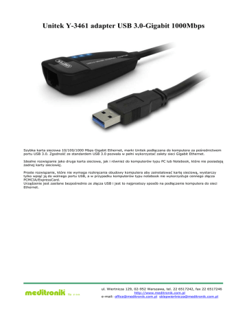 Unitek Y-3461 adapter USB 3.0-Gigabit 1000Mbps Szybka karta sieciowa 10/100/1000 Mbps Gigabit Ethernet, marki Unitek podłączana do komputera za pośrednictwem portu USB 3.0. Zgodność ze standardem USB 3.0 pozwala w pełni wykorzystać zalety sieci Gigabit Ethernet. Idealne rozwiązanie jako druga karta sieciowa, jak i również do komputerów typu PC lub Notebook, które nie posiadają żadnej karty sieciowej. Proste rozwiązanie, które nie wymaga rozkręcania obudowy komputera aby zainstalować kartę sieciową, wystarczy tylko wpiąć ją do wolnego portu USB, a w przypadku komputerów typu notebook nie wykorzystuje cennego złącza PCMCIA/ExpressCard. Urządzenie jest zasilane bezpośrednio ze złącza USB i jest to najprostszy sposób na podłączenie komputera do sieci Ethernet. ul. Wiertnicza 129, 02-952 Warszawa, tel. 22 6517242, fax 22 6517246 http://www.meditronik.com.pl e-mail: [email protected] [email protected]