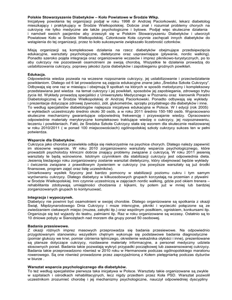 Polskie Stowarzyszenie Diabetyków – Koło Powiatowe w Środzie Wlkp. Inicjatywę powołania tej organizacji podjął w roku 1998 dr Andrzej Paciorkowski, lekarz diabetolog mieszkający i praktykujący w Środzie Wielkopolskiej. Dobrze znał i rozumiał problemy chorych na cukrzycę nie tylko medyczne ale takŜe psychologiczne i bytowe. Podjął więc skuteczne działania i namówił swoich pacjentów aby zrzeszyli się w Polskim Stowarzyszeniu Diabetyków i utworzyli Powiatowe Koło w Środzie Wielkopolskiej. Członkowie Koła czynnie zachęcali innych diabetyków do wstąpienia do tej organizacji, przez to koło sukcesywnie zwiększało liczebność członków. Misją organizacji są kompleksowe działania na rzecz diabetyków obejmujące przedsięwzięcia edukacyjne, warsztaty psychologiczne, dietetyczne oraz usprawniające (pływanie, nordic walking). Ponadto szeroko pojęta integracja oraz organizowanie wczasów i imprez piknikowo-turystycznych, po to aby cukrzycy nie pozostawali osamotnieni ze swoją chorobą. Wszystkie te działania prowadzą do ustabilizowania cukrzycy, poprawy jakości Ŝycia diabetyków i zapobieganiu groźnych powikłań. Edukacja. Odpowiednia wiedza pozwala na wczesne rozpoznanie cukrzycy, jej ustabilizowanie i przeciwdziałanie powikłaniom. Dlatego od 6 lat prowadzone są zajęcia edukacyjne znane jako „Średzka Szkoła Cukrzycy”. Odbywają się one raz w miesiącu i obejmują 9 spotkań na których w sposób metodyczny i kompleksowy przedstawiana jest wiedza na temat cukrzycy i jej powikłań, sposobów jej zapobiegania, zdrowego trybu Ŝycia itd. Wykłady prowadzą specjaliści z Uniwersytetu Medycznego w Poznaniu oraz kierownik Poradni Diabetologicznej w Środzie Wielkopolskiej dr Andrzej Paciorkowski. Ponadto odbywają się wykłady i prezentacje dotyczące zdrowej Ŝywności, ziół, glukometrów, sprzętu przydatnego dla diabetyków i inne. To według specjalistów diabetologów najlepsza inicjatywa edukacyjna w Polsce. W I edycji (rok 2005) w wykładach uczestniczyło średnio około 30 osób, a w roku 2011 średnio 150-180 osób. Wypracowano skuteczne mechanizmy gwarantujące odpowiednią frekwencję i przyswajanie wiedzy. Opracowano odpowiednie materiały merytoryczne kompleksowo traktujące wiedzę o cukrzycy, jej rozpoznawaniu, leczeniu i powikłaniach. Fakt, Ŝe Średzka Szkoła Cukrzycy stała się wzorem dla skutecznie realizowanej w roku 2010/2011 ( w ponad 100 miejscowościach) ogólnopolskiej szkoły cukrzycy sukces ten w pełni potwierdza. Wsparcie dla Diabetyków. Cukrzyca jako choroba przewlekła odbija się niekorzystnie na psychice chorych. Dlatego naleŜy zapewnić im stosowne wsparcie. W roku 2010 zorganizowano warsztaty wsparcia psychologicznego, które prowadzili psycholodzy kliniczni dobrze znający problemy związane z cukrzycą. W roku 2011 jesienią warsztaty te będą wznowione. Istotnym czynnikiem dla stabilizacji cukrzycy jest odpowiednia dieta. Jesienią bieŜącego roku zorganizowany zostanie warsztat dietetyczny, który obejmować będzie wykłady i ćwiczenia związane z prawidłowym Ŝywieniem w cukrzycy (na powyŜsze warsztaty są juŜ środki finansowe, program zajęć oraz listę uczestników). Umiarkowany wysiłek fizyczny jest bardzo pomocny w stabilizacji poziomu cukru i tym samym wyrównaniu cukrzycy. Dlatego diabetycy w kilkuosobowych grupach korzystają na przemian z pływalni w Środzie Wielkopolskiej. Inni czynnie uczestniczą w zajęciach nordic walking, gdzie pod okiem trenera – rehabilitanta zdobywają umiejętności chodzenia z kijkami, by potem juŜ w mniej lub bardziej zorganizowanych grupach to kontynuować. Integracja i wypoczynek. Diabetycy nie powinni być osamotnieni w swojej chorobie. Dlatego organizowane są spotkania z okazji Świąt, Międzynarodowego Dnia Cukrzycy i msze intencyjne, pikniki i wycieczki połączone są ze zwiedzaniem ciekawych miejsc (muzea, zabytki itp.) oraz wspólnym posiłkiem, ogniskiem, konkursami itp. Organizuje się teŜ wyjazdy do teatru, palmiarni itp. Raz w roku organizowane są wczasy. Ostatnio są to 10 dniowe pobyty w SianoŜętach nad morzem dla grupy ponad 50 osobowej. Badania przesiewowe. Z okazji róŜnych imprez masowych przeprowadza się badania przesiewowe. Na odpowiednio przygotowanym stanowisku wszystkim chętnym wykonuje się podstawowe badania diagnostyczne (pomiar glukozy we krwi, pomiar ciśnienia tętniczego, określenie wskaźnika otyłości i inne), prezentowane są plansze dotyczące cukrzycy, rozdawane materiały informacyjne, a personel medyczny udziela stosownych porad. Badania takie pozwalają wykryć przypadki początkowej lub zaawansowanej cukrzycy. Badania takie przeprowadzono równieŜ w 2010 roku w Hermanowie podczas ogólnopolskiego maratonu rowerowego. Są one równieŜ prowadzone przez zaprzyjaźnioną z Kołem pielęgniarkę podczas dyŜurów w biurze . Warsztat wsparcia psychologicznego dla diabetyków. To teŜ według specjalistów pierwsza taka inicjatywa w Polsce. Warsztaty takie organizowane są zwykle w szpitalach i ośrodkach rehabilitacyjnych, lecz nigdy przedtem przez Koła PSD. Warsztat pozwolił uczestnikom zrozumieć chorobę i jej mechanizmy psychologiczne, nauczył odpowiedniej dyscypliny w leczeniu, wskazał sposoby radzenia sobie ze stresem, oraz rolę rodziny i przyjaciół( ogólnie integracji) w polepszaniu kondycji psychicznej diabetyków. Warsztaty prowadziły specjaliści – psychologowie kliniczni na co dzień zatrudnieni na Oddziale Diabetologii, a więc znakomicie profesjonalnie przygotowani, co przyczyniło się do sukcesu tego warsztatu Warsztaty rehabilitacyjne i zajęcia sportowe. Od 2009 roku prowadzone są zajęcia rehabilitacyjne i sportowe dla diabetyków oraz osób zagroŜonych otyłością i chorobami metabolicznymi. Prowadzi je wykwalifikowany rehabilitant, który na co dzień jest Kierownikiem Ośrodka Usprawniania Leczniczego w Środzie Wielkopolskiej. Poprzez odpowiednio dobrany do kondy