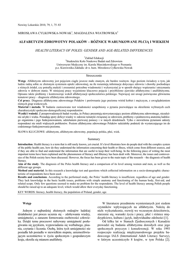 Nowiny Lekarskie 2010, 79, 1, 75–83 MIROSŁAWA CYLKOWSKA-NOWAK1, MAGDALENA WIATROWSKA2 ALFABETYZM ZDROWOTNY POLAKÓW – RÓŻNICE WARUNKOWANE PŁCIĄ I WIEKIEM HEALTH LITERACY OF POLES: GENDER AND AGE-RELATED DIFFERENCES 1 Zakład Edukacji Studenckie Koło Naukowe Badań nad Zdrowiem Uniwersytet Medyczny im. Karola Marcinkowskiego w Poznaniu p.o. Kierownika Zakładu: dr n. hum. Mirosława Cylkowska-Nowak 2 Streszczenie Wstęp. Alfabetyzm zdrowotny jest pojęciem ciągle jeszcze mało znanym, ale bardzo ważnym. Jego poziom świadczy o tym, jak ludzie radzą sobie ze złożonym systemem opieki zdrowotnej, na ile rozumieją informacje dotyczące zdrowia i choroby pochodzące z różnych źródeł, czy potrafią znaleźć i zrozumieć potrzebne wiadomości i wykorzystać je w sposób służący wspieraniu i utrzymaniu zdrowia w dobrym stanie. W niniejszej pracy wyjaśniono kluczowe pojęcia i przybliżono zjawisko alfabetyzmu i analfabetyzmu. Opisano także problemy i kontrowersje wokół alfabetyzacji społeczeństwa polskiego. Najwięcej zaś uwagi poświęcono głównemu tematowi pracy – diagnozie alfabetyzmu zdrowotnego. Cel pracy. Diagnoza alfabetyzmu zdrowotnego Polaków i porównanie jego poziomu wśród kobiet i mężczyzn, z uwzględnieniem różnych grup wiekowych. Materiał i metoda. W badaniu zastosowano test wiadomości uzupełniony o pytania pozwalające na określenie wybranych cech charakterystyki społeczno-demograficznej respondentów. Wyniki i wnioski. Z przeprowadzonych badań wynika, że Polacy prezentują niewystarczający poziom alfabetyzmu zdrowotnego, niezależnie od płci i wieku. Posiadają spory deficyt wiedzy w zakresie tematyki związanej ze zdrowiem, problemy z podstawową anatomią ludzkiego organizmu i jego funkcjonowaniem, udzielaniem pierwszej pomocy i w innych dziedzinach. Tylko z niewieloma pytaniami ankiety respondenci nie mieli większych problemów. Poziom alfabetyzmu zdrowotnego Polaków należałoby podnieść do wystarczającego im do codziennego funkcjonowania poziomu. SŁOWA KLUCZOWE: alfabetyzm, alfabetyzm zdrowotny, populacja polska, płeć, wiek. Summary Introduction. Health literacy is a term that is still rarely known, yet crucial. It’s level illustrates how do people deal with the complex system of the public health care, how do they understand the information concerning their health or illness, which come from different sources, and if they are able to find and understand the information that are useful to keep their well-being. In the following piece of writing the most important terms have been explained and the phenomenon of literacy and illiteracy has been dealt with. Moreover, the issues and controversies of the Polish society have been discussed. However, the focus has been given to the main topic of the research – the diagnosis of health literacy. Aim of the study. The diagnosis of the Poles health literacy and a comparison of its level among women and men, as well as the different age groups. Method and material. In this research a knowledge test and questions which collected information on a socio-demographic characteristic of respondents have been used. Results and conclusions. According to the performed study, the Poles’ health literacy is insufficient, regardless of age and gender. They lack knowledge in the basic health issues, problems with simple anatomy and functioning of the human body, first-aid, and related scope. Only few questions seemed to make no problem for the respondents. The level of health literacy among Polish people should be raised up to an adequate level, which would allow their everyday functioning. KEY WORDS: literacy, health literacy, the population of Poland, gender, age. Wstęp Jednym z najbardziej złożonych rodzajów ludzkiej działalności jest proces uczenia się – zdobywania wiedzy, umiejętności, a zarazem formowania osobowości człowieka. Dzięki temu procesowi nabywany umiejętność posługiwania się językiem, wypowiadania się werbalnego, pisania, czytania i liczenia. Osobę, która tych umiejętności nie posiadła lub posiadła w niewielkim stopniu, uniemożliwiającym uczestnictwo w życiu społecznym i gospodarczym kraju, określa się mianem analfabety. W literaturze przedmiotu wymienianych jest siedem czynników wpływających na alfabetyzm. Należą do nich: wykształcenie, rozwój we wczesnym dzieciństwie, starzenie się, warunki życia i pracy, płeć i różnice międzypłciowe, kultura i język, indywidualne zdolności [1]. Od kilku lat w Stanach Zjednoczonych i Kanadzie prowadzi się badania alfabetyzmu dorosłych oraz jego społecznych przyczyn i konsekwencji. W roku 1993 rozpoczęto realizację międzynarodowego projektu badawczego IALS (International Adult Literacy Survey), w którym uczestniczyło 8 krajów, w tym Polska [2]. 76 Mirosława Cylkowska-Nowak, Magdalena Wiatrowska Ponadto, dysponujemy wynikami badań międzynarodowych PISA (Międzynarodowego Programu Oceny Umiejętności Uczniów) i OECD (Organizacji Współpracy Gospodarczej i Rozwoju) [3]. Przynoszą one szereg niekorzystnych dla populacji polskiej uogólnień: • blisko 40% Polaków nie rozumie tego, co czyta • około 30% Polaków rozumie czytane teksty, ale w niewielkim stopniu • co szósty magister z Polski jest analfabetą funkcjonalnym • 40% Polaków nie radzi sobie z odczytywaniem mapy pogodowej czy rozkładu jazdy pociągów • 75% Polaków bezradnie rozkłada ręce przy pytaniu, czy dostrzegają związek między dwoma wykresami • co trzeci Polak jest analfabetą wtórnym lub funkcjonalnym • co dziesiąty absolwent polskiej szkoły podstawowej i co trzeci absolwent zasadniczej szkoły zawodowej nie potrafi czytać • 44% Polaków przyznaje, że w ogóle nie sięga po książki • 64% urzędników w Polsce ma kłopoty ze zrozumieniem prostej instrukcji i tylko 7% z nich swobodnie posługuje się niezbyt trudnymi dokumentami • co dziesiąty rolnik czyta i rozumie instrukcje