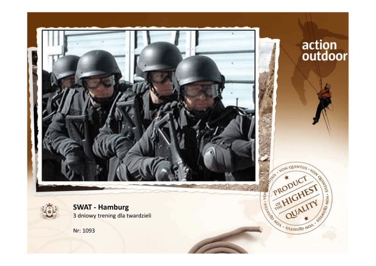 SWAT ‐ Hamburg 3 dniowy trening dla twardzieli Nr: 1093 Trening SWAT w Hamburgu Special Weapon And Tactic ‐ Amerykańską jednostkę specjalną SWAT znacie Państwo z filmów i wiadomości. Czas najwyższy samemu poznać tę dawkę adrenaliny i stać się częścią tej legendarnej jednostki. Sprawdź sie w działaniach jako część teamu. W trakcie ćwiczeń zastosujecie najróżniejsze taktyki ofensywne i defensywne w specjalnie przygotowanych scenariuszach. Najważniejsze – zachować zimną krew. Będziesz ratował zakładników, udaremniał napad na bank, rozbijał narkotykowy kartel. Hamburg To miastem mediów. W mieście tym jest między innymi produkowany Der Spiegel, Stern i Die Zeit. Siedzibę mają w Hamburgu liczne wydawnictwa. Z ludnością 1,74 mln jest drugie po Berlinie miastem Niemiec. To największy port morski kraju (75 mln ton przeładunku), wielki ośrodek przemysłowy (statki, elektrotechnika, przetwórstwo ropy, przemysł spożywczy) i finansowy. SWAT ‐ Hamburg 3‐dniowy trening dla twardzieli Pakiet programu zawiera: ‐ 2 noclegi ze śniadaniem w hotelu w Hamburgu ‐ Wypożyczenie kompletnego sprzętu i strzelanie w Gunclub ‐ Obiad i masaż w SPA ‐ Trening w samoobronie ‐ Zdjęcie grupowe ‐ Nocne zwiedzanie Hamburga ‐ Opiekę przez wyszkolonych specjalistów ‐ Video na DVD i t‐shirt Czas trwania treningu 2‐3 dni Warunki uczestnictwa w programie: ‐ Uczestnicy muszą mieć skończone 18 lat. ‐ Uczestnicy z wadami/chorobami serca lub układu krążenia nie powinni brać udziału w programie. W dniach treningu każdy uczestnik powinien być ogólnie zdrowy i dysponowany. Warunki pogodowe Program treningu dostosowany jest do warunków pogodowych i odbywa sie po części w budynkach i poza nimi. Ubiór i wyposażenie Uczestnicy powinni przywieść ze sobą czarne buty sportowe lub „wojskowe“. Pozostałe wyposażenie zostanie udostępnione uczestnikom (wypożyczone na czas trwania programu). Na czas treningu w samoobronie polecamy luźne ubranie sportowe. Widzowie. Uczestnictwo osób nie biorących udziału w programie jest niedozwolone. Cena za osobę: Od 704 EUR za osobę (nocleg w pokoju 2osobowym) Przy organizacji programów turystycznych obowiązuje regulamin jak i warunki umowy o realizacji programów turystycznych Quintus Sp. z o.o. SWAT ‐ Hamburg 3‐dniowy trening dla twardzieli