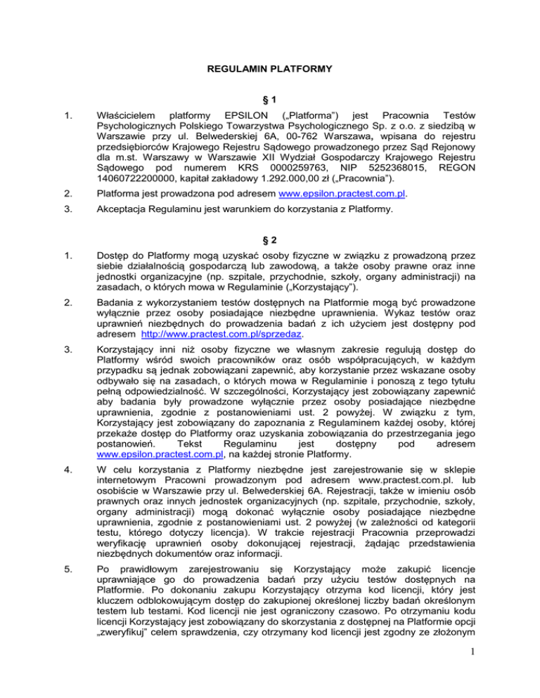 REGULAMIN PLATFORMY §1 1. Właścicielem platformy EPSILON („Platforma”) jest Pracownia Testów Psychologicznych Polskiego Towarzystwa Psychologicznego Sp. z o.o. z siedzibą w Warszawie przy ul. Belwederskiej 6A, 00-762 Warszawa, wpisana do rejestru przedsiębiorców Krajowego Rejestru Sądowego prowadzonego przez Sąd Rejonowy dla m.st. Warszawy w Warszawie XII Wydział Gospodarczy Krajowego Rejestru Sądowego pod numerem KRS 0000259763, NIP 5252368015, REGON 14060722200000, kapitał zakładowy 1.292.000,00 zł („Pracownia”). 2. Platforma jest prowadzona pod adresem www.epsilon.practest.com.pl. 3. Akceptacja Regulaminu jest warunkiem do korzystania z Platformy. §2 1. Dostęp do Platformy mogą uzyskać osoby fizyczne w związku z prowadzoną przez siebie działalnością gospodarczą lub zawodową, a także osoby prawne oraz inne jednostki organizacyjne (np. szpitale, przychodnie, szkoły, organy administracji) na zasadach, o których mowa w Regulaminie („Korzystający”). 2. Badania z wykorzystaniem testów dostępnych na Platformie mogą być prowadzone wyłącznie przez osoby posiadające niezbędne uprawnienia. Wykaz testów oraz uprawnień niezbędnych do prowadzenia badań z ich użyciem jest dostępny pod adresem http://www.practest.com.pl/sprzedaz. 3. Korzystający inni niż osoby fizyczne we własnym zakresie regulują dostęp do Platformy wśród swoich pracowników oraz osób współpracujących, w każdym przypadku są jednak zobowiązani zapewnić, aby korzystanie przez wskazane osoby odbywało się na zasadach, o których mowa w Regulaminie i ponoszą z tego tytułu pełną odpowiedzialność. W szczególności, Korzystający jest zobowiązany zapewnić aby badania były prowadzone wyłącznie przez osoby posiadające niezbędne uprawnienia, zgodnie z postanowieniami ust. 2 powyżej. W związku z tym, Korzystający jest zobowiązany do zapoznania z Regulaminem każdej osoby, której przekaże dostęp do Platformy oraz uzyskania zobowiązania do przestrzegania jego postanowień. Tekst Regulaminu jest dostępny pod adresem www.epsilon.practest.com.pl, na każdej stronie Platformy. 4. W celu korzystania z Platformy niezbędne jest zarejestrowanie się w sklepie internetowym Pracowni prowadzonym pod adresem www.practest.com.pl. lub osobiście w Warszawie przy ul. Belwederskiej 6A. Rejestracji, także w imieniu osób prawnych oraz innych jednostek organizacyjnych (np. szpitale, przychodnie, szkoły, organy administracji) mogą dokonać wyłącznie osoby posiadające niezbędne uprawnienia, zgodnie z postanowieniami ust. 2 powyżej (w zależności od kategorii testu, którego dotyczy licencja). W trakcie rejestracji Pracownia przeprowadzi weryfikację uprawnień osoby dokonującej rejestracji, żądając przedstawienia niezbędnych dokumentów oraz informacji. 5. Po prawidłowym zarejestrowaniu się Korzystający może zakupić licencje uprawniające go do prowadzenia badań przy użyciu testów dostępnych na Platformie. Po dokonaniu zakupu Korzystający otrzyma kod licencji, który jest kluczem odblokowującym dostęp do zakupionej określonej liczby badań określonym testem lub testami. Kod licencji nie jest ograniczony czasowo. Po otrzymaniu kodu licencji Korzystający jest zobowiązany do skorzystania z dostępnej na Platformie opcji „zweryfikuj” celem sprawdzenia, czy otrzymany kod licencji jest zgodny ze złożonym 1 zamówieniem. W przypadku zauważenia rozbieżności pomiędzy złożonym zamówieniem a otrzymanym kodem licencji Korzystający jest zobowiązany do niezwłocznego poinformowania o tym Pracowni, zgodnie z trybem reklamacyjnym, o którym mowa w Regulaminie. 6. Celem skorzystania z kodu licencji i przeprowadzenia badania Korzystający, który nie uzyskał wcześniej dostępu do Platformy, jest zobowiązany do zarejestrowania się na Platformie podając niezbędne dane oraz informacje zgodnie ze wskazówkami dostępnymi na Platformie. 7. Po prawidłowym zarejestrowaniu się Korzystający otrzyma konto na Platformie, do którego uzyska każdorazowo dostęp po podaniu adresu email oraz hasła dostępu. Hasło powinno zapewniać niezbędny poziom bezpieczeństwa i powinno się składać z minimum ośmiu znaków, wśród których będą co najmniej jedna cyfra i jedna wielka litera. Celem zapewnienia ochrony danych oraz informacji zgromadzonych na Platformie Pracownia sugeruje zmianę hasła dostępu nie rzadziej niż raz w miesiącu. Zmiana adresu email oraz konta dostępu do hasła jest każdorazowo możliwa zgodnie ze wskazówkami dostępnymi na Platformie. 8. Warunkiem koniecznym pozwalającym na korzystanie z konta na Platformie jest podpisanie z Pracownią umowy powierzenia przetwarzania danych osobowych. Tekst umowy jest dostępny pod adresem http://www.practest.com.pl/jak-kupic. Umowa powinna zostać podpisana przez Korzystającego lub osoby działające w imieniu Korzystającego oraz dostarczona Pracowni w oryginale, wraz z dokumentami upoważniającymi do działania w imieniu Korzystającego (np. odpis KRS, pełnomocnictwo), w dwóch egzemplarzach na adres: Pracownia Testów Psychologicznych Polskiego Towarzystwa Psychologicznego Sp. z o.o., 00-762 Warszawa, ul. Belwederska 6A. 9. Korzystający jest zobowiązany do dołożenia najwyższej staranności oraz podjęcia wszelkich niezbędnych działań w celu utrzymania hasła dostępu w tajemnicy oraz nie przekazywania hasła osobom trzecim. W przypadku utraty hasła lub uzyskania hasła przez osobę trzecią, Korzystający jest zobowiązany do natychmiastowej zmiany hasła lub zgłoszenia tego faktu Pracowni, celem zablokowania konta i uniemożliwienia korzystania z niego przez osoby nieuprawnione. §3 1. Korzystanie z poszczególnych funkcjonalności Platformy jest dopuszczalne zgodnie z informacjami zawartymi bezpośrednio na Platformie. Na każdej stronie Platformy znajduje się opcja „pomoc”, która pozwoli Korzystającemu na uzyskanie niezbędnych informacji oraz na prawidłowe k