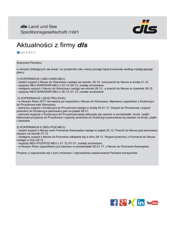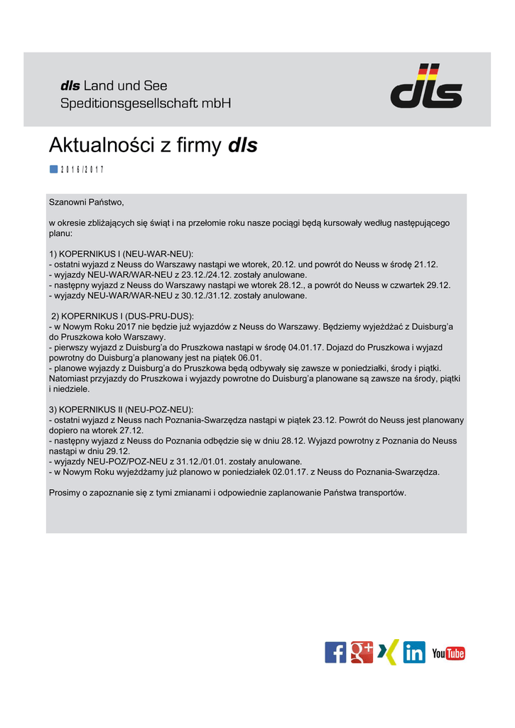 Aktualności z firmy dls 2016/2017 Szanowni Państwo, w okresie zbliżających się świąt i na przełomie roku nasze pociągi będą kursowały według następującego planu: 1) KOPERNIKUS I (NEU-WAR-NEU): - ostatni wyjazd z Neuss do Warszawy nastąpi we wtorek, 20.12. und powrót do Neuss w środę 21.12. - wyjazdy NEU-WAR/WAR-NEU z 23.12./24.12. zostały anulowane. - następny wyjazd z Neuss do Warszawy nastąpi we wtorek 28.12., a powrót do Neuss w czwartek 29.12. - wyjazdy NEU-WAR/WAR-NEU z 30.12./31.12. zostały anulowane. 2) KOPERNIKUS I (DUS-PRU-DUS): - w Nowym Roku 2017 nie będzie już wyjazdów z Neuss do Warszawy. Będziemy wyjeżdżać z Duisburg’a do Pruszkowa koło Warszawy. - pierwszy wyjazd z Duisburg’a do Pruszkowa nastąpi w środę 04.01.17. Dojazd do Pruszkowa i wyjazd powrotny do Duisburg’a planowany jest na piątek 06.01. - planowe wyjazdy z Duisburg’a do Pruszkowa będą odbywały się zawsze w poniedziałki, środy i piątki. Natomiast przyjazdy do Pruszkowa i wyjazdy powrotne do Duisburg’a planowane są zawsze na środy, piątki i niedziele. 3) KOPERNIKUS II (NEU-POZ-NEU): - ostatni wyjazd z Neuss nach Poznania-Swarzędza nastąpi w piątek 23.12. Powrót do Neuss jest planowany dopiero na wtorek 27.12. - następny wyjazd z Neuss do Poznania odbędzie się w dniu 28.12. Wyjazd powrotny z Poznania do Neuss nastąpi w dniu 29.12. - wyjazdy NEU-POZ/POZ-NEU z 31.12./01.01. zostały anulowane. - w Nowym Roku wyjeżdżamy już planowo w poniedziałek 02.01.17. z Neuss do Poznania-Swarzędza. Prosimy o zapoznanie się z tymi zmianami i odpowiednie zaplanowanie Państwa transportów.