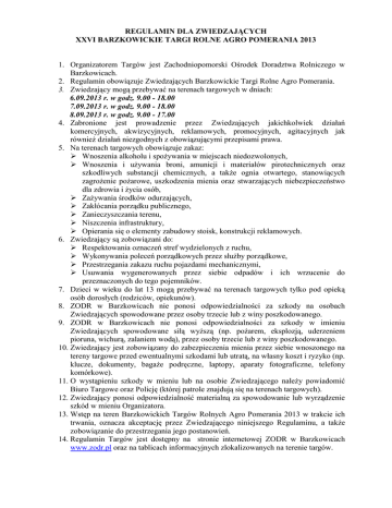 REGULAMIN DLA ZWIEDZAJĄCYCH XXVI BARZKOWICKIE TARGI ROLNE AGRO POMERANIA 2013 1. Organizatorem Targów jest Zachodniopomorski Ośrodek Doradztwa Rolniczego w Barzkowicach. 2. Regulamin obowiązuje Zwiedzających Barzkowickie Targi Rolne Agro Pomerania. 3. Zwiedzający mogą przebywać na terenach targowych w dniach: 6.09.2013 r. w godz. 9.00 - 18.00 7.09.2013 r. w godz. 9.00 - 18.00 8.09.2013 r. w godz. 9.00 - 17.00 4. Zabronione jest prowadzenie przez Zwiedzających jakichkolwiek działań komercyjnych, akwizycyjnych, reklamowych, promocyjnych, agitacyjnych jak również działań niezgodnych z obowiązującymi przepisami prawa. 5. Na terenach targowych obowiązuje zakaz: Wnoszenia alkoholu i spożywania w miejscach niedozwolonych, Wnoszenia i używania broni, amunicji i materiałów pirotechnicznych oraz szkodliwych substancji chemicznych, a także ognia otwartego, stanowiących zagrożenie pożarowe, uszkodzenia mienia oraz stwarzających niebezpieczeństwo dla zdrowia i życia osób, Zażywania środków odurzających, Zakłócania porządku publicznego, Zanieczyszczania terenu, Niszczenia infrastruktury, Opierania się o elementy zabudowy stoisk, konstrukcji reklamowych. 6. Zwiedzający są zobowiązani do: Respektowania oznaczeń stref wydzielonych z ruchu, Wykonywania poleceń porządkowych przez służby porządkowe, Przestrzegania zakazu ruchu pojazdami mechanicznymi, Usuwania wygenerowanych przez siebie odpadów i ich wrzucenie do przeznaczonych do tego pojemników. 7. Dzieci w wieku do lat 13 mogą przebywać na terenach targowych tylko pod opieką osób dorosłych (rodziców, opiekunów). 8. ZODR w Barzkowicach nie ponosi odpowiedzialności za szkody na osobach Zwiedzających spowodowane przez osoby trzecie lub z winy poszkodowanego. 9. ZODR w Barzkowicach nie ponosi odpowiedzialności za szkody w imieniu Zwiedzających spowodowane siłą wyższą (np. pożarem, eksplozją, uderzeniem pioruna, wichurą, zalaniem wodą), przez osoby trzecie lub z winy poszkodowanego. 10. Zwiedzający jest zobowiązany do zabezpieczenia mienia przez siebie wnoszonego na tereny targowe przed ewentualnymi szkodami lub utratą, na własny koszt i ryzyko (np. klucze, dokumenty, bagaże podręczne, laptopy, aparaty fotograficzne, telefony komórkowe). 11. O wystąpieniu szkody w mieniu lub na osobie Zwiedzającego należy powiadomić Biuro Targowe oraz Policję (której patrole znajdują się na terenach targowych). 12. Zwiedzający ponosi odpowiedzialność materialną za spowodowanie lub wyrządzenie szkód w mieniu Organizatora. 13. Wstęp na teren Barzkowickich Targów Rolnych Agro Pomerania 2013 w trakcie ich trwania, oznacza akceptację przez Zwiedzającego niniejszego Regulaminu, a także zobowiązanie do przestrzegania jego postanowień. 14. Regulamin Targów jest dostępny na stronie internetowej ZODR w Barzkowicach www.zodr.pl oraz na tablicach informacyjnych zlokalizowanych na terenie targów.