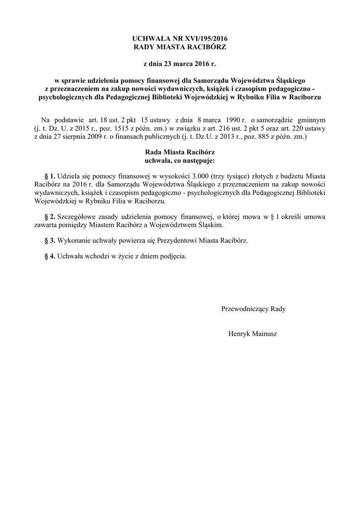 UCHWAŁA NR XVI/195/2016 RADY MIASTA RACIBÓRZ z dnia 23 marca 2016 r. w sprawie udzielenia pomocy finansowej dla Samorządu Województwa Śląskiego z przeznaczeniem na zakup nowości wydawniczych, książek i czasopism pedagogiczno psychologicznych dla Pedagogicznej Biblioteki Wojewódzkiej w Rybniku Filia w Raciborzu Na podstawie art. 18 ust. 2 pkt 15 ustawy z dnia 8 marca 1990 r. o samorządzie gminnym (j. t. Dz. U. z 2015 r., poz. 1515 z późn. zm.) w związku z art. 216 ust. 2 pkt 5 oraz art. 220 ustawy z dnia 27 sierpnia 2009 r. o finansach publicznych (j. t. Dz.U. z 2013 r., poz. 885 z późn. zm.) Rada Miasta Racibórz uchwala, co następuje: § 1. Udziela się pomocy finansowej w wysokości 3.000 (trzy tysiące) złotych z budżetu Miasta Racibórz na 2016 r. dla Samorządu Województwa Śląskiego z przeznaczeniem na zakup nowości wydawniczych, książek i czasopism pedagogiczno - psychologicznych dla Pedagogicznej Biblioteki Wojewódzkiej w Rybniku Filia w Raciborzu. § 2. Szczegółowe zasady udzielenia pomocy finansowej, o której mowa w § 1 określi umowa zawarta pomiędzy Miastem Racibórz a Województwem Śląskim. § 3. Wykonanie uchwały powierza się Prezydentowi Miasta Racibórz. § 4. Uchwała wchodzi w życie z dniem podjęcia. Przewodniczący Rady Henryk Mainusz Uzasadnienie Województwo Śląskie reprezentowane przez Zarząd Województwa Śląskiego wystąpił z wnioskiem o przyznanie dotacji na zakup nowości wydawniczych dla Pedagogicznej Biblioteki Wojewódzkiej w Rybniku Filia w Raciborzu, wchodzącej w skład Regionalnego Ośrodka Doskonalenia Nauczycieli i Informacji Pedagogicznej „WOM” w Rybniku, jednostki organizacyjnej wnioskodawcy. Filia w Raciborzu udostępnia księgozbiór i czasopisma m. in. w zakresie pedagogiki, psychologii, nauczycielom, studentom i innym kształcącym się osobom z terenu Raciborza. Mając na uwadze znaczenie i rolę jaką jednostka ta spełnia w życiu mieszkańców Raciborza, pretendującego do roli regionalnego centrum kształcenia młodzieży i dorosłych, a także od lat pomyślnie układającą się współpracą w przedmiotowym zakresie, zasadnym jest podjęcie niniejszej uchwały.