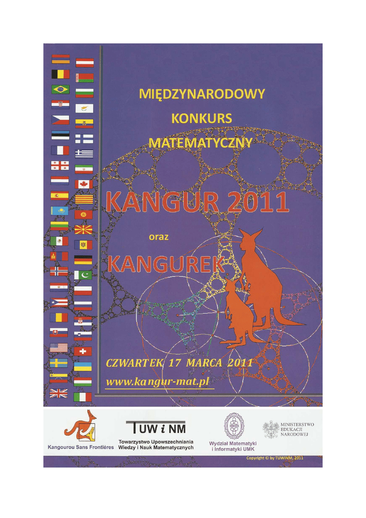 Uczestnicy Międzynarodowego Konkursu "Kangur Matematyczny" w roku 2010 Kraj Liczba uczestników Armenia 30.600 Austria 162.500 Belgia 26.600 Białoruś 112.000 Brazylia 3.100 Bułgaria 14.500 Chorwacja 29.400 Cypr Czechy 1.100 305.000 Ekwador 1.100 Estonia 12.000 Finlandia 17.200 Francja 322.000 Grecja 7.800 Gruzja 14.700 Iran Holandia 176.900 80.000 Kanada 1.100 Kastylia-Leon (Hiszania) 9.300 Katalonia (Hiszpania) 24.300 Kazachstan 57.000 Kirgistan Litwa 1.100 68.300 Macedonia 9.400 Meksyk 7.000 Mołdawia 33.700 Mongolia 900 Niemcy 804.200 Norwegia 7.700 Pakistan 37.400 Paragwaj 8.500 Polska Portoryko Rosja Rumunia 283.500 3.600 1.829.400 164.800 Serbia 18.300 Słowacja 77.800 Słowenia 98.300 Stany Zjednoczone Szwajcaria 2.800 14.200 Szwecja 73.100 Ukraina 385.200 Wenezuela 142.400 Węgry 37.500 Wielka Brytania Włochy 4.300 50.000 Razem 5.571.600 Historia Konkursu Konkurs wywodzi się z Australii, gdzie został zainaugurowany w latach osiemdziesiątych przez światowej sławy popularyzatora matematyki Petera O'Hallorana. W 1990 roku został po raz pierwszy zorganizowany w Europie na terenie Francji i podobnie jak w Australii zyskał od razu dużą popularność. Z inicjatywy matematyków francuskich konkurs ogarniał stopniowo coraz więcej krajów europejskich i nie tylko. Międzynarodowy Konkurs "Kangur Matematyczny" jest w chwili obecnej najbardziej masową imprezą matematyczną na świecie. W 1994 roku zostało utworzone towarzystwo "Kangourou Sans Frontiéres", skupiające organizatorów konkursu z wszystkich krajów. Na corocznym walnym zgromadzeniu ustala ono szczegóły najbliższej edycji konkursu i między innymi wybiera ostateczne zestawy zadań konkursowych spośród propozycji wcześniej nadesłanych przez poszczególne kraje. 17 marca 2011 roku po raz dwudziesty w Polsce odbędzie się Międzynarodowy Konkurs "KANGUR MATEMATYCZNY" Ponieważ ideą konkursu jest zbliżenie dzieci całego świata, a ponad 5 milionów bierze udział w matematycznej zabawie, a muzyka i taniec to uniwersalne języki, którymi od lat porozumiewają się ludzie na całym świecie, najmłodsi uczestnicy przygotują krótki przekaz muzyczny mający na celu integrację wszystkich uczestników KANGURA. 17 MARCA KANGUR I KANGUREK 2011 Weź ze sobą długopis z czarnym wkładem! Na pierwszej stronie karty umieszczamy kod oraz nazwisko i imię, wpisując po jednej literze w prostokącik Bardzo ważne jest, aby najpierw wpisać nazwisko, potem imię, przy czym między nazwiskiem a imieniem należy zostawić jeden pusty prostokącik. Następnie pod każdą literką zaczerniamy jedno kółko z tą samą literą. KOD SZKOŁY OAAI Wspólna dla wszystkich krajów data konkursu oraz te same zestawy pytań dla poszczególnych poziomów podnoszą atrakcyjność konkursu.