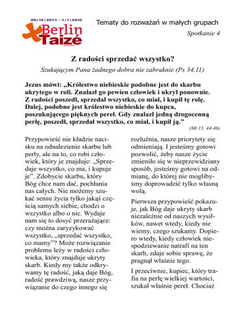 Tematy do rozważań w małych grupach Spotkanie 4 Z radości sprzedać wszystko? Szukającym Pana żadnego dobra nie zabraknie (Ps 34,11) Jezus mówi: „Królestwo niebieskie podobne jest do skarbu ukrytego w roli. Znalazł go pewien człowiek i ukrył ponownie. Z radości poszedł, sprzedał wszystko, co miał, i kupił tę rolę. Dalej, podobne jest królestwo niebieskie do kupca, poszukującego pięknych pereł. Gdy znalazł jedną drogocenną perłę, poszedł, sprzedał wszystko, co miał, i kupił ją.” (Mt 13, 44-46) Przypowieść nie kładzie nacisku na odnalezienie skarbu lub perły, ale na to, co robi człowiek, który je znajduje: „Sprzedaje wszystko, co ma, i kupuje je”. Zdobycie skarbu, który Bóg chce nam dać, pochłania nas całych. Nie możemy szukać sensu życia tylko jakąś częścią samych siebie, chodzi o wszystko albo o nic. Wydaje nam się to dosyć przerażające: czy można zaryzykować wszystko, „sprzedać wszystko, co mamy”? Może rozwiązanie problemu leży w radości człowieka, który znajduje ukryty skarb. Kiedy my także odkrywamy tę radość, jaką daje Bóg, radość prawdziwą, nasze przywiązanie do czego innego się rozluźnia, nasze priorytety się odmieniają. I jesteśmy gotowi pozwolić, żeby nasze życie zmieniło się w nieprzewidziany sposób, jesteśmy gotowi na odmianę, do której nie moglibyśmy doprowadzić tylko własną wolą. Pierwsza przypowieść pokazuje, jak Bóg daje ukryty skarb niezależnie od naszych wysiłków, nawet wtedy, kiedy nie wiemy, czego szukamy. Dopiero wtedy, kiedy człowiek niespodziewanie natrafi na ten skarb, zdaje sobie sprawę, że pragnął właśnie tego. I przeciwnie, kupiec, który trafia na perłę wielkiej wartości, szukał właśnie pereł. Chociaż Ewangelia nie mówi tego wprost, z pewnością posiadał już ich całą kolekcję. I dzięki doświadczeniu, jakiego nabył, kupując perły, mógł któregoś dnia odkryć perłę bardzo cenną. Dużo bardziej, niż się to nam wydaje, ważne decyzje w naszym życiu przygotowujemy dzięki niewielkim krokom wtedy, kiedy okazujemy zaufanie w drobnych codziennych sprawach. Bo jednak perły, które kupiec już posiada, sprawiają mu trudność. Włożył w ich zdobycie wiele czasu i energii. Teraz powinien je porzucić, aby zyskać coś ważniejszego, ale to nie jest łatwe. My także powinniśmy odróżniać to, co dobre, od tego, co jest lepsze. Posiadamy wiele rzeczy, które same w sobie są dobre – studia, podróże, praca... Ale te dobre rzeczy mogą nas rozpraszać! Możemy poświęcić nasz czas na pracę dla innych, zebrać wiele ciekawych doświadczeń, podczas gdy centrum naszego życia będzie zaskakująco puste. Kupiec znalazł wiele pereł, ale ciągle pragnął perły, która miałaby wielką wartość, tej, która zawierałaby istotę Bożego wezwania skierowanego do niego. Pytania W jaki sposób wiara może być dla mnie jak skarb lub bezcenna perła? Czy utożsamiam się raczej z człowiekiem, który szuka, czy z tym, kto niespodziewanie znajduje? Czy przeżyłem już taką radość, która odmieniła moje wybory, która sprawiła, że stałem się mniej przywiązany do rzeczy, które przedtem były dla mnie ważne? Czy potrafiłbym zostawić to, co dobre, dla tego, co lepsze? Modlitwa Boże, Ty jesteś miłością. Choć niewidzialny dla naszych oczu, przez Ducha Świętego trwasz w każdym z nas. W Tobie znajdujemy źródło radości. Prosimy Cię: wzbudź w nas żarliwe pragnienie komunii. Niech ono daje nam odwagę dawania siebie i wytrwania w tym na zawsze. ______________________________________ Medytacja biblijna pochodzi ze stron Taizé: http://www.taize.fr/pl_article174.html? date=2011-04-01