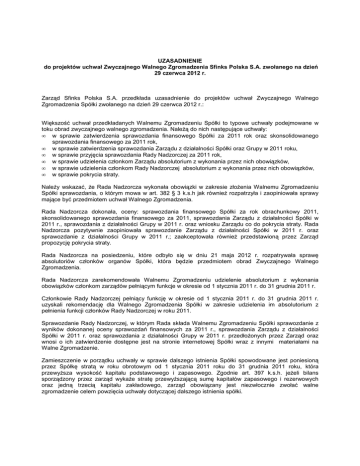 UZASADNIENIE do projektów uchwał Zwyczajnego Walnego Zgromadzenia Sfinks Polska S.A. zwołanego na dzień 29 czerwca 2012 r. Zarząd Sfinks Polska S.A. przedkłada uzasadnienie do projektów uchwał Zwyczajnego Walnego Zgromadzenia Spółki zwołanego na dzień 29 czerwca 2012 r.: Większość uchwał przedkładanych Walnemu Zgromadzeniu Spółki to typowe uchwały podejmowane w toku obrad zwyczajnego walnego zgromadzenia. NaleŜą do nich następujące uchwały: • w sprawie zatwierdzenia sprawozdania finansowego Spółki za 2011 rok oraz skonsolidowanego sprawozdania finansowego za 2011 rok, • w sprawie zatwierdzenia sprawozdania Zarządu z działalności Spółki oraz Grupy w 2011 roku, • w sprawie przyjęcia sprawozdania Rady Nadzorczej za 2011 rok, • w sprawie udzielenia członkom Zarządu absolutorium z wykonania przez nich obowiązków, • w sprawie udzielenia członkom Rady Nadzorczej absolutorium z wykonania przez nich obowiązków, • w sprawie pokrycia straty. NaleŜy wskazać, Ŝe Rada Nadzorcza wykonała obowiązki w zakresie złoŜenia Walnemu Zgromadzeniu Spółki sprawozdania, o którym mowa w art. 382 § 3 k.s.h jak równieŜ rozpatrzyła i zaopiniowała sprawy mające być przedmiotem uchwał Walnego Zgromadzenia. Rada Nadzorcza dokonała, oceny: sprawozdania finansowego Spółki za rok obrachunkowy 2011, skonsolidowanego sprawozdania finansowego za 2011, sprawozdania Zarządu z działalności Spółki w 2011 r., sprawozdania z działalności Grupy w 2011 r. oraz wniosku Zarządu co do pokrycia straty. Rada Nadzorcza pozytywnie zaopiniowała sprawozdanie Zarządu z działalności Spółki w 2011 r. oraz sprawozdanie z działalności Grupy w 2011 r.; zaakceptowała równieŜ przedstawioną przez Zarząd propozycję pokrycia straty. Rada Nadzorcza na posiedzeniu, które odbyło się w dniu 21 maja 2012 r. rozpatrywała sprawę absolutoriów członków organów Spółki, która będzie przedmiotem obrad Zwyczajnego Walnego Zgromadzenia. Rada Nadzorcza zarekomendowała Walnemu Zgromadzeniu udzielenie absolutorium z wykonania obowiązków członkom zarządów pełniącym funkcje w okresie od 1 stycznia 2011 r. do 31 grudnia 2011 r. Członkowie Rady Nadzorczej pełniący funkcję w okresie od 1 stycznia 2011 r. do 31 grudnia 2011 r. uzyskali rekomendację dla Walnego Zgromadzenia Spółki w zakresie udzielenia im absolutorium z pełnienia funkcji członków Rady Nadzorczej w roku 2011. Sprawozdanie Rady Nadzorczej, w którym Rada składa Walnemu Zgromadzeniu Spółki sprawozdanie z wyników dokonanej oceny sprawozdań finansowych za 2011 r., sprawozdania Zarządu z działalności Spółki w 2011 r. oraz sprawozdania z działalności Grupy w 2011 r. przedłoŜonych przez Zarząd oraz wnosi o ich zatwierdzenie dostępne jest na stronie internetowej Spółki wraz z innymi materiałami na Walne Zgromadzenie. Zamieszczenie w porządku uchwały w sprawie dalszego istnienia Spółki spowodowane jest poniesioną przez Spółkę stratą w roku obrotowym od 1 stycznia 2011 roku do 31 grudnia 2011 roku, która przewyŜsza wysokość kapitału podstawowego i zapasowego. Zgodnie art. 397 k.s.h. jeŜeli bilans sporządzony przez zarząd wykaŜe stratę przewyŜszającą sumę kapitałów zapasowego i rezerwowych oraz jedną trzecią kapitału zakładowego, zarząd obowiązany jest niezwłocznie zwołać walne zgromadzenie celem powzięcia uchwały dotyczącej dalszego istnienia spółki. Zarząd rekomenduje Walnemu Zgromadzeniu głosowanie za uchwałą w sprawie dalszego istnienia Spółki. Wniosek ten pozytywnie zaopiniowała takŜe Rada Nadzorcza Spółki. W opinii Zarządu szczególnego uzasadnienia wymagają projekty uchwał ZWZ w sprawach: a. Dochodzenie przez Spółkę odszkodowania za szkodę przy sprawowaniu zarządu przez członków Zarządu W dniu 23 lutego 2010 r. KNF ukarał Sfinks Polska S.A. karą pienięŜną w wysokości 70 tys. zł za nieprzekazanie w ustawowym terminie informacji poufnej o zawarciu przez emitenta walutowej transakcji zamiany stóp procentowych oraz informacji poufnej o wystawieniu przez emitenta opcji walutowej, niosących ryzyko nieograniczonej straty, w zakresie w jakim przekraczały one wpływy w walutach obcych i mogących mieć istotny wpływ na wynik finansowy Sfinks Polska S.A. Spółka wnioskuje o udzielenie zgody na dochodzenie odszkodowania za wyrządzoną jej szkodę. b. PoŜyczka z członkiem Zarządu W dniu 2 grudnia 2011 r. Spółka zawarła warunkową umowę poŜyczki podporządkowanej z akcjonariuszem Sfinks Polska S.A. będącym jednocześnie członkiem Zarządu Spółki – Panem Sylwestrem Cackiem. Spółka poinformowała o zawarciu przedmiotowej umowy w RB 73/2011 z dnia 3 grudnia 2011 r. W myśl art.15 § 1 Ksh zawarcie przez Spółkę umowy poŜyczki z członkiem Zarządu wymaga zgody Walnego Zgromadzenia. c. Emisja obligacji zamiennych na akcje, warunkowe podwyŜszenie kapitału zakładowego o kwotę nieprzekraczającą 35.000.000 zł, wyłączenie w całości prawa poboru dotychczasowych akcjonariuszy w stosunku do emitowanych akcji i obligacji zamiennych oraz zmiana Statutu Spółki Niniejsza opinia Zarządu Sfinks Polska Spółki Akcyjnej z siedzibą w Piasecznie („Spółka”) została przyjęta przez Zarząd uchwałą nr 1 z dnia 31 maja 2012 r. na podstawie art. 433 §§ 2 i 6 Kodeksu spółek handlowych i, stosownie do §22 ust. 2 pkt. 18 Statutu Spółki, została przedstawiona Radzie Nadzorczej Spółki w dniu 1 czerwca 2012 r. w celu zajęcia przez nią stanowiska. Rada Nadzorcza pozytywnie zaopiniowała projekt uchwały ZWZ w przedmiotowej sprawie. 1. Potrzeba restrukturyzacji zadłuŜenia Spółki wobec banków Zgodnie z informacjami podawanymi w raportach bieŜących Spółki w 2011 r. doszło do uzgodnienia wieloetapowej restrukturyzacji zadłuŜenia Spółki wobec ówczesnych banków finansujących, wskutek której obecnie łączne zadłuŜenie Spółki wobec dwóch banków finansujących, zwanych dalej 