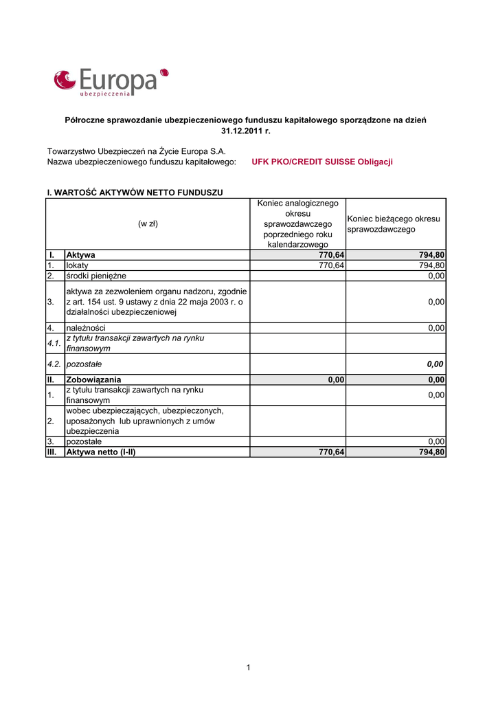 Półroczne sprawozdanie ubezpieczeniowego funduszu kapitałowego sporządzone na dzień 31.12.2011 r. Towarzystwo Ubezpieczeń na Życie Europa S.A. Nazwa ubezpieczeniowego funduszu kapitałowego: UFK PKO/CREDIT SUISSE Obligacji I. WARTOŚĆ AKTYWÓW NETTO FUNDUSZU Koniec analogicznego okresu Koniec bieżącego okresu sprawozdawczego sprawozdawczego poprzedniego roku kalendarzowego 770,64 794,80 770,64 794,80 0,00 (w zł) I. 1. 2. Aktywa lokaty środki pieniężne 3. aktywa za zezwoleniem organu nadzoru, zgodnie z art. 154 ust. 9 ustawy z dnia 22 maja 2003 r. o działalności ubezpieczeniowej 0,00 4. należności z tytułu transakcji zawartych na rynku 4.1. finansowym 0,00 4.2. pozostałe 0,00 II. 1. 2. 3. III. Zobowiązania z tytułu transakcji zawartych na rynku finansowym wobec ubezpieczających, ubezpieczonych, uposażonych lub uprawnionych z umów ubezpieczenia pozostałe Aktywa netto (I-II) 0,00 0,00 0,00 770,64 1 0,00 794,80 Półroczne sprawozdanie ubezpieczeniowego funduszu kapitałowego sporządzone na dzień 31.12.2011 r. Towarzystwo Ubezpieczeń na Życie Europa S.A. Nazwa ubezpieczeniowego funduszu kapitałowego: UFK PKO/CREDIT SUISSE Obligacji II. ZMIANY AKTYWÓW NETTO FUNDUSZU Analogiczny okres sprawozdawczy poprzedniego roku kalendarzowego (w zł) A. B. I. 1. 2. 3. II. 1. 2. 3. 4. 5. 6. 7. Aktywa netto funduszu na początek okresu sprawozdawczego Stan netto z działalności operacyjnej (I-II) Zwiększenia funduszu tytułem składek zwiększających wartość funduszu pozostałe przychody pozostałe zwiększenia Zmniejszenia funduszu tytułem wykupu tytułem wypłat pozostałych świadczeń ubezpieczeniowych tytułem opłaty za ryzyko ubezpieczeniowe oraz innych opłat potrącanych z fuduszu tytułem zwrotu składek ubezpieczeniowych tytułem opłat za zarządzanie funduszem oraz innych opłat tytułem administrowania funduszem pozostałe koszty Bieżący okres sprawozdawczy 749,82 770,64 -18,56 0,00 -18,83 0,00 0,00 18,56 18,83 0,00 0,00 18,56 18,83 39,38 43,00 770,64 794,80 pozostałe zmniejszenia C. Wynik netto z działalności inwestycyjnej D. Aktywa netto funduszu na koniec okresu sprawozdawczego 3 Półroczne sprawozdanie ubezpieczeniowego funduszu kapitałowego sporządzone na dzień 31.12.2011 r. Towarzystwo Ubezpieczeń na Życie Europa S.A. Nazwa ubezpieczeniowego funduszu kapitałowego: III UFK PKO/CREDIT SUISSE Obligacji LICZBA I WARTOŚĆ JEDNOSTEK ROZRACHUNKOWYCH Analogiczny okres sprawozdawczy poprzedniego roku kalendarzowego (w zł) I. 1. 2. II. 1. 2. 3. 4. Liczba jednostek rozrachunkowych: na początek okresu sprawozdawczego na koniec okresu sprawozdawczego Wartość jednostki rozrachunkowej (w zł): na początek okresu sprawozdawczego minimalna wartość jednostki rozrachunkowej w okresie sprawozdawczym maksymalna wartość jednostki rozrachunkowej w okresie sprawozdawczym na koniec okresu sprawozdawczego 5 Bieżący okres sprawozdawczy 3,4345 3,3531 3,3531 3,2735 218,32 229,83 218,32 227,13 233,80 229,83 243,45 242,80 Półroczne sprawozdanie ubezpieczeniowego funduszu kapitałowego sporządzone na dzień 31.12.2011 r. Towarzystwo Ubezpieczeń na Życie Europa S.A. Nazwa ubezpieczeniowego funduszu kapitałowego: V UFK PKO/CREDIT SUISSE Obligacji ZESTAWIENIE AKTYWÓW NETTO FUNDUSZU I. 1. 2. Udział w aktywach netto funduszu (w %) 794,80 100,00% Wartość bilansowa (w zł) (w zł) Lokaty (suma 1-12) papiery wartościowe emitowane, poręczone lub gwarantowane przez Skarb Państwa lub organizacje międzynarodowe, których członkiem jest Rzeczpospolita Polska obligacje emitowane lub poręczone przez jednostki samorządu terytorialnego lub związki jednostek samorządu terytorialnego 0,00 0,00% 0,00% 3. Inne dłużne papiery wartościowe o stałej stopie dochodu 0,00 0,00% 4. 5. 6. akcje udziały jednostki uczestnictwa lub certyfikaty inwestycyjne w funduszach inwestycyjnych instrumenty pochodne, o ile służą zmniejszeniu ryzyka związanego z innymi aktywami stanowiącymi pokrycie rezerw techniczno-ubezpieczeniowych inne papiery wartościowe o zmiennej stopie dochodu pożyczki nieruchomości depozyty bankowe pozostałe lokaty Aktywa za zezwoleniem organu nadzoru, zgodnie z art.. 154 ust.9 ustawy z dnia 22 maja 2003 r. o działalności ubezpieczeniowej Środki pieniężne Należności Zobowiązania Aktywa netto (w tym) krajowe zagraniczne - kraje UE zagraniczne - kraje poza UE 0,00 0,00% 0,00% 794,80 100,00% 0,00 0,00 0,00 0,00% 0,00% 0,00% 0,00% 0,00% 0,00% 7. 8. 9. 10. 11. 12. II. III. IV V. VI. 1. 2. 3. 7 0,00 0,00 0,00 0,00 0,00 794,80 794,80 0,00 0,00 0,00% 0,00% 0,00% 0,00% 100,00% 100,00% 0,00% 0,00%