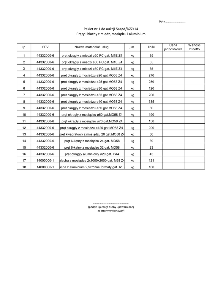 Data…………………………. Pakiet nr 1 do aukcji 544/A/DZZ/14 Pręty i blachy z miedz, mosiądzu i aluminium l.p. CPV Nazwa materiału/ usługi j.m. Ilość 1 44332000-6 pręt okrągły z miedzi ø20 PC gat. M1E Z4 kg 35 2 44332000-6 pręt okrągły z miedzi ø30 PC gat. M1E Z4 kg 35 3 44332000-6 pręt okrągły z miedzi ø50 PC gat. M1E Z4 kg 35 4 44332000-6 pręt okrągły z mosiądzu ø20 gat.MO58 Z4 kg 270 5 44332000-6 pręt okrągły z mosiądzu ø25 gat.MO58 Z4 kg 259 6 44332000-6 pręt okrągły z mosiądzu ø30 gat.MO58 Z4 kg 120 7 44332000-6 pręt okrągły z mosiądzu ø35 gat.MO58 Z4 kg 206 8 44332000-6 pręt okrągły z mosiądzu ø40 gat.MO58 Z4 kg 335 9 44332000-6 pręt okrągły z mosiądzu ø50 gat.MO58 Z4 kg 80 10 44332000-6 pręt okrągły z mosiądzu ø60 gat.MO58 Z4 kg 190 11 44332000-6 pręt okrągły z mosiądzu ø70 gat.MO58 Z4 kg 150 12 44332000-6 pręt okrągły z mosiądzu ø120 gat.MO58 Z4 kg 200 13 44332000-6 pręt kwadratowy z mosiądzu 20 gat.MO58 Z4 kg 30 14 44332000-6 pręt 6-kątny z mosiądzu 24 gat. MO58 kg 39 15 44332000-6 pręt 6-kątny z mosiądzu 32 gat. MO58 kg 23 16 44332000-6 pręt okrągły aluminiowy ø20 gat. PA4 kg 45 17 14000000-1 blacha z mosiądzu 2x1000x2000 gat. M68 Z4 kg 121 18 14000000-1 blacha z aluminium 2,5xróżne formaty gat. A1 Z4 kg 100 ….…..……………………….………….. (podpis i pieczęć osoby upoważnionej ze strony wykonawcy) Cena jednostkowa Wartość zł netto