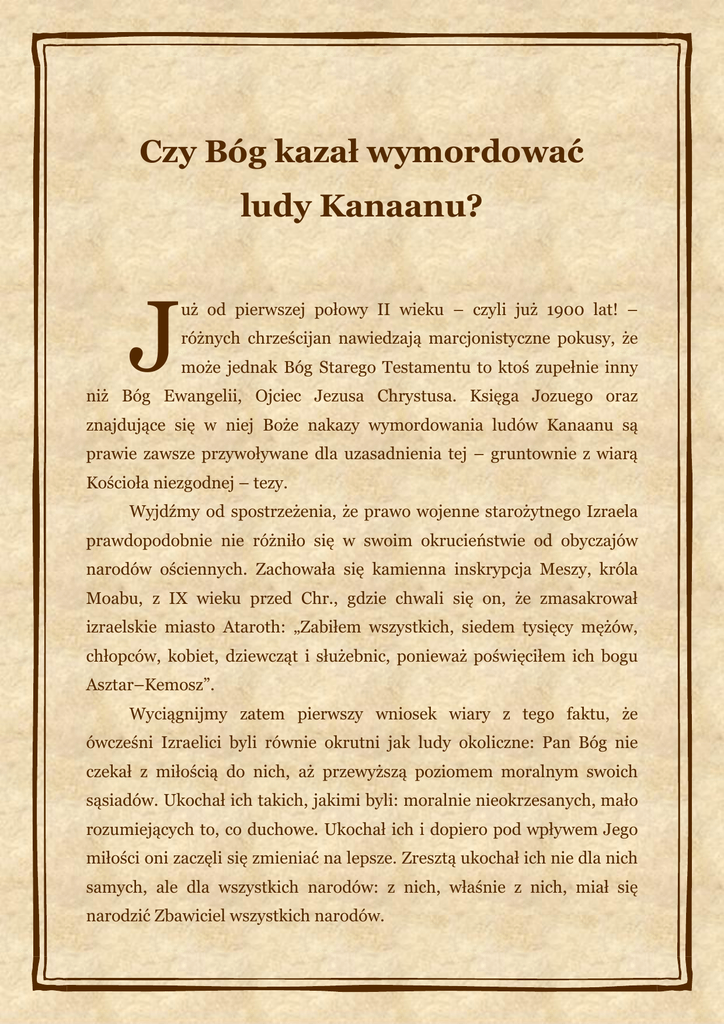 Czy Bóg kazał wymordować ludy Kanaanu? J uż od pierwszej połowy II wieku – czyli już 1900 lat! – różnych chrześcijan nawiedzają marcjonistyczne pokusy, że może jednak Bóg Starego Testamentu to ktoś zupełnie inny niż Bóg Ewangelii, Ojciec Jezusa Chrystusa. Księga Jozuego oraz znajdujące się w niej Boże nakazy wymordowania ludów Kanaanu są prawie zawsze przywoływane dla uzasadnienia tej – gruntownie z wiarą Kościoła niezgodnej – tezy. Wyjdźmy od spostrzeżenia, że prawo wojenne starożytnego Izraela prawdopodobnie nie różniło się w swoim okrucieństwie od obyczajów narodów ościennych. Zachowała się kamienna inskrypcja Meszy, króla Moabu, z IX wieku przed Chr., gdzie chwali się on, że zmasakrował izraelskie miasto Ataroth: „Zabiłem wszystkich, siedem tysięcy mężów, chłopców, kobiet, dziewcząt i służebnic, ponieważ poświęciłem ich bogu Asztar–Kemosz”. Wyciągnijmy zatem pierwszy wniosek wiary z tego faktu, że ówcześni Izraelici byli równie okrutni jak ludy okoliczne: Pan Bóg nie czekał z miłością do nich, aż przewyższą poziomem moralnym swoich sąsiadów. Ukochał ich takich, jakimi byli: moralnie nieokrzesanych, mało rozumiejących to, co duchowe. Ukochał ich i dopiero pod wpływem Jego miłości oni zaczęli się zmieniać na lepsze. Zresztą ukochał ich nie dla nich samych, ale dla wszystkich narodów: z nich, właśnie z nich, miał się narodzić Zbawiciel wszystkich narodów. Dlaczego właśnie z nich, a nie z jakiegoś innego narodu? Oczywiście, że mógłby się narodzić z każdego innego narodu, mógłby – gdyby chciał – narodzić się również z Kananejczyków. Jednakże spodobało się Bogu, aby właśnie w tym narodzie przyszedł do wszystkich ludzi Zbawiciel świata. Tę prawdę o Bożej miłości — że Bóg nie czeka z miłością, aż człowiek stanie się jej wart — starajmy się zauważać na co dzień. Przecież tak samo postępował Pan Jezus: okazywał swoją miłość nawet prostytutkom i celnikom, i ta miłość ich przemieniała. Ba, nawet na apostołów wybrał ludzi mało rozumiejących to, co Boże: cierpliwie ich kształtował na głosicieli Dobrej Nowiny, aż wreszcie zesłał na nich Ducha Świętego. W ten sam sposób okazuje nam swoją miłość dzisiaj. Okrucieństwo ludzkie nie jest zapewne dziś mniejsze niż dawniej, zmieniły się tylko jego formy. Jak ludzie przed wiekami, tak i my często nie jesteśmy świadomi naganności swoich okrucieństw. Dopiero jeśli otworzymy się na miłość Bożą, będzie nas ona przemieniać i przywracać naszym sercom kształt prawdziwie ludzki. Tutaj ktoś może mi zarzucić: Ale przecież mordowanie ludów Kanaanu zostało w Starym Testamencie przedstawione jako wypełnianie woli Bożej! Otóż przypomnijmy sobie ogólne zasady czytania słowa Bożego. Pierwszym naszym obowiązkiem jest próbować dotrzeć do tego sensu, który chciał w tekście umieścić jego ludzki autor. Księga Jozuego powstała, jak wiadomo, najwcześniej na początku monarchii (XI wiek przed Chr.), a może nawet w czasach króla Jozjasza (VII wiek przed Chr.). Zatem pierwsi jej czytelnicy nie mogli odczytać w niej zachęty do mordowania innych narodów. Owszem, z wewnętrzną aprobatą czytali o krwawym podboju Kanaanu, ale była to już dla nich historia. Jeśli uważnie przeczytamy cały ten fragment od szóstego do dwunastego rozdziału Księgi Jozuego, nie można mieć wątpliwości, że głównym jego przesłaniem jest prawda, iż sam Bóg był Wodzem, wprowadzającym swój lud do ziemi obiecanej. To, że prawda ta została wyrażona w kategoriach ówczesnej — dopiero kiełkującej ku duchowi Ewangelii — mentalności, powinno nas pobudzać raczej do dziękczynienia niż do buntu przeciw słowu Bożemu: bo oto mamy jeszcze jedno świadectwo, że Pan Bóg schodzi w proch naszej skażonej grzechem ziemi, aby nas podnosić ku sobie. Powyższe spojrzenie dotyczy historycznej warstwy tekstu biblijnego: już w niej znajdują się interpretacje religijne, na które zwróciliśmy uwagę. Jednak chrześcijanin czyta przecież Stary Testament już w duchu Ewangelii. Wydarzenia z czasów wchodzenia ludu Bożego do ziemi Kanaan są jedynie niedoskonałym obrazem rzeczy przyszłych: wejścia do ziemi łaski Chrystusowej, a ostatecznie — do ziemi obiecanej życia wiecznego. Bóg jest naszym Wodzem przede wszystkim w tym zwycięskim pochodzie. Toteż w klątwie na ludy Kanaanu Ojcowie Kościoła dopatrywali się klątwy na nasze grzechy: ta klątwa jest nieodwołalnie słuszna. Mowy nie ma o wejściu do ziemi obiecanej, jeśli tej klątwy nie będziemy się starali wypełnić do końca. I choćby nasze grzechy i jakiekolwiek ciemne siły były siedmiokrotnie potężniejsze od naszego dobra, przecież za sprawą takiego Wodza niewątpliwie zwyciężymy. Ludy Kanaanu są w Starym Testamencie uosobieniem najcięższego odstępstwa ku bałwochwalstwu. Stąd prorocy często nawiązywali do ich losu, aby grozić Izraelitom, że podzielą go, jeśli będą niewierni Bogu. Wyludnienie, według proroków, jest konieczną karą za społeczne odstępstwo od Boga: „Runą miasta wyludnione i domy będą bez ludzi, a pola zostaną pustkowiem. Pan wyrzuci ludzi daleko, tak że zwiększy się pustka wewnątrz kraju. A jeśli jeszcze dziesiąta część [ludności] zostanie, to i ona powtórnie ulegnie zniszczeniu — jak terebint lub dąb, z których pień tylko zostaje po zwaleniu. Pniem jego jest święte nasienie” (Iz 6,11– 13; por. 64,9–11). Zauważmy to ostatnie zdanie, bo mówi ono o ocalonej reszcie ludu, którą — w ostatecznym wymiarze — jest sam Chrystus, Syn Boży. „Spoglądam, a oto nie ma człowieka — biada prorok Jeremiasz — ptactwo niebieskie wszystko odleciało. Spoglądam, a oto kraj żyzny — pustkowiem, i wszystkie jego miasta zburzone przez Pana, przez Jego gniew srogi. Bo tak mówi Pan: «Pustkowiem się stanie kraj cały, choć n
