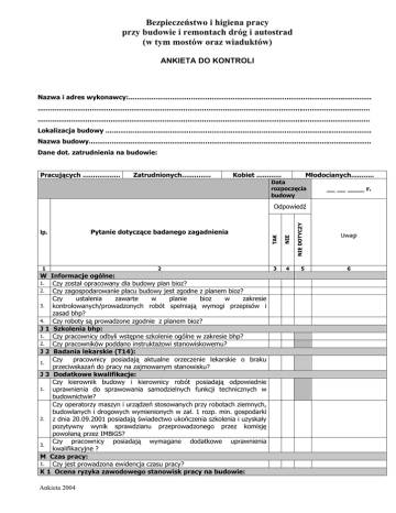 Bezpieczeństwo i higiena pracy przy budowie i remontach dróg i autostrad (w tym mostów oraz wiaduktów) ANKIETA DO KONTROLI Nazwa i adres wykonawcy:..................................................................................................................... ................................................................................................................................................................ ................................................................................................................................................................ Lokalizacja budowy ................................................................................................................................ Nazwa budowy........................................................................................................................................ Dane dot. zatrudnienia na budowie: Pracujących .................. Zatrudnionych.............. Kobiet ............ Młodocianych........... Data rozpoczęcia budowy __ __ ____ r. 1 2 W Informacje ogólne: 1. Czy został opracowany dla budowy plan bioz? 2. Czy zagospodarowanie placu budowy jest zgodne z planem bioz? Czy ustalenia zawarte w planie bioz w zakresie 3. kontrolowanych/prowadzonych robót spełniają wymogi przepisów i zasad bhp? 4. Czy roboty są prowadzone zgodnie z planem bioz? J 1 Szkolenia bhp: 1. Czy pracownicy odbyli wstępne szkolenie ogólne w zakresie bhp? 2. Czy pracowników poddano instruktażowi stanowiskowemu? J 2 Badania lekarskie (T14): Czy pracownicy posiadają aktualne orzeczenie lekarskie o braku 1. przeciwskazań do pracy na zajmowanym stanowisku? J 3 Dodatkowe kwalifikacje: Czy kierownik budowy i kierownicy robót posiadają odpowiednie 1. uprawnienia do sprawowania samodzielnych funkcji technicznych w budownictwie? Czy operatorzy maszyn i urządzeń stosowanych przy robotach ziemnych, budowlanych i drogowych wymienionych w zał. 1 rozp. min. gospodarki 2. z dnia 20.09.2001 posiadają świadectwo ukończenia szkolenia i uzyskały pozytywny wynik sprawdzianu przeprowadzonego przez komisję powołaną przez IMBiGS? Czy pracownicy posiadają wymagane dodatkowe uprawnienia 3. kwalifikacyjne ? M Czas pracy: 1. Czy jest prowadzona ewidencja czasu pracy? K 1 Ocena ryzyka zawodowego stanowisk pracy na budowie: Ankieta 2004 NIE DOTYCZY Pytanie dotyczące badanego zagadnienia NIE lp. TAK Odpowiedź 3 4 5 Uwagi 6 1 2 3 Czy pracodawca ocenił i udokumentował ocenę ryzyka zawodowego na 1. stanowiskach występujących na budowie? Czy pracodawca informuje pracowników o ryzyku zawodowym, które 2. wiąże się z wykonywaną pracą? 3. Czy pracodawca zastosował środki zmniejszające ryzyko? K 2 Nadzór i kontrola stanu bhp Czy na budowie, na której rob. bud. wykonywane są jednocześnie przez 1. pracowników różnych pracodawców został wyznaczony koordynator ds. bhp? I Czynniki szkodliwe, niebezpieczne i uciążliwe: Czy pracodawca posiada decyzję inspekcji sanitarnej, co do rodzaju 1. badań i pomiarów czynników szkodliwych w sytuacji gdy są one niezbędne? 2. Czy wyznaczono strefy zagrożeń z podaniem czynnika szkodliwego? 3. Czy pracodawca dostarczył środki ochrony indywidualnej? Czy pracownicy stosują środki ochrony indywidualnej zgodnie z 4. przeznaczeniem? Czy podczas pracy na wodzie pracownicy są wyposażeni w kamizelki 5. ratunkowe? 6. Czy pracodawca zapewnił odzież i obuwie robocze? Czy na budowie pracownicy przestrzegają przepisów dotyczących 7. odzieży i obuwia roboczego? Czy stosowane przez pracowników ochrony indywidualne posiadają 8. ocenę zgodności? B Zaplecze higieniczno-sanitarne: Czy pracodawca zapewnił możliwość korzystania z pomieszczeń 1. higieniczno-sanitarnych przez pracowników budowy? Czy pomieszczenia higieniczno-sanitarne (biurowe i socjalne) budowy 2. są utrzymywane w należytym stanie technicznym i sanitarnym? A Teren budowy: Czy teren budowy / robót został zabezpieczony przed dostępem osób 1. nieupoważnionych? Czy w przypadkach robót prowadzonych na zamkniętych lub ograniczonych odcinkach czynnego ruchu drogowego zastosowano i 2. odpowiednio rozmieszczono właściwe znaki drogowe zgodnie z zatwierdzonym projektem? Czy znaki drogowe informujące o utrudnieniach w ruchu z powodu 3. budowy są we właściwym stanie eksploatacyjnym? Czy stojące podczas przerw w pracy i w porze nocnej maszyny i 4. urządzenia są odpowiednio oznakowane i oświetlone? Czy zaparkowane maszyny i urządzenia techniczne zabezpieczono przed 5. przypadkowym uruchomieniem przez osoby nieupoważnione? C Oświetlenie na budowie: 1. Czy drogi, przejścia, miejsca niebezpieczne są właściwie oświetlone? Czy stanowiska pracy wykonywanej w porze nocnej i w warunkach 2. ograniczonej widoczności są właściwie oświetlone? D 1 Stanowiska i procesy pracy Czy pracodawca ustalił stanowiska pracy wymagające wykonywania 1. robót przez co najmniej dwie osoby? 2. Czy opracowano wykaz prac szczególnie niebezpiecznych? Czy określono podstawowe wymagania bhp przy wykonywaniu prac 3. szczególnie niebezpiecznych? Czy pracodawca ustalił stanowiska pracy wymagające szczególnych 4. predyspozycji psychofizycznych? Czy łodzie i pontony z zainstalowanymi maszynami i urządzeniami 5. posiadają pomosty robocze wyposażone w sprzęt ratowniczy? Czy do pomostów lub w pobliżu miejsca wykonywania konstrukcji nad 6. wodą są przycumowane łodzie ratunkowe? 7. Czy łodzie ratunkowe są wyposażone w odpowiedni sprzęt ratunkowy? Ankieta 2004 r. 2 4 5 6 1 2 3 Czy stanowiska pracy są odpowiednio zabezpieczone przed spadającymi 8. przedmiotami, czynnikami atmosferycznymi i uszkodzeniami mechanicznymi? Czy stanowiska pracy na wysokości (krawędzie otwartych powierzchni) 9. zabezpieczono przez zastosowanie środków ochrony zbiorowej? Czy pomieszczenia laboratoriów drogowych przy budowie lub na 10. zapleczu odpowiadają warunkom dla pomieszczeń laboratoryjnych z uwzględnien