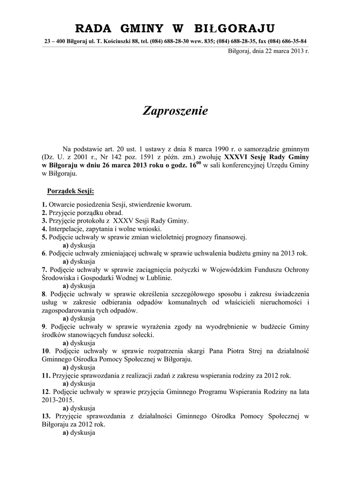 RADA GMINY W BIŁGORAJU 23 – 400 Biłgoraj ul. T. Kościuszki 88, tel. (084) 688-28-30 wew. 835; (084) 688-28-35, fax (084) 686-35-84 __________________________________________________________________________________________________________________________________________________________________________________________________________________________________ Biłgoraj, dnia 22 marca 2013 r. Zaproszenie Na podstawie art. 20 ust. 1 ustawy z dnia 8 marca 1990 r. o samorządzie gminnym (Dz. U. z 2001 r., Nr 142 poz. 1591 z późn. zm.) zwołuję XXXVI Sesję Rady Gminy w Biłgoraju w dniu 26 marca 2013 roku o godz. 1600 w sali konferencyjnej Urzędu Gminy w Biłgoraju. Porządek Sesji: 1. Otwarcie posiedzenia Sesji, stwierdzenie kworum. 2. Przyjęcie porządku obrad. 3. Przyjęcie protokołu z XXXV Sesji Rady Gminy. 4. Interpelacje, zapytania i wolne wnioski. 5. Podjęcie uchwały w sprawie zmian wieloletniej prognozy finansowej. a) dyskusja 6. Podjęcie uchwały zmieniającej uchwałę w sprawie uchwalenia budżetu gminy na 2013 rok. a) dyskusja 7. Podjęcie uchwały w sprawie zaciągnięcia pożyczki w Wojewódzkim Funduszu Ochrony Środowiska i Gospodarki Wodnej w Lublinie. a) dyskusja 8. Podjęcie uchwały w sprawie określenia szczegółowego sposobu i zakresu świadczenia usług w zakresie odbierania odpadów komunalnych od właścicieli nieruchomości i zagospodarowania tych odpadów. a) dyskusja 9. Podjęcie uchwały w sprawie wyrażenia zgody na wyodrębnienie w budżecie Gminy środków stanowiących fundusz sołecki. a) dyskusja 10. Podjęcie uchwały w sprawie rozpatrzenia skargi Pana Piotra Strej na działalność Gminnego Ośrodka Pomocy Społecznej w Biłgoraju. a) dyskusja 11. Przyjęcie sprawozdania z realizacji zadań z zakresu wspierania rodziny za 2012 rok. a) dyskusja 12. Podjęcie uchwały w sprawie przyjęcia Gminnego Programu Wspierania Rodziny na lata 2013-2015. a) dyskusja 13. Przyjęcie sprawozdania z działalności Gminnego Ośrodka Pomocy Społecznej w Biłgoraju za 2012 rok. a) dyskusja 14. Przyjęcie sprawozdania z działalności Gminnej Komisji Rozwiązywania Problemów Alkoholowych w Biłgoraju oraz realizacji Gminnego Programu Profilaktyki i Rozwiązywania Problemów Alkoholowych za 2012 rok. a) dyskusja 15. Przyjęcie sprawozdania z działalności Gminnej Komisji Rozwiązywania Problemów Alkoholowych w Biłgoraju oraz realizacji Gminnego Programu Przeciwdziałania Narkomanii za 2012 rok. a) dyskusja 16. Przyjęcie sprawozdania z wykonania Gminnego Programu Przeciwdziałania Przemocy w Rodzinie oraz Ofiar Przemocy w Gminie Biłgoraj na lata 2010-2015. a) dyskusja 17. Przyjęcie sprawozdania z realizacji Strategii Integracji i Rozwiązywania Problemów Społecznych w Gminie Biłgoraj na lata 2008-2013. a) dyskusja 18. Przyjęcie sprawozdania z planu działania na 2012 rok. a) dyskusja 19. Przyjęcie sprawozdania z realizacji „Programu współpracy Gminy Biłgoraj z organizacjami pozarządowymi i innymi podmiotami prowadzącymi działalności pożytku publicznego na 2012 rok.” a) dyskusja 20. Informacja Wójta Gminy o problemach i zadaniach administracji samorządowej w okresie międzysesyjnym. 21. Odpowiedzi na interpelacje, zapytania i wolne wnioski. 22. Sprawy różne. 23. Zakończenie Sesji. Przewodniczący Rady Gminy Wiesław Grabias Zgodnie z art. 25 ust. 3 w związku z art. 24 ustawy z dnia 8 marca 1990r. o samorządzie gminnym (Dz. U. z 2001 Nr 142, poz. 1591 z późniejszymi zmianami). Niniejsze zaproszenie stanowi podstawę do zwolnienia z pracy zawodowej na czas trwania posiedzenia
