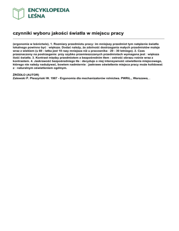 czynniki wyboru jakości światła w miejscu pracy (ergonomia w leśnictwie), 1. Rozmiary przedmiotu pracy: im mniejszy przedmiot tym natężenie światła lokalnego powinno być większe. Dodać należy, że zdolność dostrzegania małych przedmiotów maleje wraz z wiekiem (u 60 - latka jest 10 razy mniejsza niż u pracownika 20 - 30 letniego). 2. Czas przeznaczony na postrzeganie: przy szybko przemieszczanych przedmiotach wymagana jest większa ilość światła. 3. Kontrast między przedmiotem a bezpośrednim tłem : ostrość obrazu rośnie wraz z kontrastem. 4. Jaskrawość bezpośredniego tła : decyduje o niej intensywność oświetlenia miejscowego, którego nie należy nadużywać, bowiem nadmiernie jaskrawe oświetlenie miejsca pracy może kolidować z naturalnym oświetleniem ogólnym. ŹRÓDŁO (AUTOR) Zalewski P. Pleszyński W. 1987 - Ergonomia dla mechanizatorów rolnictwa. PWRiL., Warszawa, .