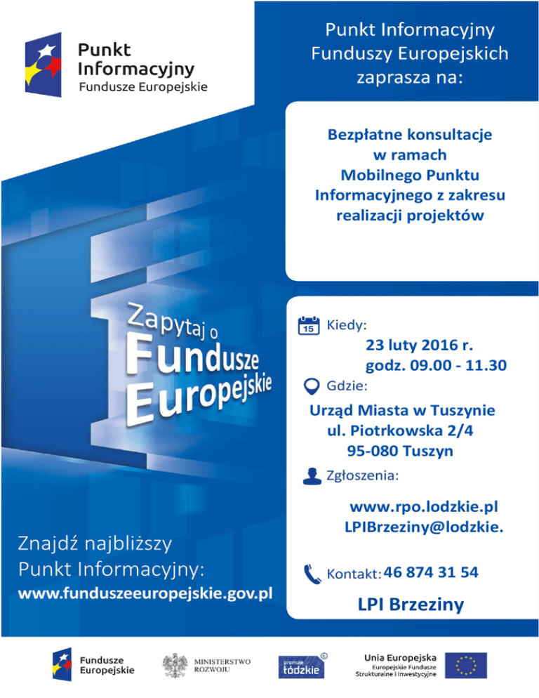 TU Bezpłatne WPISZ TYTUŁkonsultacje w ramach Mobilnego Punktu Informacyjnego z zakresu realizacji projektów dofinansowanych z Funduszy Europejskich 23 luty 2016 r. godz. 09.00 - 11.30 TU WPISZ DATĘ Urząd Miasta TU WPISZ MIEJSCEw Tuszynie ul. Piotrkowska 2/4 95-080 Tuszyn U WPISZ MIEJSCE www.rpo.lodzkie.pl www.rpo.lodzkie.pl LPIBrzeziny@lodzkie. TU WPISZ MAIL pl 46 874 31 54 TU WPISZ TEL LPI Brzeziny TU WPISZ PUNKT
