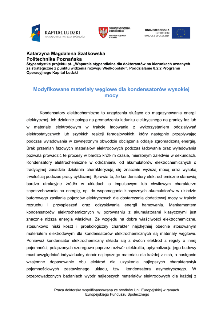 Katarzyna Magdalena Szatkowska Politechnika Poznańska Stypendystka projektu pt. „Wsparcie stypendialne dla doktorantów na kierunkach uznanych za strategiczne z punktu widzenia rozwoju Wielkopolski”, Poddziałanie 8.2.2 Programu Operacyjnego Kapitał Ludzki Modyfikowane materiały węglowe dla kondensatorów wysokiej mocy Kondensatory elektrochemiczne to urządzenia służące do magazynowania energii elektrycznej. Ich działanie polega na gromadzeniu ładunku elektrycznego na granicy faz lub w materiale elektrodowym w trakcie ładowania z wykorzystaniem oddziaływań elektrostatycznych lub szybkich reakcji faradajowskich, który następnie przepływając podczas wyładowania w zewnętrznym obwodzie obciążenia oddaje zgromadzoną energię. Brak przemian fazowych materiałów elektrodowych podczas ładowania oraz wyładowania pozwala prowadzić te procesy w bardzo krótkim czasie, mierzonym zaledwie w sekundach. Kondensatory elektrochemiczne w odróżnieniu od akumulatorów elektrochemicznych o tradycyjnej zasadzie działania charakteryzują się znacznie wyższą mocą oraz wysoką trwałością podczas pracy cyklicznej. Sprawia to, że kondensatory elektrochemiczne stanowią bardzo atrakcyjne źródło w układach o impulsowym lub chwilowym charakterze zapotrzebowania na energię, np. do wspomagania klasycznych akumulatorów w układzie buforowego zasilania pojazdów elektrycznych dla dostarczania dodatkowej mocy w trakcie rozruchu i przyspieszeń oraz odzyskiwania energii hamowania. Mankamentem kondensatorów elektrochemicznych w porównaniu z akumulatorami klasycznymi jest znacznie niższa energia właściwa. Ze względu na dobre właściwości elektrochemiczne, stosunkowo niski koszt i proekologiczny charakter najchętniej obecnie stosowanym materiałem elektrodowym dla kondensatorów elektrochemicznych są materiały węglowe. Ponieważ kondensator elektrochemiczny składa się z dwóch elektrod z reguły o innej pojemności, połączonych szeregowo poprzez roztwór elektrolitu, optymalizacja jego budowy musi uwzględniać indywidualny dobór najlepszego materiału dla każdej z nich, a następnie wzajemne dopasowanie pojemnościowych obu zestawionego elektrod układu, dla uzyskania tzw. najlepszych kondensatora charakterystyk asymetrycznego. W przeprowadzonych badaniach wybór najlepszych materiałów elektrodowych dla każdej z Praca doktorska współfinansowana ze środków Unii Europejskiej w ramach Europejskiego Funduszu Społecznego elektrod kondensatora elektrochemicznego przeprowadzony został spośród wielu różnych węgli aktywnych na podstawie ich charakterystyk pojemnościowych, wyznaczonych w kondensatorze symetrycznym potencjodynamicznej, z zastosowaniem potencjostatycznej oraz metody galwanostatycznej, elektrochemicznej spektroskopii impedancyjnej. Zasadniczym kryterium doboru materiałów, obok ich pojemności właściwej, było uzyskanie wysokiej dynamiki wymiany ładunku dla określonej elektrody. Po zestawieniu kondensatorów asymetrycznych, stosując takie same metody badań elektrochemicznych oraz kryterium maksymalnej dynamiki wymiany ładunku kondensatora elektrochemicznego dopasowano charakterystyki pojemnościowe obu elektrod poprzez dobór mas poszczególnych elektrod. Dalsze badania koncentrowane są na wyznaczaniu i wyjaśnianiu zależności pomiędzy budową fizykochemiczną węgli aktywnych, a ich charakterystyką pojemnościową. Kondensatory elektrochemiczne wykorzystujące węgle aktywne jako materiały elektrodowe są urządzeniami innowacyjnymi, ekologicznymi i stosunkowo tanimi. Ciągły rozwój naszego regionu – Wielkopolski skłania do poszukiwań coraz to nowszych technologii przede wszystkim przyjaznych człowiekowi i środowisku. Urządzenia te mogłyby zostać wykorzystane do zasilania pojazdów, czy podczas pracy dźwigów, żurawi, obniżając koszty i dbając przy tym o środowisko. Mają również bardzo duże znaczenie w budowaniu zintegrowanych systemów zawierających układy fotowoltaiczne lub turbiny wietrzne przy wykorzystaniu energii odnawialnej. Praca doktorska współfinansowana ze środków Unii Europejskiej w ramach Europejskiego Funduszu Społecznego