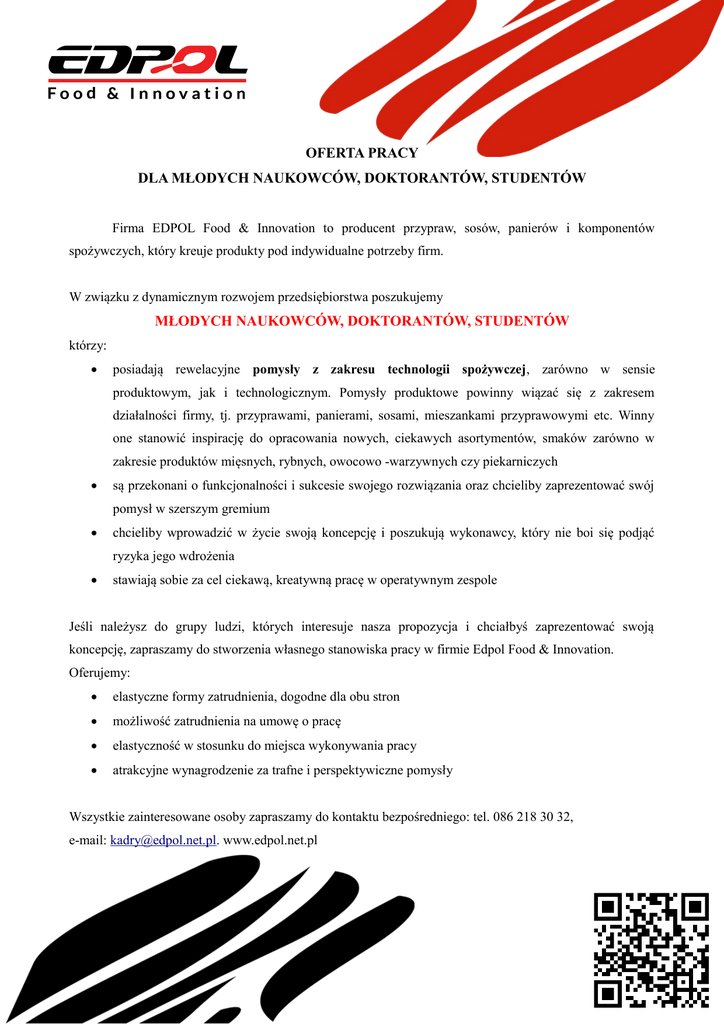 OFERTA PRACY DLA MŁODYCH NAUKOWCÓW, DOKTORANTÓW, STUDENTÓW Firma EDPOL Food & Innovation to producent przypraw, sosów, panierów i komponentów spożywczych, który kreuje produkty pod indywidualne potrzeby firm. W związku z dynamicznym rozwojem przedsiębiorstwa poszukujemy MŁODYCH NAUKOWCÓW, DOKTORANTÓW, STUDENTÓW którzy: posiadają rewelacyjne pomysły z zakresu technologii spożywczej, zarówno w sensie produktowym, jak i technologicznym. Pomysły produktowe powinny wiązać się z zakresem działalności firmy, tj. przyprawami, panierami, sosami, mieszankami przyprawowymi etc. Winny one stanowić inspirację do opracowania nowych, ciekawych asortymentów, smaków zarówno w zakresie produktów mięsnych, rybnych, owocowo -warzywnych czy piekarniczych są przekonani o funkcjonalności i sukcesie swojego rozwiązania oraz chcieliby zaprezentować swój pomysł w szerszym gremium chcieliby wprowadzić w życie swoją koncepcję i poszukują wykonawcy, który nie boi się podjąć ryzyka jego wdrożenia stawiają sobie za cel ciekawą, kreatywną pracę w operatywnym zespole Jeśli należysz do grupy ludzi, których interesuje nasza propozycja i chciałbyś zaprezentować swoją koncepcję, zapraszamy do stworzenia własnego stanowiska pracy w firmie Edpol Food & Innovation. Oferujemy: elastyczne formy zatrudnienia, dogodne dla obu stron możliwość zatrudnienia na umowę o pracę elastyczność w stosunku do miejsca wykonywania pracy atrakcyjne wynagrodzenie za trafne i perspektywiczne pomysły Wszystkie zainteresowane osoby zapraszamy do kontaktu bezpośredniego: tel. 086 218 30 32, e-mail: [email protected]. www.edpol.net.pl