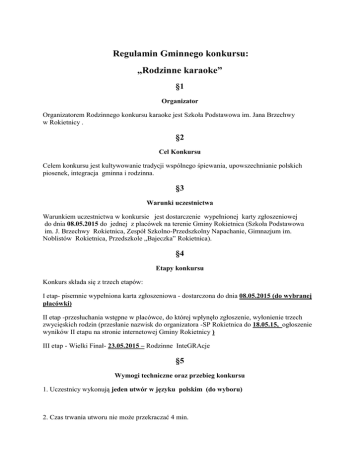 Regulamin Gminnego konkursu: „Rodzinne karaoke” §1 Organizator Organizatorem Rodzinnego konkursu karaoke jest Szkoła Podstawowa im. Jana Brzechwy w Rokietnicy . §2 Cel Konkursu Celem konkursu jest kultywowanie tradycji wspólnego śpiewania, upowszechnianie polskich piosenek, integracja gminna i rodzinna. §3 Warunki uczestnictwa Warunkiem uczestnictwa w konkursie jest dostarczenie wypełnionej karty zgłoszeniowej do dnia 08.05.2015 do jednej z placówek na terenie Gminy Rokietnica (Szkoła Podstawowa im. J. Brzechwy Rokietnica, Zespół Szkolno-Przedszkolny Napachanie, Gimnazjum im. Noblistów Rokietnica, Przedszkole „Bajeczka” Rokietnica). §4 Etapy konkursu Konkurs składa się z trzech etapów: I etap- pisemnie wypełniona karta zgłoszeniowa - dostarczona do dnia 08.05.2015 (do wybranej placówki) II etap -przesłuchania wstępne w placówce, do której wpłynęło zgłoszenie, wyłonienie trzech zwycięskich rodzin (przesłanie nazwisk do organizatora -SP Rokietnica do 18.05.15, ogłoszenie wyników II etapu na stronie internetowej Gminy Rokietnicy ) III etap - Wielki Finał- 23.05.2015 – Rodzinne InteGRAcje §5 Wymogi techniczne oraz przebieg konkursu 1. Uczestnicy wykonują jeden utwór w języku polskim (do wyboru) 2. Czas trwania utworu nie może przekraczać 4 min. 3. Wykonawców oceniać będzie komisja konkursowa, biorąc pod uwagę: - czystość i poprawność wykonania - poczucie rytmu - interpretację - ogólne wrażenie artystyczne - wokalne umiejętności uczestników konkursu 4. Dopuszcza się akompaniament przygotowany we własnym zakresie lub podkład muzyczny na płycie audio CD lub w formacie MP3(bez wokalu!) 5. Gmina zapewnia: §6 Postanowienia Końcowe 1. Organizator zapewnia sobie prawo do ustalenia kolejności wystąpienia wykonawców. 2. Jury III etapu powołuje organizator. 3. Dla zwycięzców III etapu przewiduje się nagrody. 4. Sprawy nie ujęte w regulaminie rozstrzyga organizator. KARTA ZGŁOSZENIA na konkurs karaoke Zgłaszam udział rodziny do konkursu karaoke i zobowiązuję się do przestrzegania regulaminu . 1. NAZWISKO ……………………………………………………………………… 2. IMIONA WYKONAWCÓW ……………………………………………………………………… 4. TELEFON KONTAKTOWY, adres e-mail ……………………………………………………………………… 5. Ilość wykonawców ……………………………………………………………………… 6. Wykonywany utwór : tytuł, oryginalny wykonawca ........................................................................................................ 7. CD lub MP3-dostarczę organizatorowi do 20.05.2015 ....................................................................................................... data --------------------------------------- Podpis wykonawcy -------------------------------------------