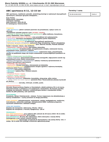 Biuro Podróży WIGRA s.c. ul. Człuchowska 25 01-360 Warszawa Tel. 22 665 06 06, 22 664 94 86, www.wigra.com.pl, e-mail: [email protected] ABC sportowca 6-11, 12-15 lat ABC sportowca, rzeźbienie sylwetki, stretching,treningi w wybranych dyscyplinach sportowych, kolonijne igrzyska olimpijskie... Terminy i cena 05.08-18.08.2015 1540 zł Kraj: Polska Miejscowość: Sianożęty Transport: Autokar Data ważności: 2015-05-20 Nr katalogowy: Kolonie/2015 PROGRAM: * ABC Sportowca: jakimi cechami powinien się prezetować, wpływ ruchu na zdrowie; * Rzeźbienie sylwetki poprzez ruch: aerobik, rytmika; * Treningi w wybranych dyscyplinach sportowych: piłka siatkowa, koszykowa, nożna, badminton, tenis stołowy; * Kroki wykorzystywane w fitnessie oraz prawidłowe ich wykonywanie; * Stretching: ćwiczenia rozciągające poszczególne partie mięśniowe; * Wielka Kolonijna Olimpiada Sportowa; * Znani Polscy sportowcy w wybranych dyscyplinach sportowych; * Kolonijne igrzyska olimpijskie: wykonanie flagi olimpijskiej, medali olimpijskiej; * Wycieczka autokarowa do Kołobrzegu: port, latarnia morska, Pomnik Zaślubin Polski z morzem, ratusz, rejs statkiem; * Plażowanie i kąpiele morskie pod opieką ratownika; * Dzień Indiański: chrakaterystyka, przygotowanie strojów, malowanie twarzy, wymyślanie imion, konkursy i zabawy; * Wyprawa w poszukiwaniu ukrytego skarbu: wykonanie mapy, poszukiwanie skarbu na podstawie mapy lub innych wskazówek w poszczególnych punktach na trasie; * Zajęcia integracyjne teambuilding; * Zajęcia teatralne: opracowanie tematycznej scenografii, odgrywanie scenek wg wymyślonych przez siebie scenariuszy; * Wybory Strongmana i Strongwoman: zabawy i konkursy sprawnościowe w różnych dyscyplinach sportowych; * Podchody i gry terenowe; * Neptunalia- chrzest kolonijny, mianowanie na kolonistę; * Zakręcony pokaz mody-projektowanie strojów zgodnie z wybraną tematyką, stylizacja-dobór fryzur, makijażu; * Ognisko z pieczeniem kiełbasek; * Dyskoteki- wybory Miss i Mistera kolonii; * Karaoke; * Projekcje filmów i bajek; * Konkurs rzeźby z piasku; * Zabawy z chustą klanza; * Rozgrywki sportowe: siatkówka, koszykóka, ping-pong, piłka nożna; * ,,Świat, który nie może zaginąć- poznanie flory i fauny podczas pieszej wycieczki po okolicy; * Gry planszowe: warcaby, chińczyk, scrable, puzle. ZAKWATEROWANIE: Ośrodek Wypoczynkowy Neptun w Sianożętach, obiekt położony 50 m od morza. Zakwaterowanie w pokojach 2,3,4 osobowych z łazienkami. Na terenie ośrodka znajduje się stołówka, świetlice, wielofunkcyjne boisko o standardzie Orlika, boisko do piłki plażowej, sale sportowe. WYŻYWIENIE: Śniadanie, Obiad, Podwieczorek , kolacja. Turnus rozpoczyna się obiadokolacją a kończy śniadaniem + suchy prowiant na drogę powrotną. CENA ZAWIERA: zakwaterowanie, wyżywienie, opieka: pedagogiczna, medyczna, instruktorów, ratownika wodnego, ubezpieczenie NNW, realizacja programu, wycieczki autokarowe z biletami wstępu. CENA NIE ZAWIERA: Dopłata do transportu z Warszawy, Płocka- 150 zł Dopłata do transportu z Torunia, Bydgoszczy- 120 zł PROMOCJE!!! DLA ZDECYDOWANYCH- przy wpłacie 30% zaliczki do 20 marca 2015- 50 zł zniżki; DLA LOJALNYCH KLIENTÓW- 50 zł zniżki; DLA RODZEŃSTW- 50 zł/os dla rodzeństwa, które skorzysta z naszej oferty katalogowej w tym samym sezonie letnim; DLA PRZYJACIÓŁ- zapraszając przyjaciół do skorzystania z tej samej oferty- min. 4 osoby- 50 zł zniżki dla każdego uczestnika zgłoszonej grupy. 1/2 Biuro Podróży WIGRA s.c. ul. Człuchowska 25 01-360 Warszawa Tel. 22 665 06 06, 22 664 94 86, www.wigra.com.pl, e-mail: [email protected] 2/2 Powered by TCPDF (www.tcpdf.org)