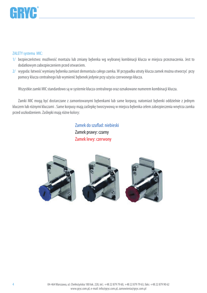 ZALETY systemu MIC: 1/ bezpieczeństwo: możliwość montażu lub zmiany bębenka wg wybranej kombinacji klucza w miejscu przeznaczenia. Jest to dodatkowym zabezpieczeniem przed otwarciem. 2/ wygoda: łatwość wymiany bębenka zamiast demontażu całego zamka. W przypadku utraty klucza zamek można otworzyć przy pomocy klucza centralnego lub wymienić bębenek jedynie przy użyciu czerwonego klucza. Wszystkie zamki MIC standardowo są w systemie klucza centralnego oraz oznakowane numerem kombinacji klucza. Zamki MIC mogą być dostarczane z zamontowanymi bębenkami lub same korpusy, natomiast bębenki oddzielnie z jednym kluczem lub różnymi kluczami . Same korpusy mają zaślepkę tworzywową w miejscu bębenka celem zabezpieczenia wnętrza zamka przed uszkodzeniem. Zaślepki mają różne kolory: Zamek do szuflad: niebieski Zamek prawy: czarny Zamek lewy: czerwony 4 04-464 Warszawa, ul. Chełmżyńska 180 lok. 220, tel.: +48 22 879 79 60, +48 22 879 79 63, faks: +48 22 879 90 62 www.gryc.com.pl, e-mail: [email protected], [email protected] SYSTEM ”MIC” INSTALOWANIE CYLINDRA W ZAMKU Do umieszczenia cylindra w obudowie zamka służy czerwony klucz montażowy. Aby zainstalować cylinder w zamku należy włożyć w cylinder czerwony klucz, umieścić cylinder w korpusie zamka i obrócić klucz o 90°. Po wyjęciu czerwonego klucza montażowego zamek jest gotowy do użycia normalnym kluczem. Aby wymontować cylinder także należy skorzystać z klucza montażowego i postępować w odwrotnej kolejności. Klucz z białą główką jest kluczem serwisowym nazywanym kluczem matka lub dyrektorskim. Służy do otwierania wszystkich zamków z danej grupy bez potrzeby użycia standardowego czarnego kluczyka dostarczanego w komplecie z zamkiem. 04-464 Warszawa, wa, uul. Chełmżyńska 180 lok. 220, tel.: +48 22 879 79 60, +48 22 879 79 63, faks: +48 22 879 79 90 62 www.gryc.com.pl, e-mail: [email protected], [email protected] 5