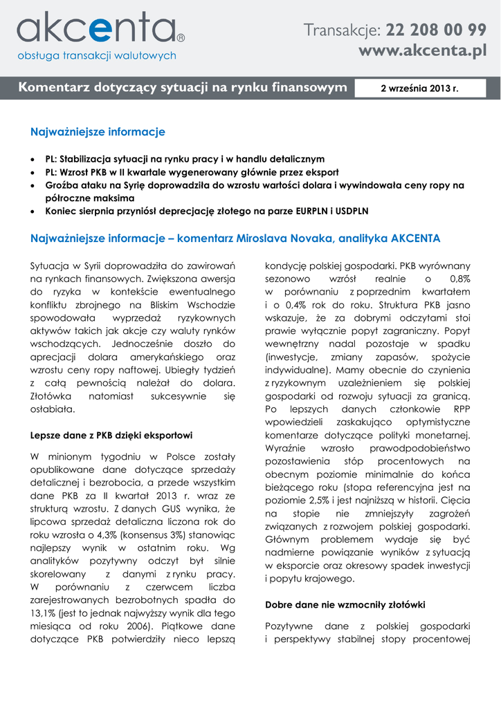 2 września 2013 r. Najważniejsze informacje • • • • PL: Stabilizacja sytuacji na rynku pracy i w handlu detalicznym PL: Wzrost PKB w II kwartale wygenerowany głównie przez eksport Groźba ataku na Syrię doprowadziła do wzrostu wartości dolara i wywindowała ceny ropy na półroczne maksima Koniec sierpnia przyniósł deprecjację złotego na parze EURPLN i USDPLN Najważniejsze informacje – komentarz Miroslava Novaka, analityka AKCENTA Sytuacja w Syrii doprowadziła do zawirowań na rynkach finansowych. Zwiększona awersja do ryzyka w kontekście ewentualnego konfliktu zbrojnego na Bliskim Wschodzie spowodowała wyprzedaż ryzykownych aktywów takich jak akcje czy waluty rynków wschodzących. Jednocześnie doszło do aprecjacji dolara amerykańskiego oraz wzrostu ceny ropy naftowej. Ubiegły tydzień z całą pewnością należał do dolara. Złotówka natomiast sukcesywnie się osłabiała. Lepsze dane z PKB dzięki eksportowi W minionym tygodniu w Polsce zostały opublikowane dane dotyczące sprzedaży detalicznej i bezrobocia, a przede wszystkim dane PKB za II kwartał 2013 r. wraz ze strukturą wzrostu. Z danych GUS wynika, że lipcowa sprzedaż detaliczna liczona rok do roku wzrosła o 4,3% (konsensus 3%) stanowiąc najlepszy wynik w ostatnim roku. Wg analityków pozytywny odczyt był silnie skorelowany z danymi z rynku pracy. W porównaniu z czerwcem liczba zarejestrowanych bezrobotnych spadła do 13,1% (jest to jednak najwyższy wynik dla tego miesiąca od roku 2006). Piątkowe dane dotyczące PKB potwierdziły nieco lepszą kondycję polskiej gospodarki. PKB wyrównany sezonowo wzrósł realnie o 0,8% w porównaniu z poprzednim kwartałem i o 0,4% rok do roku. Struktura PKB jasno wskazuje, że za dobrymi odczytami stoi prawie wyłącznie popyt zagraniczny. Popyt wewnętrzny nadal pozostaje w spadku (inwestycje, zmiany zapasów, spożycie indywidualne). Mamy obecnie do czynienia z ryzykownym uzależnieniem się polskiej gospodarki od rozwoju sytuacji za granicą. Po lepszych danych członkowie RPP wpowiedzieli zaskakująco optymistyczne komentarze dotyczące polityki monetarnej. Wyraźnie wzrosło prawodpodobieństwo pozostawienia stóp procentowych na obecnym poziomie minimalnie do końca bieżącego roku (stopa referencyjna jest na poziomie 2,5% i jest najniższą w historii. Cięcia na stopie nie zmniejszyły zagrożeń związanych z rozwojem polskiej gospodarki. Głównym problemem wydaje się być nadmierne powiązanie wyników z sytuacją w eksporcie oraz okresowy spadek inwestycji i popytu krajowego. Dobre dane nie wzmocniły złotówki Pozytywne dane z polskiej gospodarki i perspektywy stabilnej stopy procentowej paradoksalnie nie wsparły złotego. Złotówka straciła dość wyraźnie. Krajowe dane zostały zignorowane przez inwestorów, a sytuacja na rynku zdominowana przez zamieszanie wokół Syrii oraz lepsze statystyki z USA (HDP, wyprzedzające wskaźniki przemysłowe i zaufanie konsumentów). Złotówka znalazła się nie tylko pod wpływem niesprzyjających czynnikow fundamentalnych ale także technicznych. Para EUR/PLN przekroczyła w środę opór 4,26 by zatrzymać się na poziomie 4,30. W czwartek i piątek straty zostały nieznacznie odrobione, co nie zmienia jednka faktu, że z tygodniowej perspektywy kurs EUR/PLN wzrósł aż do poziomów z połowy lipca. Złoty stracił wobec dolara, para USD/PLN była kwotowana powyżej 3,20 (najsłabszy wynik pod połowy lipca). Deprecjacja waluty krajowej nastąpiła także na parach CHF/PLN, GPB/PLN i CZK/PLN. Na głównej parze walutowej euro zaliczyło spadek poniżej miesięcznych minimów, oscylując na poziomie 1,32. Wszystko wskazuje na to, że wakacyjna aprecjacja eura dobiega końca, a EUR/USD będzie się w najbliższych tygodniach zmierzać do poziomu 1,30 i niżej. Dobre odczyty z USA zwiększają prawodpodobieństwo redukcji QE3 na wrześniowym posiedzeniu FED. Istnieje także ryzyko wojskowej interwencji w Syrii i coraz silniejszych napięć na Bliskim Wschodzie. A w tym tygodniu... ...kalendarz makroekonomiczny jest stosunkowo pełny. W środę odbędzie się posiedzenie RPP, na którym nie dojdzie do zmiany poziomu stopy. Z podobną sytuacją będziemy mieli do czynienia w czwartek podczas posiedzenia EBC. Kluczowe znaczenie będą mieć dane z USA (index ISM, bezrobocie i NFP). Warto śledzić rozwój sytuacji w Syrii, która oddziaływuje na wartość dolara.