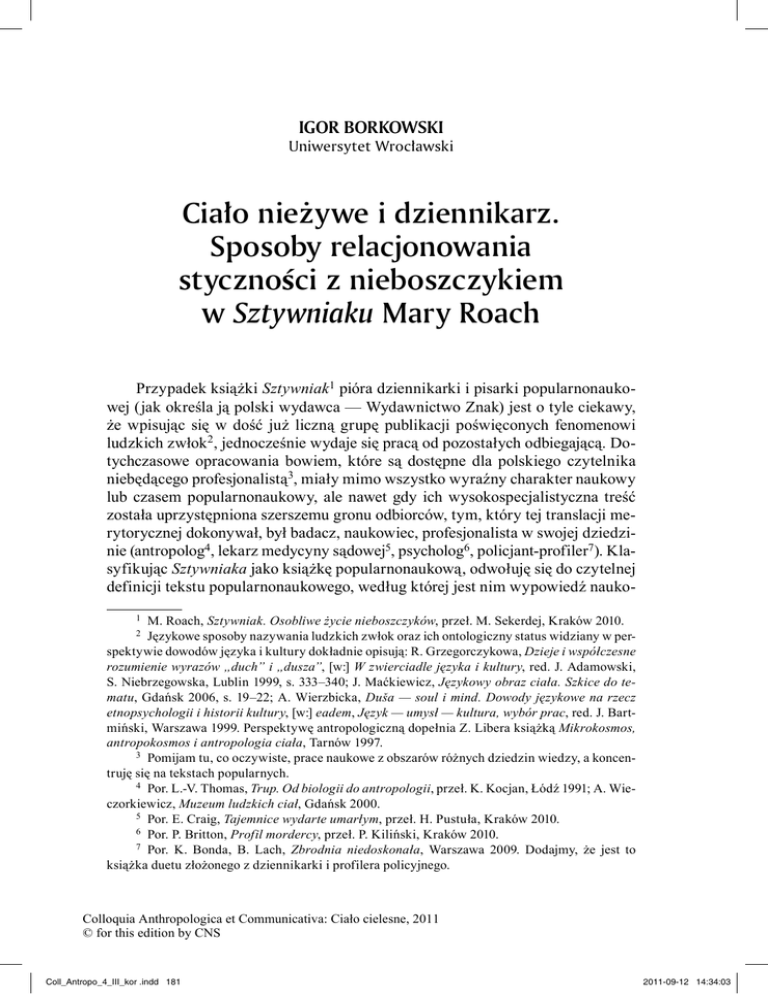 IGOR BORKOWSKI Uniwersytet Wroc³awski Cia³o nie¿ywe i dziennikarz. Sposoby relacjonowania stycznoœci z nieboszczykiem w Sztywniaku Mary Roach Przypadek książki Sztywniak1 pióra dziennikarki i pisarki popularnonaukowej (jak określa ją polski wydawca — Wydawnictwo Znak) jest o tyle ciekawy, że wpisując się w dość już liczną grupę publikacji poświęconych fenomenowi ludzkich zwłok2, jednocześnie wydaje się pracą od pozostałych odbiegającą. Dotychczasowe opracowania bowiem, które są dostępne dla polskiego czytelnika niebędącego profesjonalistą3, miały mimo wszystko wyraźny charakter naukowy lub czasem popularnonaukowy, ale nawet gdy ich wysokospecjalistyczna treść została uprzystępniona szerszemu gronu odbiorców, tym, który tej translacji merytorycznej dokonywał, był badacz, naukowiec, profesjonalista w swojej dziedzinie (antropolog4, lekarz medycyny sądowej5, psycholog6, policjant-profiler7). Klasyfikując Sztywniaka jako książkę popularnonaukową, odwołuję się do czytelnej definicji tekstu popularnonaukowego, według której jest nim wypowiedź nauko1 M. Roach, Sztywniak. Osobliwe życie nieboszczyków, przeł. M. Sekerdej, Kraków 2010. Językowe sposoby nazywania ludzkich zwłok oraz ich ontologiczny status widziany w perspektywie dowodów języka i kultury dokładnie opisują: R. Grzegorczykowa, Dzieje i współczesne rozumienie wyrazów „duch” i „dusza”, [w:] W zwierciadle języka i kultury, red. J. Adamowski, S. Niebrzegowska, Lublin 1999, s. 333–340; J. Maćkiewicz, Językowy obraz ciała. Szkice do tematu, Gdańsk 2006, s. 19–22; A. Wierzbicka, Duša — soul i mind. Dowody językowe na rzecz etnopsychologii i historii kultury, [w:] eadem, Język — umysł — kultura, wybór prac, red. J. Bartmiński, Warszawa 1999. Perspektywę antropologiczną dopełnia Z. Libera książką Mikrokosmos, antropokosmos i antropologia ciała, Tarnów 1997. 3 Pomijam tu, co oczywiste, prace naukowe z obszarów różnych dziedzin wiedzy, a koncentruję się na tekstach popularnych. 4 Por. L.-V. Thomas, Trup. Od biologii do antropologii, przeł. K. Kocjan, Łódź 1991; A. Wieczorkiewicz, Muzeum ludzkich ciał, Gdańsk 2000. 5 Por. E. Craig, Tajemnice wydarte umarłym, przeł. H. Pustuła, Kraków 2010. 6 Por. P. Britton, Profil mordercy, przeł. P. Kiliński, Kraków 2010. 7 Por. K. Bonda, B. Lach, Zbrodnia niedoskonała, Warszawa 2009. Dodajmy, że jest to książka duetu złożonego z dziennikarki i profilera policyjnego. 2 Colloquia Anthropologica et Communicativa: Ciało cielesne, 2011 © for this edition by CNS Coll_Antropo_4_III_kor .indd 181 2011-09-12 14:34:03 182 IGOR BORKOWSKI wa pod względem treści, a jednocześnie popularna w zakresie formy i kształtu językowego wysłowienia8. Dla Anny Starzec przyczyn przemian dających się obserwować w popularyzacji [nauki — I.B.] należy zatem szukać nie na płaszczyźnie intencji, lecz w sferze wykonania, to jest w większej rozmaitości działań przystosowujących problematykę naukową do poziomu odbiorcy oraz intensywnością tych zabiegów9. Tak właśnie rzecz ma się z pisarstwem Mary Roach10. Spotykamy się w nim nie tylko z popularnym w formie przedstawieniem samego problemu ludzkich zwłok i ich pośmiertnych przemian, ale i z nowym statusem autorskim. Oto do przedstawienia czytelnikom „dziwacznych, często szokujących, ale niezmiennie fascynujących wyczynów zwłok” przystępuje dziennikarka. Jej status w narracji jest więc podwójny: jest z jednej strony jedną z nas — nieprofesjonalistów zainteresowanych tematem, ale jednocześnie w jakiś sposób do pełnego i otwartego kontaktu z obiektem naszej fascynacji nieprzygotowanych. Ma więc w sobie, tak jak czytelnicy książki, głębokie pokłady lęków, uprzedzeń, awersji. Tak jak oni nawykła jest do tabuizowania obszaru zjawisk związanych z pośmiertnymi kolejami losu ludzkich szczątków11. Z drugiej strony Mary Roach jako dziennikarka ma możliwości warsztatowe pozwalające jej stanąć oko w oko z problemem, który zapewne przerósłby wielu z czytelników jej tekstów, oswoić go i w taki sposób przedstawić, by był akceptowalny przez grono laików, osłabić jego moc rażenia. Tekst pióra Amerykanki wpisuje się w dość już ugruntowaną tradycję wytworów o charakterze popularnonaukowym, w których pierwotna instancja nadawcza (specjalista) najpierw przekazuje informacje dziennikarzowi (niespecjaliście, pośrednikowi), a dopiero ten buduje tekst zaadresowany do szerokiego kręgu odbiorców (niespecjalistów)12. Wyjątkowość polega na kompletności tekstu (nie jest to praca przyczynkarska, lecz całościowa) i na wyborze tematu, o czym jeszcze będzie mowa. 8 M. Piechota, Literatura popularnonaukowa, [w:] Leksykon szkolny. Gatunki paraliterackie, publicystyczne i użytkowe, red. M. Pytosz, Gorzów Wielkopolski 1993. 9 A. Starzec, Przemiany w popularyzacji prasowej, [w:] O trudnym łatwo. Materiały sesji poświęconej popularyzacji nauki, red. J. Miodek, M. Zaśko-Zielińska, Wrocław 2002, s. 27. 10 Polski czytelnik może już zapoznać się z całym jej cyklem wędrówek po świecie nauki i jego obrzeżach: Sztywniak. Osobliwe życie nieboszczyków; Duch. Nauka na tropie życia pozagrobowego; Bzyk. Pasjonujące zespolenie nauki i seksu (wszystkie w polskim przekładzie M. Sekerdeja opublikowało w 2010 roku Wydawnictwo Znak). 11 Odnośnie do sposobów negatywnego reagowania na trupa zob. L.-V. Thomas, op. cit., s. 52–77. Na temat tego, kto się boi trupa, zob. A. Wieczorkiewicz, op. cit., s. 262–269. Por. także J.-Th. Maertens, Nad otwartym grobem. Semiotyka zmarłego, [w:] Wymiary śmierci, wybór i słowo wstępne S. Rosiek, Gdańsk 2002, s. 267–274. 12 To oczywiście komplikuje obowiązującą do niedawna klasyfikację, w której wyróżnikiem tekstu popularnonaukowego było ukształtowanie „przez relację specjalista–niespecjalista”. Por. S. Gajda, Styl naukowy, [w:] Wspó
