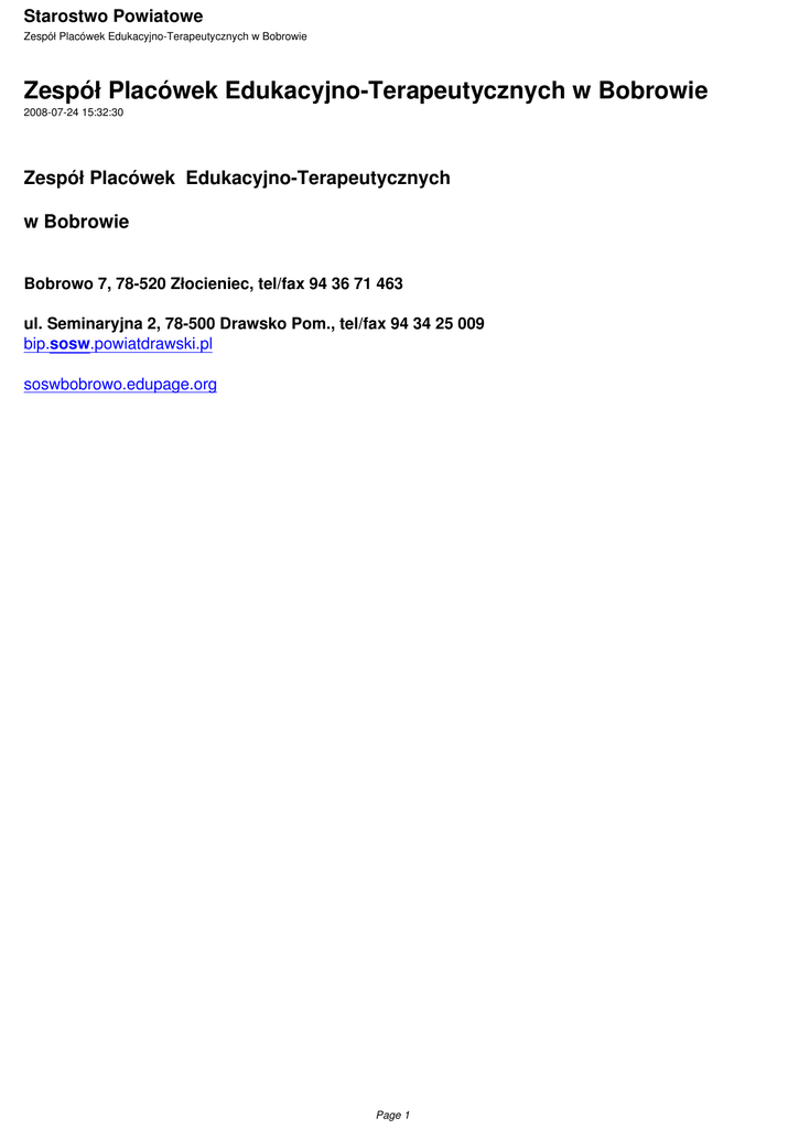 Starostwo Powiatowe Zespół Placówek Edukacyjno-Terapeutycznych w Bobrowie Zespół Placówek Edukacyjno-Terapeutycznych w Bobrowie 2008-07-24 15:32:30 Zespół Placówek Edukacyjno-Terapeutycznych w Bobrowie Bobrowo 7, 78-520 Złocieniec, tel/fax 94 36 71 463 ul. Seminaryjna 2, 78-500 Drawsko Pom., tel/fax 94 34 25 009 bip.sosw.powiatdrawski.pl soswbobrowo.edupage.org Page 1