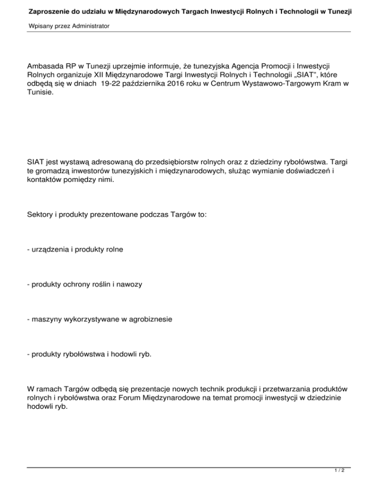 Zaproszenie do udziału w Międzynarodowych Targach Inwestycji Rolnych i Technologii w Tunezji Wpisany przez Administrator Ambasada RP w Tunezji uprzejmie informuje, że tunezyjska Agencja Promocji i Inwestycji Rolnych organizuje XII Międzynarodowe Targi Inwestycji Rolnych i Technologii „SIAT”, które odbędą się w dniach 19-22 października 2016 roku w Centrum Wystawowo-Targowym Kram w Tunisie. SIAT jest wystawą adresowaną do przedsiębiorstw rolnych oraz z dziedziny rybołówstwa. Targi te gromadzą inwestorów tunezyjskich i międzynarodowych, służąc wymianie doświadczeń i kontaktów pomiędzy nimi. Sektory i produkty prezentowane podczas Targów to: - urządzenia i produkty rolne - produkty ochrony roślin i nawozy - maszyny wykorzystywane w agrobiznesie - produkty rybołówstwa i hodowli ryb. W ramach Targów odbędą się prezentacje nowych technik produkcji i przetwarzania produktów rolnych i rybołówstwa oraz Forum Międzynarodowe na temat promocji inwestycji w dziedzinie hodowli ryb. 1/2 Zaproszenie do udziału w Międzynarodowych Targach Inwestycji Rolnych i Technologii w Tunezji Wpisany przez Administrator Firmy zainteresowane bezpośrednim udziałem w Targach lub zaprezentowaniem swoich produktów w formie próbek bądź folderów reklamowych prosimy o kontakt z Ambasadą na adres mailowy: [email protected] Więcej informacji dostępnych jest na stronie internetowej Organizatora www.siat.tn Załącznik 2/2