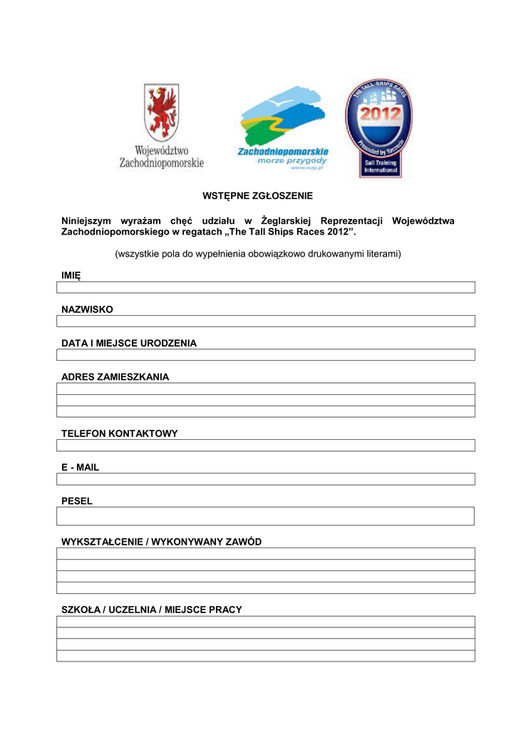 WSTĘPNE ZGŁOSZENIE Niniejszym wyrażam chęć udziału w Żeglarskiej Reprezentacji Województwa Zachodniopomorskiego w regatach „The Tall Ships Races 2012”. (wszystkie pola do wypełnienia obowiązkowo drukowanymi literami) IMIĘ NAZWISKO DATA I MIEJSCE URODZENIA ADRES ZAMIESZKANIA TELEFON KONTAKTOWY E - MAIL PESEL WYKSZTAŁCENIE / WYKONYWANY ZAWÓD SZKOŁA / UCZELNIA / MIEJSCE PRACY ZNAJOMOŚĆ JĘZYKÓW OBCYCH (JĘZYK/STOPIEŃ ZNAJOMOŚCI) DOŚWIADCZENIE ŻEGLARSKIE (STOPIEŃ ŻEGLARSKI, ODBYTE REJSY) INNE UMIEJĘTNOŚCI (ARTYSTYCZNE, SPORTOWE, ITP.) MOJE MOCNE STRONY DANE KONTAKTOWE DO RODZICÓW/OPIEKUNÓW/INNYCH OSÓB PRZYJMOWANE LEKI WYBÓR ETAPU* STS „Fryderyk Chopin” Termin Dni Koszt Opłata 04.07. - 28.07. 25 4900 2450 Etap II: Kadyks – Porto – A Coruña 28.07. –12.08. 16 3700 1850 Etap III: A Coruña –Dublin 12.07. – 26.08. 15 3500 1750 Etap I: Saint Malo – Lizbona – Kadyks DANE DOTYCZĄCE UBIORU** S M L * należy zaznaczyć krzyżykiem wybrany etap rejsu. ** należy zakreślić odpowiedni rozmiar XL XXL UWAGA! Komisja Kwalifikacyjna nie jest zobowiązana do podania przyczyn odrzucenia danej kandydatury do Żeglarskiej Reprezentacji Województwa Zachodniopomorskiego. Komisja Kwalifikacyjna z przyczyn organizacyjnych może zaproponować inny przydział na jednostkę lub termin niż zadeklarowany przez kandydata. Postanowienia Komisji są ostateczne. ZGODA OPIEKUNA Wyrażam zgodę na udział…………………………………………………… w Żeglarskiej Reprezentacji Województwa Zachodniopomorskiego w regatach „The Tall Ships Races 2012”. ....................................... miejscowość i data …………………………………… czytelny podpis OPINIA SZKOŁY …………………………………………………………………………………………………………… …………………………………………………………………………………………………………. …………………………………………………………………………………………………………… …………………………………………………………………………………………………………… …………………………………………………………………………………………………………. ....................................... miejscowość i data …………………………………… czytelny podpis WYWIAD LEKARSKI (do wypełnienia przez lekarza rodzinnego) Żeglarska Reprezentacja Województwa Zachodniopomorskiego w regatach „The Tall Ships Races 2012” CZY CIERPI PAN/PANI NA KTÓRĄŚ Z PONIŻSZYCH CHORÓB? (właściwe zaznaczyć): nowotwory, choroby krwi i układu chłonnego Tak Nie choroby układu nerwowego: ośrodkowego (np. epilepsja), obwodowego i narządów zmysłów Tak Nie choroby psychiczne: schizofrenia, stany paranoidalne, psychozy, nerwice Tak Nie nadciśnienie, choroba wieńcowa, niewydolność serca, gorączka reumatyczna, choroby żył i inne choroby układu krążenia Tak Nie astma oskrzelowa, gruźlica, inne choroby płuc Tak Nie choroby wrzodowe układu pokarmowego Tak Nie przepukliny, choroby wątroby i dróg żółciowych (np. kamica), inne choroby układu pokarmowego Tak Nie choroby nerek (np. kamica), gruczołu sterczowego (prostaty) i inne choroby układu moczowo-płciowego Tak Nie złamania, reumatoidalne zapalenie stawów, choroby zwyrodnieniowe układu kostnego, inne schorzenia kości, mięśni i stawów Tak Nie schorzenia tarczycy, cukrzyca, dna moczanowa, inne schorzenia metaboliczne i hormonalne Tak Nie choroby laryngologiczne (np. zatok, uszu) Tak Nie alergie (np. pokarmowe, skórne, katar sienny, inne) choroby skóry Tak inne: jeżeli tak, to jakie: Tak Nie Nie Tak Nie CZY PRZYJMUJE PAN/PANI JAKIEŚ LEKI? JEŻELI TAK, TO JAKIE I NA JAKIE SCHORZENIE? Tak Nie CZY W OKRESIE OSTATNICH 6 MIESIĘCY BYŁ PAN/PANI HOSPITALIZOWANY? JEŻELI TAK, TO Z JAKIEJ PRZYCZYNY? Tak Nie OPINIA LEKARSKA Zaświadczam, że zgodnie z załączonym wywiadem nie ma przeciwwskazań do udziału ……………………………………………… w rejsach morskich na jachtach i żaglowcach. imię i nazwisko ....................................... miejscowość i data …………………………………… czytelny podpis ZGODA NA PRZETWARZANIE DANYCH OSOBOWYCH Wyrażam zgodę na wprowadzenie do bazy danych i przetwarzanie moich danych osobowych obecnie i w przyszłości przez Województwo Zachodniopomorskie oraz Gminę Miasto Szczecin i jego jednostki organizacyjne, w tym Centrum Żeglarskie (zgodnie z przepisami ustawy z dnia 29 sierpnia 1997 r. o ochronie danych osobowych- Dz. U. Nr 101 z 2002 r. poz. 926 z późniejszymi zmianami )- w celach związanych z rekrutacją i utworzeniem Żeglarskiej Reprezentacji Województwa Zachodniopomorskiego w regatach The Tall Ships Races 2012. Wyrażam zgodę na wykorzystanie nieodpłatne mojego wizerunku dla potrzeb promocyjnych Województwa Zachodniopomorskiego oraz Gminy Miasto Szczecin oraz jego jednostek organizacyjnych. REGULAMIN Jeżeli zostanę powołany w poczet reprezentacji, zobowiązuję się do systematycznego uczestniczenia w programie przygotowań, oraz przestrzegania zasad obowiązujących w Centrum Żeglarskim, oraz na jednostce, do której będę przypisany. Jednocześnie przyjmuję do wiadomości, że w przypadku nie podporządkowania się obowiązującym zasadom, mogę zostać skreślony z listy reprezentacji wraz z utratą całkowitą lub częściową poniesionych kosztów. Do moich obowiązków należeć będzie obsługa stoiska promocyjnego Województwa Zachodniopomorskiego w portach regat The Tall Ships Races 2012. Płatności: Płatność za udział w Reprezentacji WojewództwaZachodniopomorskiego na The Tall Ships Races należy uiścić w trzech ratach na konto Centrum Żeglarskiego: PEKAO S.A. 64 1240 3927 1111 0010 2185 6777. W tytule przelewu należy podać imię i na