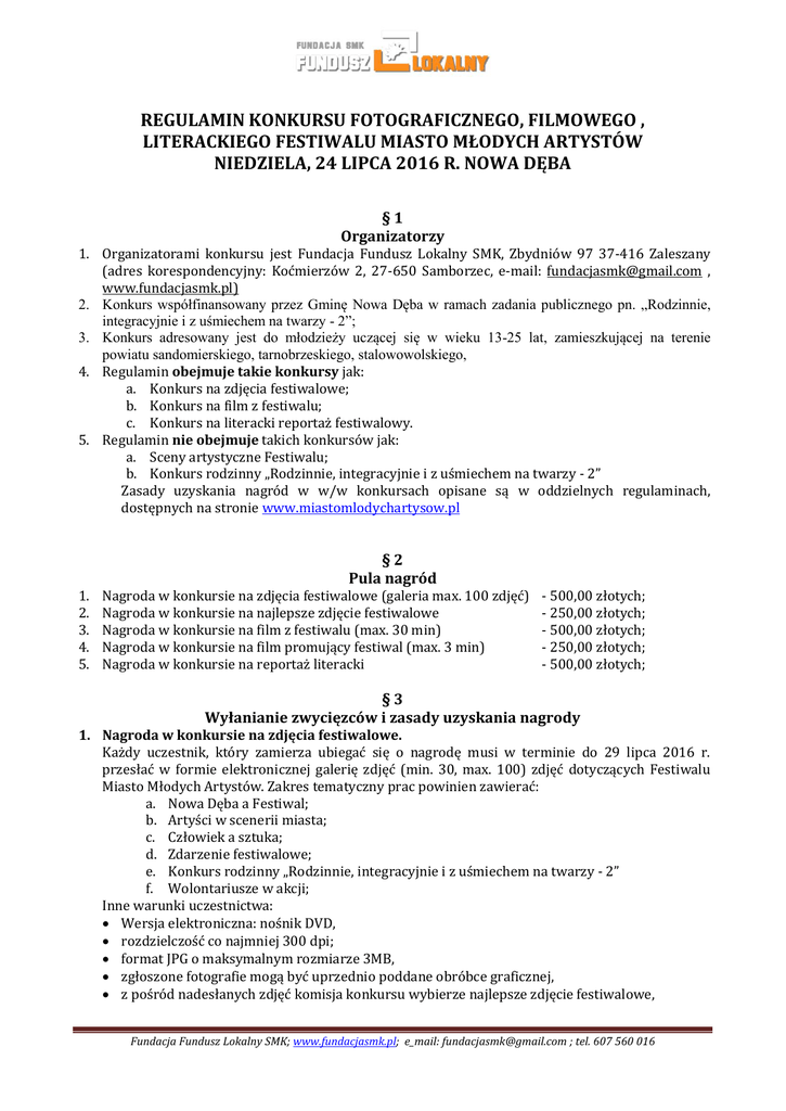 REGULAMIN KONKURSU FOTOGRAFICZNEGO, FILMOWEGO , LITERACKIEGO FESTIWALU MIASTO MŁODYCH ARTYSTÓW NIEDZIELA, 24 LIPCA 2016 R. NOWA DĘBA §1 Organizatorzy 1. Organizatorami konkursu jest Fundacja Fundusz Lokalny SMK, Zbydniów 97 37-416 Zaleszany (adres korespondencyjny: Koćmierzów 2, 27-650 Samborzec, e-mail: [email protected] , www.fundacjasmk.pl) 2. Konkurs współfinansowany przez Gminę Nowa Dęba w ramach zadania publicznego pn. „Rodzinnie, integracyjnie i z uśmiechem na twarzy - 2”; 3. Konkurs adresowany jest do młodzieży uczącej się w wieku 13-25 lat, zamieszkującej na terenie powiatu sandomierskiego, tarnobrzeskiego, stalowowolskiego, 4. Regulamin obejmuje takie konkursy jak: a. Konkurs na zdjęcia festiwalowe; b. Konkurs na film z festiwalu; c. Konkurs na literacki reportaż festiwalowy. 5. Regulamin nie obejmuje takich konkursów jak: a. Sceny artystyczne Festiwalu; b. Konkurs rodzinny „Rodzinnie, integracyjnie i z uśmiechem na twarzy - 2” Zasady uzyskania nagród w w/w konkursach opisane są w oddzielnych regulaminach, dostępnych na stronie www.miastomlodychartysow.pl 1. 2. 3. 4. 5. §2 Pula nagród Nagroda w konkursie na zdjęcia festiwalowe (galeria max. 100 zdjęć) Nagroda w konkursie na najlepsze zdjęcie festiwalowe Nagroda w konkursie na film z festiwalu (max. 30 min) Nagroda w konkursie na film promujący festiwal (max. 3 min) Nagroda w konkursie na reportaż literacki - 500,00 złotych; - 250,00 złotych; - 500,00 złotych; - 250,00 złotych; - 500,00 złotych; §3 Wyłanianie zwycięzców i zasady uzyskania nagrody 1. Nagroda w konkursie na zdjęcia festiwalowe. Każdy uczestnik, który zamierza ubiegać się o nagrodę musi w terminie do 29 lipca 2016 r. przesłać w formie elektronicznej galerię zdjęć (min. 30, max. 100) zdjęć dotyczących Festiwalu Miasto Młodych Artystów. Zakres tematyczny prac powinien zawierać: a. Nowa Dęba a Festiwal; b. Artyści w scenerii miasta; c. Człowiek a sztuka; d. Zdarzenie festiwalowe; e. Konkurs rodzinny „Rodzinnie, integracyjnie i z uśmiechem na twarzy - 2” f. Wolontariusze w akcji; Inne warunki uczestnictwa: Wersja elektroniczna: nośnik DVD, rozdzielczość co najmniej 300 dpi; format JPG o maksymalnym rozmiarze 3MB, zgłoszone fotografie mogą być uprzednio poddane obróbce graficznej, z pośród nadesłanych zdjęć komisja konkursu wybierze najlepsze zdjęcie festiwalowe, Fundacja Fundusz Lokalny SMK; www.fundacjasmk.pl; e_mail: [email protected] ; tel. 607 560 016 galeria zdjęć opisana (opis dotyczy jakie to wydarzenie, kto jest organizatorem, kto jest autorem zdjęć) zamieszczona przez autora na portalu społecznościowym Przystępując do Konkursu każdy uczestnik oświadcza, że jest autorem zdjęć, przysługują mu prawa autorskie do nadesłanych zdjęć i nie są one ograniczone lub obciążone prawami osób trzecich, oraz że nie naruszają praw osób trzecich. 2. Nagroda w konkursie na film z festiwalu. Każdy uczestnik, który zamierza ubiegać się o nagrodę musi w terminie do 12 sierpnia 2016 r. przesłać w formie elektronicznej film nie dłuższy niż 30 min dotyczący Festiwalu Miasto Młodych Artystów oraz lub film promujący Festiwal nie dłuższy niż 3 min. Zakres tematyczny prac powinien zawierać: a. Nowa Dęba a Festiwal; b. Artyści w scenerii miasta; c. Człowiek a sztuka; d. Zdarzenie festiwalowe; e. Konkurs rodzinny „Rodzinnie, integracyjnie i z uśmiechem na twarzy - 2” f. Wolontariusze w akcji; Inne warunki uczestnictwa: jakość filmu powinna zachować rozdzielczość minimalną 640/480, dopuszczone są filmy z telefonów komórkowych pod warunkiem dobrej jakości materiału, film powinien być dostarczony w formacie CD/DVD lub w wersji elektronicznej pozwalającej na odtworzenie filmu w komputerach (formaty mp4, mpeg, avi, mov, Przystępując do Konkursu każdy uczestnik oświadcza, że jest autorem filmu, przysługują mu prawa autorskie do nadesłanych zdjęć i nie są one ograniczone lub obciążone prawami osób trzecich, oraz że nie naruszają praw osób trzecich. Każdy zgłoszony film musi zostać zamieszczone na wybranym portalu społecznościowym i wraz ze zgłoszeniem należy podać link do strony z filmem. 3. Nagroda w konkursie na literacki reportaż festiwalowy. Każdy uczestnik, który zamierza ubiegać się o nagrodę musi w terminie do 12 sierpnia 2016 przesłać w formie elektronicznej reportaż literacki dotyczący Festiwalu Miasto Młodych Artystów. Zakres tematyczny prac powinien zawierać: a. Nowa Dęba a Festiwal; b. Artyści w scenerii miasta; c. Człowiek a sztuka; d. Zdarzenie festiwalowe; e. Konkurs rodzinny „Rodzinnie, integracyjnie i z uśmiechem na twarzy - 2” f. Wolontariusze w akcji; Inne warunki uczestnictwa: każdy uczestnik konkursu może nadesłać tylko jedną pracę w dowolnie wybranej formie (opowiadanie, nowela, reportaż, esej, wywiad, kartka z pamiętnika, wiersz, etc. ), nadesłany utwór musi być sporządzoną w języku polskim pracą własną, wcześniej niepublikowaną i nienagradzaną w innych konkursach. nie może w żadnej swojej części stanowić plagiatu, być kopią lub fragmentem jakichkolwiek innych utworów, praca konkursowa nie może przekroczyć 5 stron maszynopisu znormalizowanego (czcionka – 12, interlinia 1,5). Przystępując do Konkursu każdy uczestnik oświadcza, że jest autorem pracy, przysługują mu prawa autorskie i nie są one ograniczone lub obciążone prawami osób trzecich, oraz że nie naruszają praw osób trzecich. Każda zgłoszona praca musi zostać zamieszczona na wybranym portalu społecznościowym i wraz ze zgłoszeniem należy podać link do strony z reportażem. Fundacja Fundusz Lokalny SMK; www.fundacjasmk.pl; e_mail: [email protected] ; tel. 607 560 016 §5 Postanowienia końcowe 1. Regulamin znajduje się do wglądu w siedzibie Biura Festiwalowego (Koćmierzów 2, 27 – 650 Samborzec) i na stronie internetowej www.fundacjasmk.pl 2. Udział w konkursie jest ró