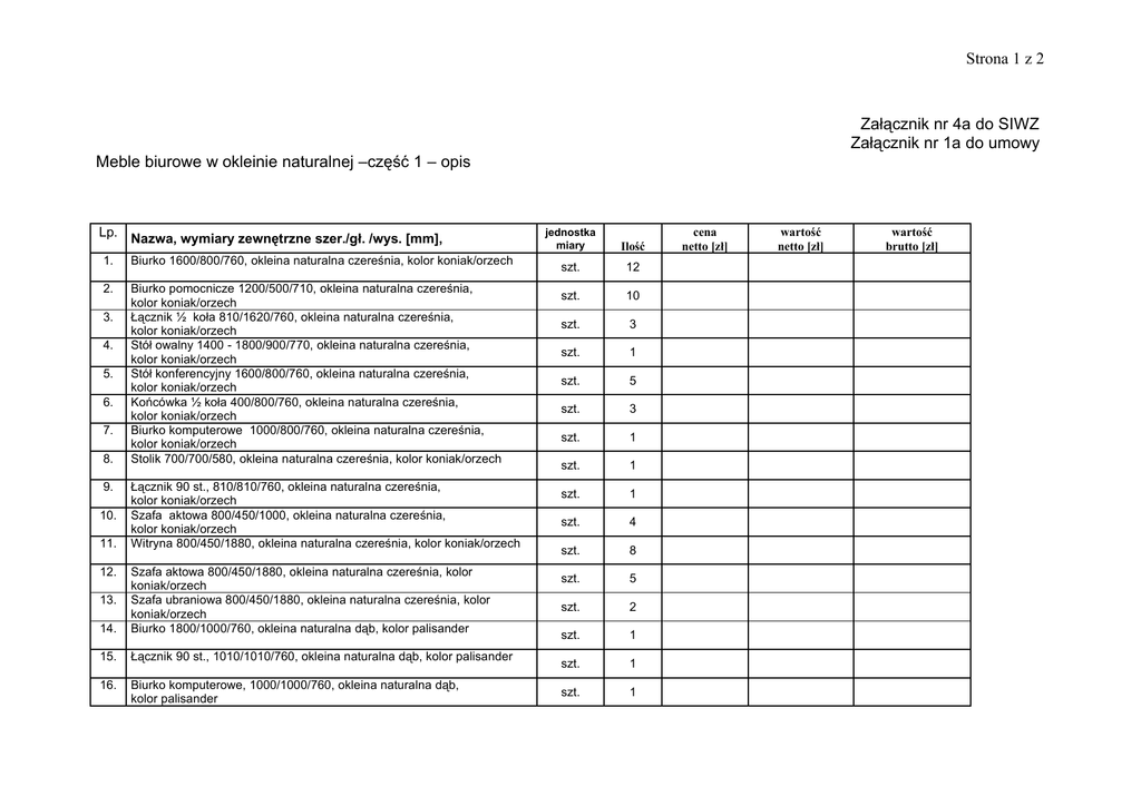Strona 1 z 2 Załącznik nr 4a do SIWZ Załącznik nr 1a do umowy Meble biurowe w okleinie naturalnej –część 1 – opis Lp. Nazwa, wymiary zewnętrzne szer./gł. /wys. [mm], 1. Biurko 1600/800/760, okleina naturalna czereśnia, kolor koniak/orzech 2. Biurko pomocnicze 1200/500/710, okleina naturalna czereśnia, kolor koniak/orzech Łącznik ½ koła 810/1620/760, okleina naturalna czereśnia, kolor koniak/orzech Stół owalny 1400 - 1800/900/770, okleina naturalna czereśnia, kolor koniak/orzech Stół konferencyjny 1600/800/760, okleina naturalna czereśnia, kolor koniak/orzech Końcówka ½ koła 400/800/760, okleina naturalna czereśnia, kolor koniak/orzech Biurko komputerowe 1000/800/760, okleina naturalna czereśnia, kolor koniak/orzech Stolik 700/700/580, okleina naturalna czereśnia, kolor koniak/orzech 3. 4. 5. 6. 7. 8. 9. 10. 11. 12. Łącznik 90 st., 810/810/760, okleina naturalna czereśnia, kolor koniak/orzech Szafa aktowa 800/450/1000, okleina naturalna czereśnia, kolor koniak/orzech Witryna 800/450/1880, okleina naturalna czereśnia, kolor koniak/orzech 14. Szafa aktowa 800/450/1880, okleina naturalna czereśnia, kolor koniak/orzech Szafa ubraniowa 800/450/1880, okleina naturalna czereśnia, kolor koniak/orzech Biurko 1800/1000/760, okleina naturalna dąb, kolor palisander 15. Łącznik 90 st., 1010/1010/760, okleina naturalna dąb, kolor palisander 16. Biurko komputerowe, 1000/1000/760, okleina naturalna dąb, kolor palisander 13. jednostka miary Ilość szt. 12 szt. 10 szt. 3 szt. 1 szt. 5 szt. 3 szt. 1 szt. 1 szt. 1 szt. 4 szt. 8 szt. 5 szt. 2 szt. 1 szt. 1 szt. 1 cena netto [zł] wartość netto [zł] wartość brutto [zł] Strona 2 z 2 17. 18. 19. 20. Stół konferencyjny 1800/1000/760, okleina naturalna dąb, kolor palisander Końcówka ½ koła 500/1000/760, okleina naturalna dąb, kolor palisander Drzwi przesuwane dwuskrzydłowe 700 – 700, okleina naturalna Zabudowa kuchni: szafki górne i dolne, okleina naturalna szt. 1 szt. szt. szt. 2 1 1 Razem wartość brutto =