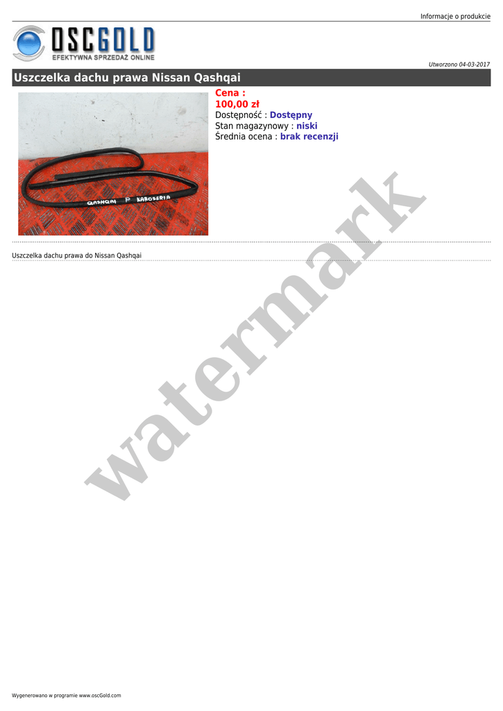 Informacje o produkcie Utworzono 04-03-2017 Uszczelka dachu prawa Nissan Qashqai Cena : 100,00 zł er m ar k Dostępność : Dostępny Stan magazynowy : niski Średnia ocena : brak recenzji w at Uszczelka dachu prawa do Nissan Qashqai Wygenerowano w programie www.oscGold.com